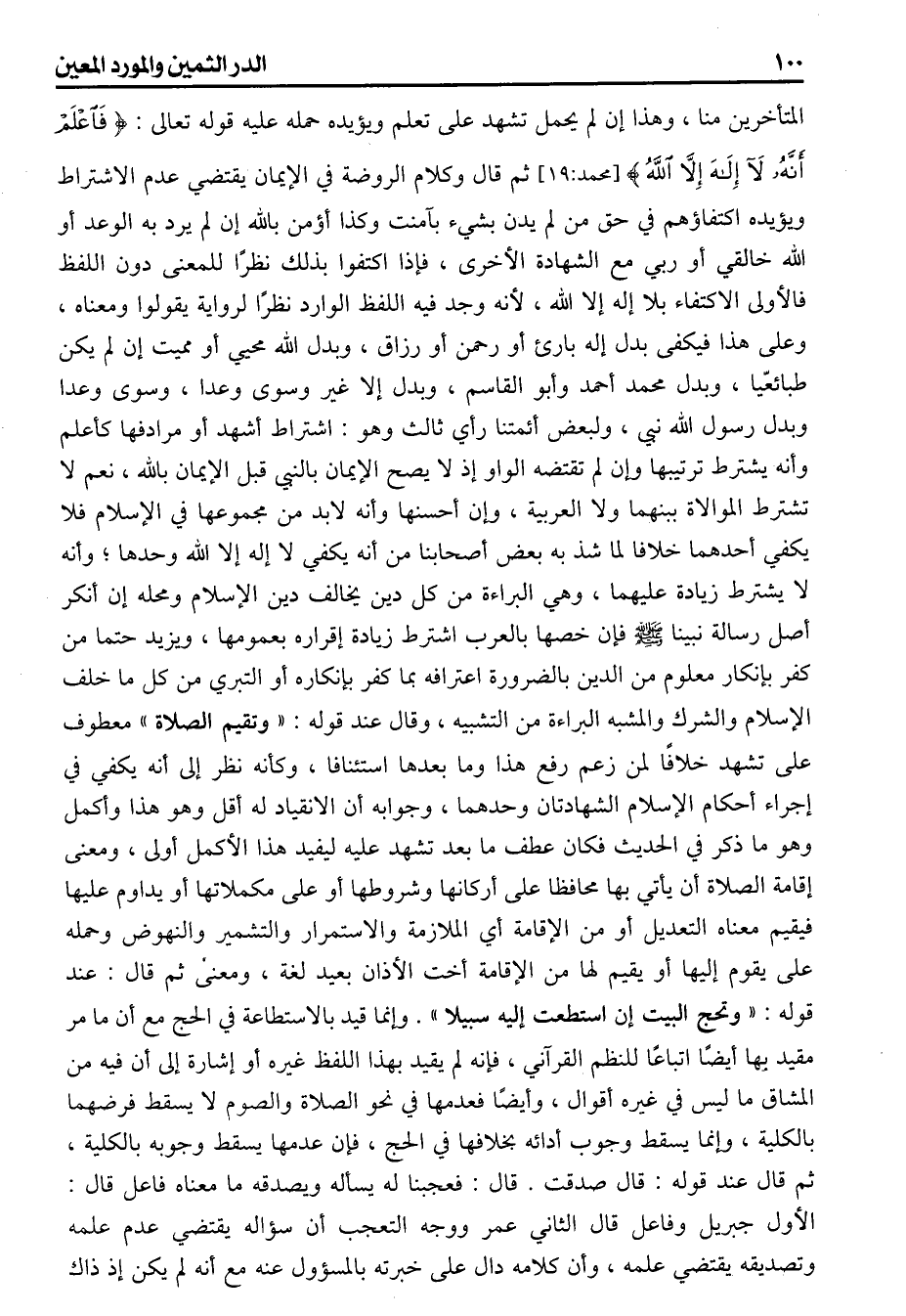 المتأخرين منا وهذا إن لم يحمل تشهد على تعلم ويؤيده حمله عليه قوله تعالى {فاعلم أنه لا إله إلا الله} ثم قال وكلام الروضة في الإيمان يقتضي عدم الاشتراط ويؤيده اكتفاؤهم في حق من لم يدن بشيء بآمنت وكذا أؤمن بالله إن لم يرد به الوعد أوالله خالقي أوربي مع الشهادة الأخرى فإذا اكتفوا بذلك نظراً للمعنى دون اللفظ فالأولى الاكتفاء بلا إله إلا الله لأنه وجد فيه اللفظ الوارد نظراً لرواية يقولوا ومعناه وعلى هذا فيكفى بدل إله بارىء أو رحمن أو رزاق وبدل الله محيي أومميت إن لم يكن طبائعيا وبدل محمد أحمد ووأبوالقاسم وبدل إلا غير وسوى وعدا وسوى وعدا وبدل رسول الله نبي ولبعض أئمتنا رأي ثالث وهو اشتراط أشهد أومرادفها كأعلم وأنه يشترط ترتيبها وإن لم تقتضه الواو إذ لا يصح الإيمان بالنبي قبل الإيمان بالله نعم لا تشترط الموالاة ببنهما ولا العربية وإن أحسنها وأنه لابد من مجموعها في الإسلام فلا يكفي أحدهما خلافا لما شذ به بعض أصحابنا من أنه يكفي لا إله إلا الله وحدها وأنه لايشترط زيادة عليهما وهي البراءة من كل دين يخالف دين الإسلام ومحله إن أنكر أصل رسالة نبينا فإن خصها بالعرب اشترط زيادة إقراره بعمومها ويزيد حتما من كفر بإنكار معلوم من الدين بالضرورة اعترافه بما كفر بإنكاره أوالتبري من كل ما خلف الإسلام والشرك والمشبه البراءة من التشبيه وقال عند قوله وتقيم الصلاة معطوف على تشهد خلافا لمن زعم رفع هذا وما بعده استئنافا وكأنه نظر إلى أنه يكفي في إجراء أحكام الإسلام الشهادتان وحدهما وجوابه أن الانقياد له أقل وهو هذا وأكمل وهو ما ذكر في الحديث فكان عطف ما بعد تشهد عليه ليفيد هذا الأكمل أولى ومعنى إقامة الصلاة أن يأتي بها محافظا على أركانها وشروطها أوعلى مكملاتها أو يداوم عليها فيقيم معناه التعديل أومن الاقامة أي الملازمة والاستمرار والتشمير والنهوض وحمله على يقوم إليها أويقيم لها من الإقامة أخت الأذان بعيد لغة ومعنى ثم قال عند قوله (وتحج البيت إن استطعت إليه سبيلا) وإنما قيد بالاستطاعة في الحج مع أن مامر مقيد بها أيضا اتباعا للنظم القرآني فإنه لم يقيد بهذا اللفظ غيره أو إشارة إلى أن فيه من المشاق ما ليس في غيره أقوال وأيضاً فعدمها في نحو الصلاة والصوم لا يسقط فرضهما بالكلية وإنما يسقط وجوب أدائه بخلافها في الحج فإن عدمها يسقط وجوبه بالكلية ثم قال عند قوله قال صدقت قال فعجبنا له يسأله ويصدقه ما معناه فاعل قال الأول جبريل وفاعل قال الثاني عمر ووجه التعجب أن سؤاله يقتضي عدم علمه وأن كلامه دال على خبرته بالمسؤول عنه مع أنه لم يكن إذ ذاك