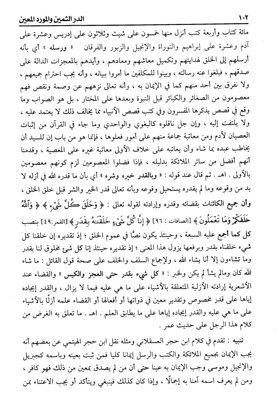مائة كتاب وأربعة كتب أنزل منها خمسون على شيث وثلاثون على إدريس وعشرة على آدم وعشرة على إبراهيم والتوراة والإنجيل والزبور والفرقان ورسله أي بأنه أرسلهم إلى الخلق لهدايتهم وتكميل معاشهم ومعادهم وأيدهم بالمعجزات الدالة على صدقهم فبلغوا عنه رسالته وبينوا للمكلفين ما أمروا ببيانه وأنه يجب احترام جميعهم ولا نفرق بين أحد منهم كما في الإيمان به وأنه تعالى نزههم عن وصمة ونقص فهم معصومون من الصغائر والكبائر قبل النبوة وبعدها على المختار بل هو الصواب وما وقع في قصص يذكرها المفسرون وفي كتب قصص الأنبياء مما يخالف ذلك لا يعتمد عليه ولا يلتفت إليه وإن جل كالبغوي والواحدي وما جاء في القرآن من إثبات العصيان لآدم ومن معاتبة جماعة منهم على أمور فعلوها فإنما هو من باب إن للسيد أن يخاطب عبده بما شاء وأن يعاتبه على خلاف الأولى معاتبة غيره على المعصية وقدمنا أنهم أفضل من سائر الملائكة بدليله فإذا فضلوا المعصومين لزم كونهم معصومين بالأولى اهـ ثم قال عند قوله وبالقدر خيره وشره أي بأن ما قدره الله في أزله لابد من وقوعه ومالم يقدره يستحيل وقوعه وبأنه تعالى قدر الخير والشر قبل خلق الخلق وأن جميع الكائنات بقضائه وقدره وإرادته لقوله تعالى (خلق كل شيء) (والله خلقكم وما تعملون) (انا كل شىء خلقناه بقدر) بنصب كل كما أجمع عليه السبعة وحينئذ يكون نصا في عموم الخلق إذ تقديره إن خلقنا كل شيء خلقناه بقدر وبرفعها يزول هذا المعنى إذ تقديره حينئذ إنا كل مخلوق لنا بقدر وما تشاءون إلا أنا يشاء الله ولاجماع السلف والخلف على صحة قول القائل: (ما شاء الله كان ومالم يشأ لم يكن) ولخبر (كل شيء بقدر حتى العجز والكيس) والقضاء عند الأشعرية إرادته الأزلية المتعلقة بالأشياء على ما هي عليه فيما لا يزال والقدر إيجاده اياها على قدر مخصوص وتقدير معين في ذواتها أوأفعالها أوالقضاء علمه أزلاً بالأشياء على ما هي عليه والقدر إيجاده إياها على ما يطابق العلم اهـ ما تعلق به الغرض من كلام هذا الرجل على حديث عمر (تنبيه) تقدم في كلام ابن حجر العسقلاني ومثله نقل ابن حجر الهيتمي عن بعضهم أنه يجب الإيمان بجميع الملائكة والكتب والرسل إيمانا كليا فمن ثبت بعينه وباسمه كجبريل والإنجيل وموسى وجب الإيمان به عينا حتى أن من لم يصدق بمعين من ذلك فهو كافر ومن لم يعرف اسمه آمنا به إجمالا وإذا كان كذلك فينبغي ويتأكد أو يجب الاعتناء بمن
