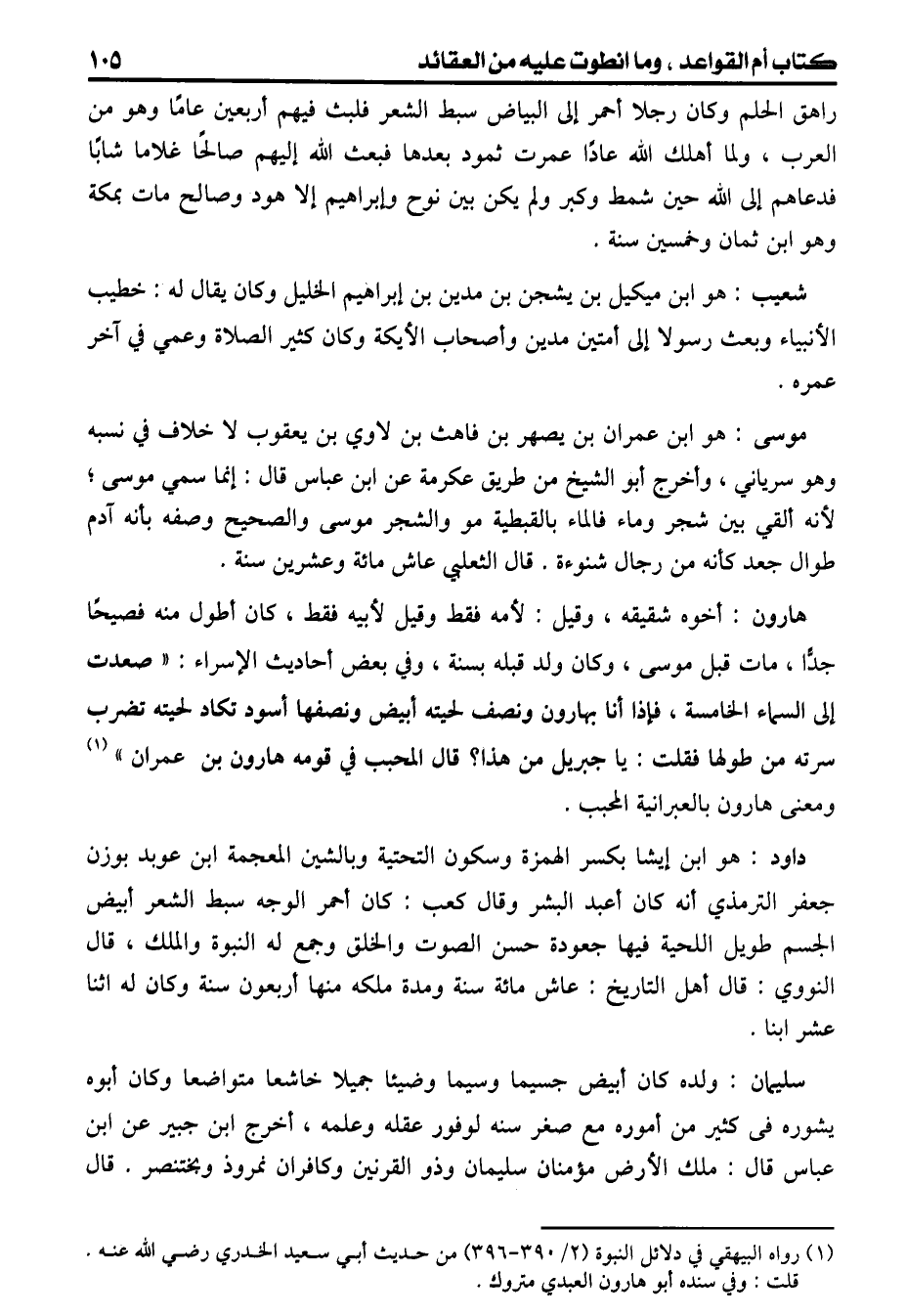 راهق الحلم وكان رجلا أحمر إلى البياض سبط الشعر فلبث فيهم أربعين عاما وهو من العرب ولما أهلك الله عاداً عمرت ثمود بعدها فبعث الله إليهم صالحاً غلاما شاباً فدعاهم إلى الله حين شمط وكبر ولم يكن بين نوح وإبراهيم إلا هود وصالح مات بمكة وهو ابن ثمان وخمسين سنة (شعيب) هو ابن ميكيل بن يشجن بن مدين بن إبراهيم الخليل وكان يقال له خطيب الأنبياء وبعث رسولا إلى أمتين مدين وأصحاب الأيكة وكان كثير الصلاة وعمي في آخر عمره (موسى) هو ابن عمران بن يصهر بن فاهث بن لاوي بن يعقوب لا خلاف في نسبه وهو سرياني وأخرج أبوالشيخ من طريق عكرمة عن ابن عباس قال إنما سمي موسى لأنه ألقي بين شجر وماء فالماذ بالقبطية مو والشجر سىء والصحيح وصفه بأنه آدم طوال جعد كأنه من رجال شنوءة قال الثعلبي عاش مائة وعشرين سنة (هرون) أخوه شقيقه وقيل لأمه فقط وقيل لأبيه فقط كان أطول منه فصيحاً جدا مات قبل موسى وكان ولد قبله بسنة وفي بعض أحاديث الإسراء صعدت إلى السماء الخامسة فإذا أنا بهارون ونصف لحيته أبيض ونصفها أسود تكاد لحيته تضرب سرته من طولها فقلت ياجبريل من هذا قال المحبب في قومه هرون بن عمران ومعنى هرون بالعبرانية المحبب (داود) هو ابن إيشا بكسر الهمزة وسكون التحية وبالشين المعجمة ابن