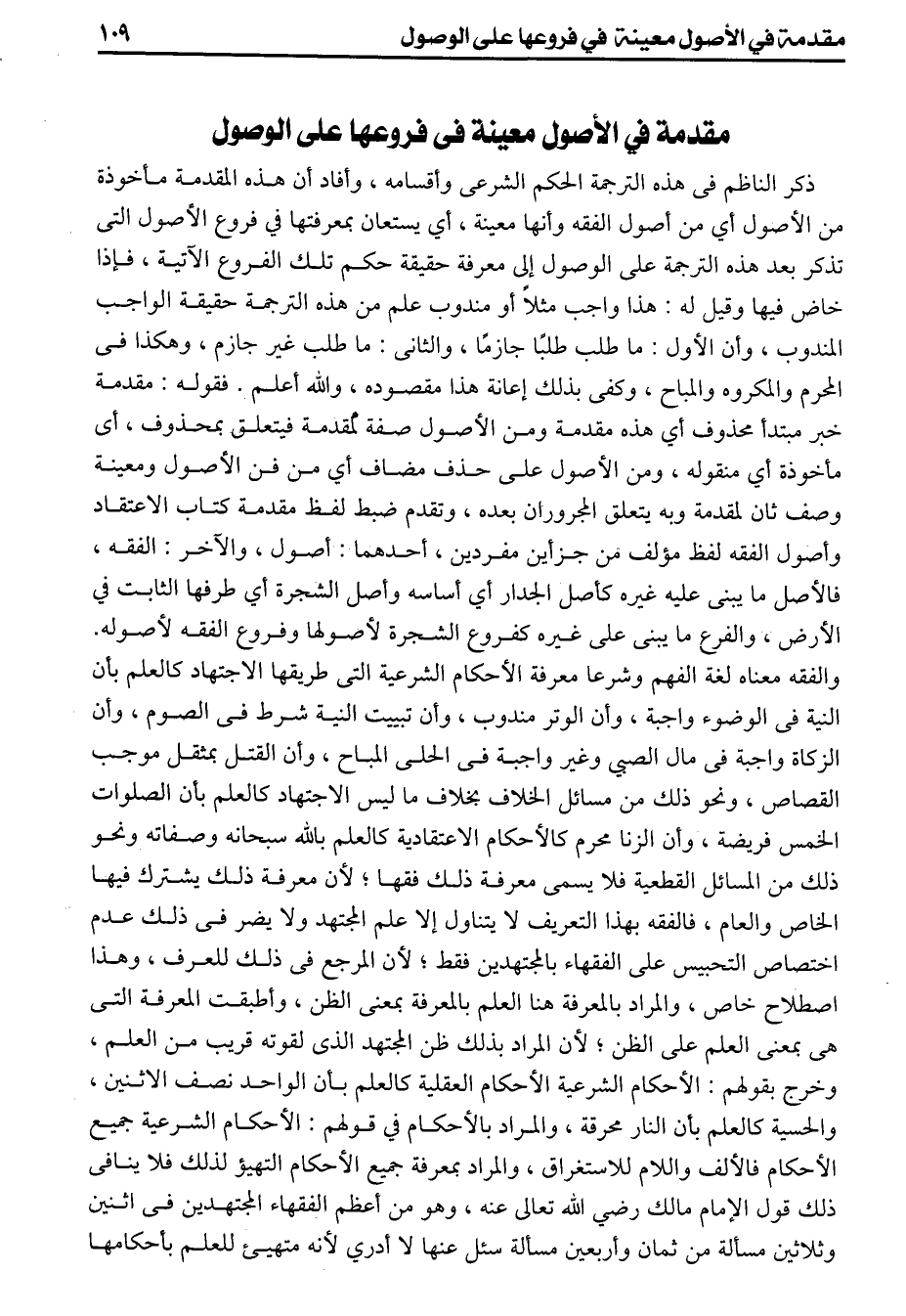 ذكر الناظم فى هذه الترجمة الحكم الشرعى وأقسامه وأفاد أن هذه المقدمة مأخوذة من الأصول أي من أصول الفقه وأنها معينة أي يستعان بمعرفتها في فروع الأصول التى تذكر بعد هذه الترجمة على الوصول إلى معرفة حقيقة حكم تلك الفروع الآتية فإذا خاض فيها وقيل له هذا واجب مثلا أومندوب علم من هذه الترجمة حقيقة الواجب المندوب وأن الأول ما طلب طلبا جازما والثانى ما طلب غير جازم وهكذا فى المحرم والمباح وكفى بذلك إعانة هذا مقصوده والله أعلم فقوله مقدمة خبر مبتدأ محذوف أي هذه مقدمة ومن الأصول صفة لمقدمة فيتعلق بمحذوف أى مأخوذه أي منقوله ومن الأصول على حذف مضاف أي من فن الأصول ومعينة وصف ثان لمقدمة وبه يتعلق المجروران بعده وتقدم ضبط لفظ مقدمة كتاب الاعتقاد وأصول الفقه لفظ مؤلف من جزأين مفردين أحدهما أصول والآخر الفقه فالأصل ما يبنى عليه غيره كأصل الجدار أي أساسه وأصل الشجرة أي طرفها الثابت في الأرض والفرع ما يبنى على غيره كفروع الشجرة لأصولها وفروع الفقه لأصوله. والفقه معناه لغة الفهم وشرعا معرفة الأحكام الشرعية التى طريقها الاجتهاد كالعلم بأن النية فى الوضوء واجبة وأن الوتر مندوب وأن تبييت النية شرط فى الصوم وأن الزكاة واجبة فى مال الصبي وغير واجبة فى الحلى المباح وأن القتل بمثقل موجب القصاص ونحو ذلك من مسائل الخلاف بخلاف ماليس الاجتهاد كالعلم بأن الصلوات الخمس فريضة وأن الزنا محرم كالأحكام الاعتقادية كالعلم بالله سبحانه وصفاته ونحو ذلك من المسائل القطعية فلا يسمى معرفة ذلك فقها لأن معرفة ذلك يشترك فيها الخاص والعام فالفقه بهذا التعريف لا يتناول إلا علم المجتهد ولا يضر فى ذلك عدم اختصاص التحبيس على الفقهاء بالمجتهدين فقط لأن المرجع فى ذلك للعرف وهذا اصطلاح خاص والمراد بالمعرفة هنا العلم بالمعرفة بمعنى الظن وأطلعت المعرفة التى هى بمعنى العلم على الظن لأن المراد بذلك ظن المجتهد الذى لقوته قريب من العلم وخرج بقولهم الأحكام الشرعية الأحكام العقلية كالعلم بأن الواحد نصف الاثنين والحسية كالعلم بأن النار محرقة والمراد بالاحكام في قولهم الأحكام الشرعية جميع الأحكام فالألف واللام للاستغراق والمراد بمعرفة جميع الاحكام التهيؤ لذلك فلا ينافى ذلك قول الإمام مالك رضي الله تعالى عنه وهو من أعظم الفقهاء المجتهدين فى اثنين وثلاثين مسئلة من ثمان وأربعين مسئلة سئل عنها لا أدري لأنه متهيء للعلم بأحكامها