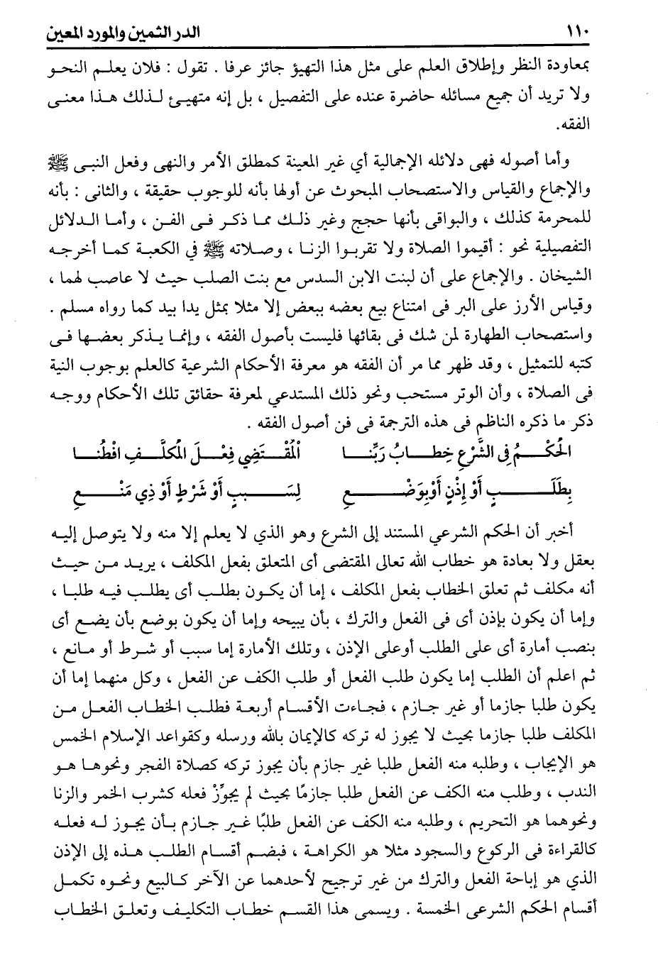 بمعاودة النظر وإطلاق العلم على مثل هذا التهيؤ جائز عرفا تقول فلان يعلم النحو ولا تريد أن جميع مسائله حاضرة عنده على التفصيل بل إنه متهيء لذلك هذا معنى الفقه. (تنكيت) الذى فى أصل النظم واستيعاب مسح الأذنين وهو شامل للصماخين كما قال الناظم فيدخله الخلاف وهو كذلك لكن فيه نظر لما ذكرناه عن شارح الجلاب من الاتفاق على سنية مسح الصماخين هذا وقد عد فى أصل النظم من المتفق عليه مسح الأذنين ثم ذكر هنا أن المختلف فيه استيعاب مسحهما فجعلهما فى الأصل مسئلتين والله أعلم (تكميل) اختلف فى ظاهرهما وباطنهما فقيل ظاهرهما مما يلى الرأس وباطنهما مما يلي الوجه وقيل ظاهرهما ما يواجه قال في الذخيرة ابتدأ خلقتهما منغلقتين كزر الورد فإذا كمل خلقهما انفتحا على الرأس فالظاهر للحس الآن كان باطنا أولا والباطن كان ظاهرا فهل يعتبر حال الابتداء عملا بالاستصحاب أوحال الانتهاء لأنه الواقع حال ورود الخطاب وصفة مسحهما أن يجعل باطن الإبهامين على ظاهر الشحمتين ويمرهما للآخر وآخر السبابتين فى الصماخين ووسطهما ملاقيا للباطن دائرين مع الإبهامين قال ابن شاس وأما أصوله فهى دلائله الإجمالية أي غير المعينة كمطلق الأمر والنهى وفعل النبى والإجماع والقياس والاستصحاب المبحوث عن أولها بأنه للوجوب حقيقة والثانى بأنه للمحرمة كذلك والبواقى بأنها حجج وغير ذلك مما ذكر فى الفن وأما الدلائل التفصيلية نحو (أقيموا الصلاة) (ولا تقربوا الزنا) وصلاته في الكعبة كما أخرجه الشيخان والإجماع على أن لبنت الابن السدس مع بنت الصلب حيث لا عاصب لهما وقياس «الأرز على البر فى امتناع بيع بعضه ببعض إلا مثلا بمثل يدا بيد» كما رواه مسلم واستصحاب الطهارة لمن شك فى بقائها فليست بأصول الفقه وإنما يذكر بعضها فى كتبه للتمثيل وقد ظهر مما مر أن الفقه هو معرفة الأحكام الشرعية كالعلم بوجوب النية فى الصلاة وأن الوتر مستحب ونحو ذلك المستدعي لمعرفة حقائق تلك الأحكام ووجه ذكر ما ذكره الناظم فى هذه الترجمة فى فن أصول الفقه