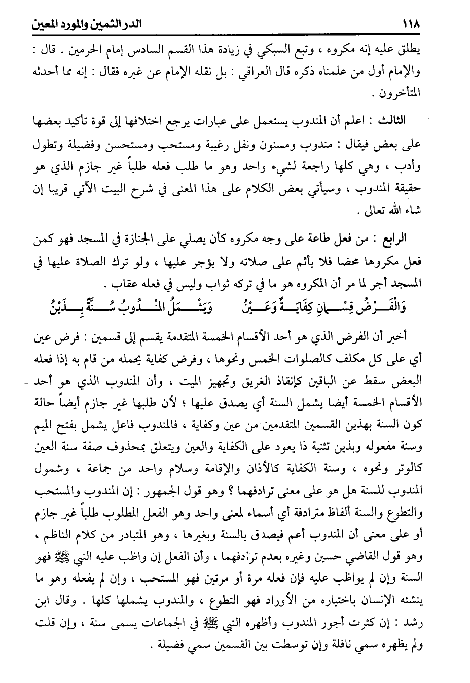 يطلق عليه إنه مكروه وتبع السبكي في زيادة هذا القسم السادس إمام الحرمين قال والإمام أول من علمناه ذكره قال العراقي بل نقله الإمام عن غيره فقال إنه مما أحدثه المتأخرون (الثالث) اعلم أن المندوب يستعمل على عبارات يرجع اختلافها إلى قوة تأكيد بعضها على بعض فقال مندوب ومسنون ونفل ورغبية ومستحب ومستحسن وفضيلة وتطول وأدب وهي كلها راجعة لشيء واحد وهو ما طلب فعله طلباً غير جازم الذي هو حقيقة المندوب وسيأتي بعض الكلام على هذا المعنى في شرح البيت الآتي قريبا إن شاء الله تعالى (الرابع) من فعل طاعة على وجه مكروه كإن يصلي على الجنازة في المسجد فهو كمن فعل مكروها محضا فلا يأثم على صلاته ولا يؤجر عليها ولو ترك الصلاة عليها في المسجد أجر لما مر أن المكروه هو ما في تركه ثواب وليس في فعله عقاب