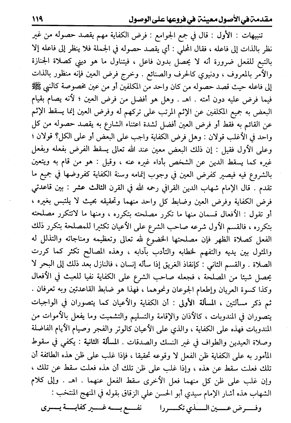 (تنبيهات) الأول قال في جمع الجوامع فرض الكفاية مهم يقصد حصوله من غير نظر بالذات إلى فاعله فقال المحلي أي يقصد حصوله في الجملة فلا ينظر إلى فاعله إلا بالتبع للفعل ضرورة أنه لا يحصل بدون فاعل فيتناول ما هو ديني كصلاة الجنازة والأمر بالمعروف ودنيوي كالحرف والصنائع وخرج فرض العين فانه منظور بالذات إلى فاعله حيث قصد حصوله من كان واحد من المكلفين أو من عين مخصوصة كالنبي فيما فرض عليه دون أمته اهـ. وهل هو أفضل من فرض العين لأنه يصام بقيام البعض به جميع المكلفين عن الإثم المرتب على تركهم له وفرض العين إنما يسقط الإثم عن القائم به فقط أو فرض العين أفضل لشدة اعتناء الشارع به يقصد حصوله من كل واحد في الأغلب قولان وهل فرض الكفاية واجب على البعض أو على الكل قولان وعلى الأول فقيل إن ذلك البعض معين عند الله تعالى يسقط الفرض بفعله وبفعل غيره كما يسقط الدين عن الشخص بأداء غيره عنه وقيل هو من قام به ويتعين بالشروع فيه فيصير كفرض العين في وجوب إتمامه وسنة الكفاية كفروضها في جميع ما تقدم قال الإمام شهاب الدين القرافي رحمه الله في القرن الثالث عشر بين قاعدتي فرض الكفاية وفرض العين وظابط كل واحد منهما وتحقيقه بحيث لا يلتبس بغيره أن تقول الأفعال قسمان منها ما تكرر مصلحته بتكرره ومنها ما لاتتكرر مصلحته بتكرره فالقسم الأول شرعه صاحب الشرع على الأعيان تكثيرا للمصلحة بتكرر ذلك الفعل كصلاة الظهر فإن مصلحتها الخضوع لله تعالى وتعظيمه ومناجاته والتذلل له والمثول بين يديه والتفهم لخطابه والتأدب بآدابه وهذه المصالح تكثر كما كررت الصلاة والقسم الثاني كانقاذ الغريق إذا سأله إنسان فالنازل بعد ذلك إلى البحر لا يحصل شيئا من المصلحة فجعله صاحب الشرع على الكفاية نفيا للعبث في الأفعال وكذا كسوة العريان وإطعام الجوعان ونحوهما فهذا هو ضابط القاعدتين وبه تعرفان. ثم ذكر مسألتين المسألة الأولى أن الكفاية والأعيان كما يتصوران في الواجبات يتصوران في المندوبات كالأذان والإقامة والتسليم والتشميت وما يفعل بالأموات من المندوبات فهذه على الكفاية والذي على الأعيان كالوتر والفجر وصيام الأيام الفاضلة وصلاة العيدين والطواف في غير النسك والصدقات المسألة الثانية يكفي في سقوط المأمور به على الكفاية ظن الفعل لا وقوعه تحقيقا فإذا غلب على ظن هذه الطائفة أن تلك فعلت سقط عن هذه وإذا غلب على ظن تلك أن هذه فعلت سقط عن تلك وإن غلب على ظن كل منهما فعل الأخرى سقط الفعل عنهما اهـ. وإلى كلام الشهاب هذه أشار الإمام سيدي أبو الحسن علي الزقاق بقوله في المنهج المنتخب