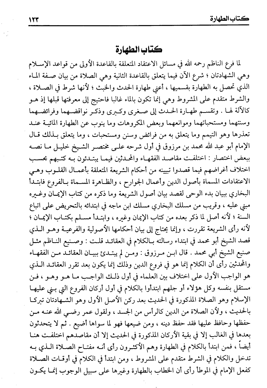 لما فرع الناظم رحمه الله في مسائل الاعتقاد المتعلقة بالقاعدة الأولى من قواعد الاسلام وهي الشهادتان شرع الآن فيما يتعلق بالقاعدة الثانية وهي الصلاة من بيان صفة الماء الذي تحصل به الطهارة بقسميها أعني طهارة الحدث والخبث لأنها شرط في الصلاة والشرط متقدم على المشروط وهي إنما تكون بالماء غالبا فاحتيج إلى معرفتها قبلها إذ هو كالآلة لها وتقسم طهارة الحدث إلى صغرى وكبرى وذكر نواقضهما وفرائضهما وسنتهما ومستحباتهما وموانعهما وبعض المكروهات وما ينوب عن الطهارة المائية عند تعذرها وهو التيمم وما يتعلق به من فرائض وسنن ومستحبات وما يتعلق بذلك قال الإمام أبو عبد الله محمد بن مرزوقفي أول شرحه على مختصر الشيخ خليل ما نصه ببعض اختصار اختلفت مقاصد الفقهاء والمحدثين فيما يبتدئون به كتبهم اختلاف أغراضهم فيما قصدوا تبينه من أحكام الشريعة المتعلقة بأعمال القلوب وهي الاعتقادات المسماة بأصول الدين وأعمال الجوارح والظاهرة المسماة بالفروع فابتدأ البخاري ببيان بدء الوجه لقصد بيان أصول الشريعة وما ذكره من كتاب الايمان وغيره مبني عليه وقريب من مسلك البخاري مسلك ابن ماجه في ابتدائه بالتحريض على اتباع السنة لأنه أصل لما ذكر بعده من كتاب الايمان وغيره وابتدأ مسلم بكتاب الايمان لأنه رأى الشريعة تقررت وإنما يحتاج إلى بيان أحكامها الأصولية والفرعية وهو الذي قصد الشيخ أبو محمد في ابتداء رسالته بالكلام في العقائد قلت وصنيع الناظم مثل صنيع الشيخ أبي محمد قال ابن مرزوق ومن لم يبتدىء ببيان العقائد من الفقهاء والمحدثين رأى أن الكلام إنما هو في فروع الدين وذلك إنما يكون بعد تقرر العقائد الذي هو الواجب الأول على اختلاف بين العلماء في أول ذلك الواجب ما هو وهو فن مستقل بنفسه وكل هؤلاء أو جلهم ابتدأوا بالكلام في أول أركان الفروع التي بني عليها الاسلام وهو الصلاة المذكورة في الحديث بعد ركن الأصل الأول وهو الشهادتان تبركا بالحديث ولأن الصلاة من الدين كالرأس من الجسد ولقول عمر رضي الله عنه من حفظها وحافظ عليها فقد حفظ دينه ومن ضيعها فهو لما سواها أضيع ثم لا يتحدثون بعدها في الغالب إلا في بقية الأركان المذكورة في الحديث إلا أن مقاصدهم اختلفت هنا أيضاً فمن ابتدأ بالكلام في الطهارة وهم الأكثرون رأى أنه مفتاح الصلاة الذي به تدخل والكلام في الشرط متقدم على المشروط ومن ابتدأ في الكلام في أوقات الصلاة كفعل الامام في الموطأ رأى أن الخطاب بالطهارة وغيرها إنما يكون