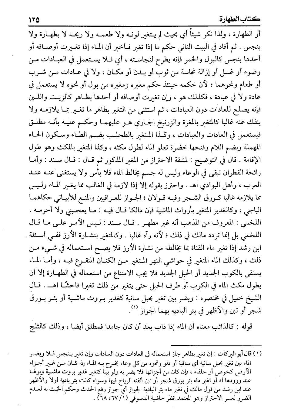 أو الطهارة ولذا نكر شيئاً أي بحيث لم يتغير لونه ولا طعمه ولا ريحه لا بطهارة ولا بنجس ثم أفاد في البيت الثاني ما إذا تغير فأخبر أن الماء إذا تغيرت أوصافه أو أحدها بنجس كالبول والخمر فإنه يطرح لنجاسته أي فلا يستعمل في العبادات من وضوء أو غسل أو إزالة نجاسة من ثوب أو بدن أو مكان ولا في عادات من شرب أو طعام ونحوهما لان حكمه حينئذ حكم مغيره ومغيره من بول أو نحوه لا يستعمل في عادة ولا في عبادة فكذلك هو وإن تغيرت أوصافه أو أحدها بطاهر كالزيت واللبن فانه يصلح للعادات دون العبادات ثم استثنى من التغير بطاهر ما تغير بما يلازمه ولا ينفك عنه غالبا كالمتغير بالمغرة والزرنيخ الجاري هو عليهما وحكم عليه بأنه مطلق فيستعمل في العادات والعبادات وكذا المتغير بالطحلب بضم الطاء وسكون الحاء المهملة وبضم اللام وفتحها خضرة تعلو الماء لطول مكثه وكذا المتغير بالمكث وهو طول الإقامة قال في التوضيح لمشقة الاحتراز من المغير المذكور ثم قال قال سند وأما رائحة القطران تبقى في الوعاء وليس له جسم يخالط الماء فلا بأس ولا يستغنى عنه عند العرب وأهل البوادي اهـ. واحترز بقوله إلا إذا لازمه في الغالب مما يغير الماء وليس مما يلازمه غالبا كورق الشجر وفيه قولان الجواز للعراقيين والمنع للابياني حكاهما الباجي وكالغدير المتغير بأرواث الماشية فان مالكا قال فيه ما يعجبني ولا أحرمه اللخمي المعروف من المذهب أنه غير مطهر قال سند ليس الأمر على ما قال اللخمي بل إنما تردد مالك في ذلك لأنه رآه غالبا وكالمتغير بنشارة الأرز ففي أسئلة ابن رشد إذا تغير ماء القناة بما يخالطه من نشارة الأرز فلا يصح استعماله في شيء من ذلك وكذلك الماء المتغير في حواشي النهر المتغير من الكنان المنقوع فيه وأما الماء يستقى بالكوب الجديد أو الحبل الجديد فلا يجب الامتناع من استعماله في الطهارة إلا أن يطول مكث الماء في الكوب أو طرف الحبل حتى يتغير من ذلك تغيرا فاحشا اهـ قال الشيخ خليل في مختصره ويضر بين تغير بحبل سانية كغدير بروث ماشية أو بئر بورق شجر أو تين والأظهر في بئر الباديه بهما الجواز قوله كالذائب معناه أن الماء إذا ذاب بعد أن كان جامدا فمطلق أيضا وذلك كالثلج