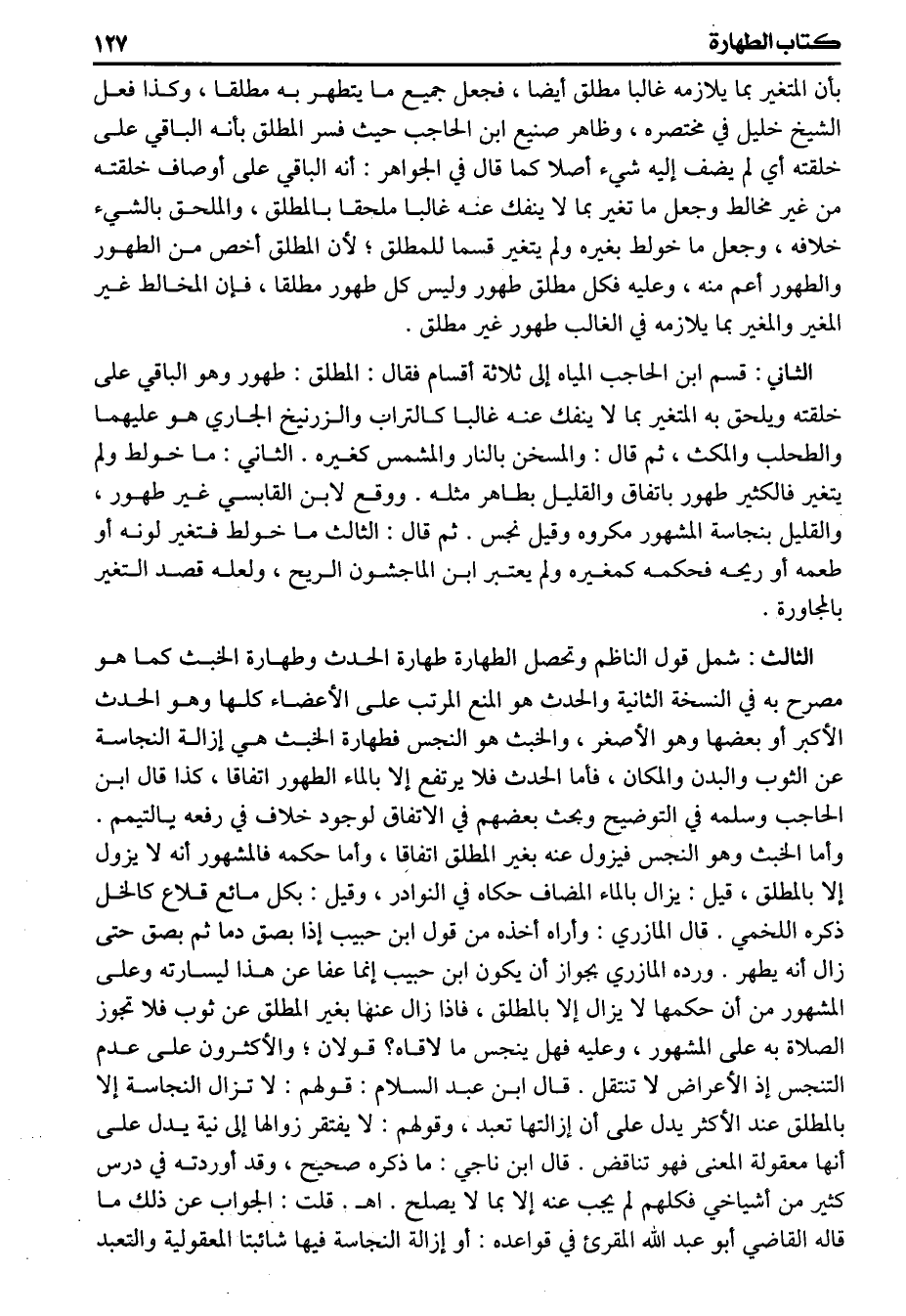 بأن المتغير بما يلازمه غالبا مطلق أيضا فجعل جميع ما يتطهر به مطلقا وكذا فعل الشيخ خليل في مختصره وظاهر صنيع ابن الحاجب حيث فسر المطلق بأنه الباقي على خلقته أي لم يضف إليه شيء أصلا كما قال في الجواهر أنه الباقي على أوصاف خلقته من غير مخالط وجعل ما تغير بما لا ينفك عنه غالبا ملحقا بالمطلق والملحق بالشيء خلافه وجعل ما خولط بغيره ولم يتغير قسما للمطلق لأن المطلق أخص من الطهور والطهور أعم منه وعليه فكل مطلق طهور وليس كل طهور مطلقا فإن المخالط غير المغير والمغير بما يلازمه في الغالب طهور غير مطلق (الثاني) قسم ابن الحاجب المياه إلى ثلاثة أقسام فقال المطلق طهور وهو الباقي على خلقته ويلحق به المتغير بما لا ينفك عنه غالبا كالتراب والزرنيخ الجاري هو عليهما والطحلب والمكث ثم قال والمسخن بالنار والمشمس كغيره الثاني ما خولط ولم يتغير فالكثير طهور باتفاق والقليل بطاهر مثله ووقع لابن القابسي غير طهور والقليل بنجاسة المشهور مكروه وقيل نجس ثم قال الثالث ما خولط فتغير لونه أو طعمه أو ريحه فحكمه كمغيره ولم يعتبر ابن الماجشون الريح ولعله قصد التغير بالمجاورة (الثالث) شمل قولالناظم وتحصل الطهارة طهارة الحدث وطهارة الخبث كما هو مصرح به في النسخة الثانية والحدث هو المنع المرتب على الأعضاء كلها وهو الحدث الأكبر أو بعضها وهو الأصغر والخبث هو النجس فطهارة الخبث هي إزالة النجاسة عن الثوب والبدن والمكان فأما الحدث فلا يرتفع إلا بالماء الطهور اتفاقا كذا قال ابن الحاجب وسلمه في التوضيح وبحث بعضهم في الاتفاق لوجود خلاف في رفعه بالتيمم وأما الخبث وهو النجس فيزول عنه بغير المطلق اتفاقا وأما حكمه فالمشهور أنه لا يزول إلا بالمطلق وقيل يزال بالماء المضاف حكاه في النوادر وقيل بكل مائع قلاع كالخل ذكره اللخمي قال المازري وأراه أخذه من قول ابن حبيب إذا بصق دما ثم بصق حتى زال أنه يطهر ورده المازري بجواز أن يكون ابن حبيب إنما عفا عن هذا ليساره وعلى المشهور من أن حكمها لا يزال إلا بالمطلق فاذا زال عنها بغير المطلق عن ثوب فلا تجوز الصلاة به على المشهور وعليه فهل ينجس ما لاقاه قولان والأكثرون على عدم التنجس إذ الأعراض لا تنتقل قال ابن عبد السلام قولهم لا تزال النجاسة إلا بالمطلق عند الأكثر يدل على أن إزالتها تعبد وقولهم لا يفتقر زوالها إلى نية يدل على أنها معقولة المعنى فهو تناقض قال ابن ناجي ما ذكره صحيح وقد أوردته في درس كثير من أشياخي فكلهم لم يجب عنه إلا بما لا يصلح اهـ قلت الجواب عن ذلك ما قاله القاضي أبو عبد الله المقرىء في قواعده أو إزالة النجاسة فيها شائبتا المعقولية والتعبد