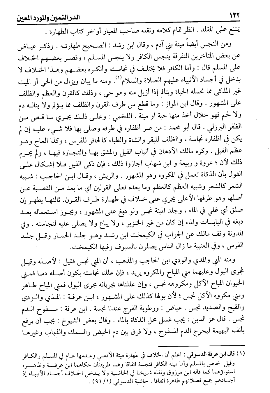 يمتنع على المقلد أنظر تمام كلامه ونقله صاحب المعيار أواخر كتاب الطهارة ومن النجس أيضاً ميتة بني آدم وقال ابن رشد الصحيح طهارته وذكر عياض عن بعض المتأخرين التفرقة ينجس الكافر ولا ينجس المسلم وقصر بعضهم الخلاف على المسلم قال وأما الكافر فلا يختلف في نجاسته وانكره بعضهم وهذا الخلاف لايدخل في أجساد الأنبياء عليهم الصلاة والسلام ومنه ما يبان ويزال من الحي أو الميت غير المذكى مما تحمله الحياة ويتألم إذا أزيل منه وهو حي وذلك كالقرن والعظم والظلف على المشهور وقال ابن المواز وما قطع من طرف القرن والظلف مما يؤلم ولا يناله دم ولا لحم فهو حلال أخذ منها حية أو ميتة اللخمي وعلى ذلك يجري ما قص من الظفر البرزلي قال أبو محمد من صر أظفاره في طرفه وصلى بها فلا شيء عليه إن لم يكن في أظفاره نجاسة والظلف للبقر والشاة والظباء كالحافر للفرس وكذا العاج وهو عظم الفيل وكره مالك الأدهان في أنياب الفيل والمشق بها والتجارة فيها ولم يحرم ذلك لأن عروة وربيعة وابن شهاب أجازوا ذلك فإن ذكى الفيل فلا إشكال على القول بأن الذكاة تعمل في المكروه وهو المشهور والريش وقال ابن الحاجب شبيه الشعر كالشعر وشبيه العظم كالعظم وما بعده فعلى القولين أي ما بعد من القصبة عن أصلها وهو طرفها الأعلى يجري على خلاف في طهارة طرف القرن. ثالثها يطهر إن صلق أي غلي في الماء وجلد الميتة نجس ولو دبغ على المشهور ويجوز استعماله بعد دبغه في اليابسات والماء إن كان من غير الخنزير ولا يباع ولا يصلى عليه لنجاسته وفي المدونة وقف مالك عن الجواب في الكيمخت ابن رشد وهو جلد الحمار وقبل جلد الفرس وفي العتبية ما زال الناس يصلون بالسيوف وفيها الكيمخت. ومنه المني والمذي والودي ابن الحاجب والمذهب أن المني نجس فقيل لا صله وقيل لمجرى البول وعليهما مني المباح والمكروه يريد فإن عللنا نجاسته بكون أصله دما فمني الحيوان المباح الأكل ومكروهه نجس وإن عللناها بجريانه مجرى البول فمني المباح طاهر ومني مكروه الأكل نجس لأن بولها كذلك على المشهور ابن عرفة المذي والودي والقيح والصديد نجس عياض ورطوبة الفرج عندنا نجسة ابن عرفة مسفوح الدم نجس قال عز الدين يجب غسل محل الذكاة بالماء وقال بعض الشيوخ يجب أن يرفع بأنف البهيمة ليخرج الدم المسفوح ولا فرق بين دم الحيض والسمك والذباب وغيرها