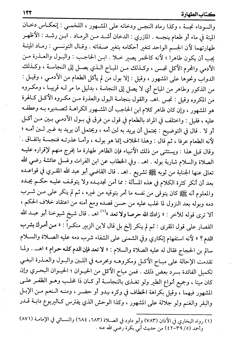 الدخان أشد من الرماد ابن رشد الأظهر طهارتهما لأن الجسم الواحد تتغير أحكامه بتغير صفاته وقال التونسي رماد الميتة يجب أن يكون طاهرا لأنه كالخمر يصير خلا ابن الحاجب والبول والعذرة من الآدمي والمحرم الأكل نجس وكذلك من المباح الذي يصل إلى النجاسة وكذلك الدواب ونحوها على المشهور وقيل إلا بول من لم يأكل الطعام من الآدمي وقيل من الذكور وطاهر من المباح أي لا يصل إلى النجاسة بدليل ما مر له قريبا ومكروه من المكروه وقيل نجس اهـ والقول بنجاسة البول والعذرة من مكروه الأكل كالهرة هو المشهور وإن كان ظاهر كلام ابن الحاجب أن المشهور الكراهة لتصديره به وعطفه عليه فقيل واختلف في المراد بالطعام في قول من فرق في بول الادمي بين من أكل أو لا قال في التوضيح يحتمل أن يريد به لبن أمه ويحتمل أن يريد به غير لبن أمه لأنه الطعام عرفا ثم قال وهذا الخلاف إنما هو بوله وأما عذرته فنجسة باتفاق وقال قبل هذا ويستثنى من ذلك الأنبياء فإن الظاهر طهارة ما يخرج منهم لإقراره عليه الصلاة والسلام شاربة بوله اه وفي الحطاب عن بين الفرات وغسل عائشة رضي الله تعالى عنها الجنابة من ثوبه تشريع اهـ قال القاضي أبو عبد الله المقري في قواعده بعد أن أنكر كثرة الكلام في هذه المسألة مما أمن تجديده ولا يتوقف عليه حكم يجدد والمعلوم أنه كان يتوقى من نفسه ما أمر بتوقيه من غيره ثم لم ينكر على من شرب دمه وبوله بعد النزول لما غلب عليه من حسن قصده ومع أمنه من اعتقاد خلاف الحكم ألا ترى قوله للآخر زادك الله حرصا ولا تعد اهـ قال شيخ شيوخنا أبو عبد الله القصار على قول المقرى ثم لم ينكر الخ بل قال لابن الزبير منكراً من أمرك بشرب الدم لأنه استفهام إنكاري وفي الشمنى على الشفاء شرب دمه عليه الصلاة والسلام سالم بن الحجاج فقال له عليه الصلاة والسلام لا تعد فإن الدم كله حرام اهـ ولما تقدمت الإحالة على مباح الأكل ومكروهه ومحرمه في اللبن والبول والعذرة انبغي تكميل الفائدة بسرد بعض ذلك. فمن مباح الأكل من الحيوان الحيوان البحري وإن كان ميتا وجميع أنواع الطير ولو تغذى بالنجاسة أو كان ذا مخلب وهو الظفر على المشهور فيهما وقيل بكراهة الخطاف في وكره ببدو أو حضر ومنه النعم من الابل والبقر والغنم ولو جلالة على المشهور وكذا الوحش الذي يفترس كاليربوع دابة قدر