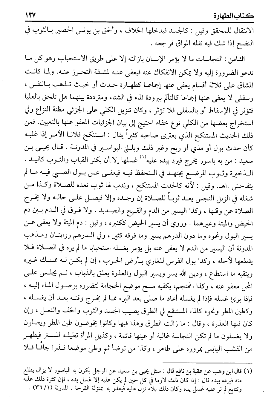 الانتقال للمحقق وقيل كالجسد فيدخلها الخلاف وألحق بن يونس الحصير بالثوب في النضح إذا شك فيه نقله المواق فراجعه الثامن النجاسات ما لا يؤمر الانسان بازالته إلا على طريق الاستحباب وهو كل ما تدعو الضرورة إليه ولا يمكن الانفاك عنه فيعفى عنه لمشقة التحرز عنه. ولما كانت المشاق على ثلاثة أقسام يعفى عنها إجماعا كطهارة حدث أو خبث تذهب بالنفس وسفلى لا يعفى عنها إجماعا كالتألم ببرودة الماء في الشتاء ومترددة بينهما هل تلحق بالعليا فتؤثر في الاسقاط أو بالسفلى فلا تؤثر وكان تنزيل الكلي على الجزائي مظنة النزاع وفي استخراج بعضها من الكلي نوع خفاء احتيج إلى بيان الجزئيات المعفو عنها بالتعيين. فمن ذلك الحديث المستنكح الذي يعترى صاحبه كثيراً يقال استنكح فلانا الأمرإذا غلبه كأن حدث بول أو مذي أو ريح وغير ذلك وبلل البواسير في المدونة قال يحيى بن سعيد من به باسور يخرج فيرد بيده عليه غسلها إلا أن يكثر القباب والثوب كاليد الذخيرة وثوب المرضع يجتهد في التحفظ فيه فيعفى عن بول الصبي فيه ما لم يتفاحش اهـ وقيل لأنه كالحدث المستنكح وندب لها ثوب تعدة للصلاة وكذا من شغله في الزبل النجس يستعد ثوباً للصلاة إن وجده وإلا فيصل على حاله ولا يخرج الصلاة عن وقتها وكذا اليسير من الدم والقيح والصديد ولا فرق في الدم بين دم الحيض والميتة وغيرهما وروي أن يسير الحيض ككثيره وقيل دم الميتة ولا يعفى عن يسير البول ونحوه وما دون الدرهم يسير وما فوقه كثير وفي الدرهم روايتان ومذهب المدونة أن اليسير من الدم لا يعفى عنه بل يؤمر بغسله استحبابا ما لم يره في الصلاة فلا يقطعها لأجله وكذا بول الفرس للغازي بأرض الحرب إن لم يكن له ممسك غيره ويتقيه ما استطاع ودين الله يسر ويسير البول والعذرة يعلق بالذباب ثم يجلس على المحل معفو عنه وكذا المحتجم، يكفيه مسح موضع الحجامة لتضرره بوصول الماء إليه فإذا برىء غسله فإذا لم يغسله أعاد ما صلى بعد البرء مما لم يخرج وقته بعد أن يغسله وكطين المطر ونحوه كالماء المستنقع في الطرق يصيب الجسد والثوب والخف والنعل وإن كان فيها العذرة وقال ما زالت الطرق وهذا فيها وكانوا يخوضون طين المطر ويصلون ولا يغسلون ما لم تكن النجاسة غالبة أو عينها قائمة وكذيل المرأة تطيله للستر فيطهر من القشب اليابس بمروره على طاهر وكذا من توضأ ثم وطىء موضعا قذرا جافا فلا