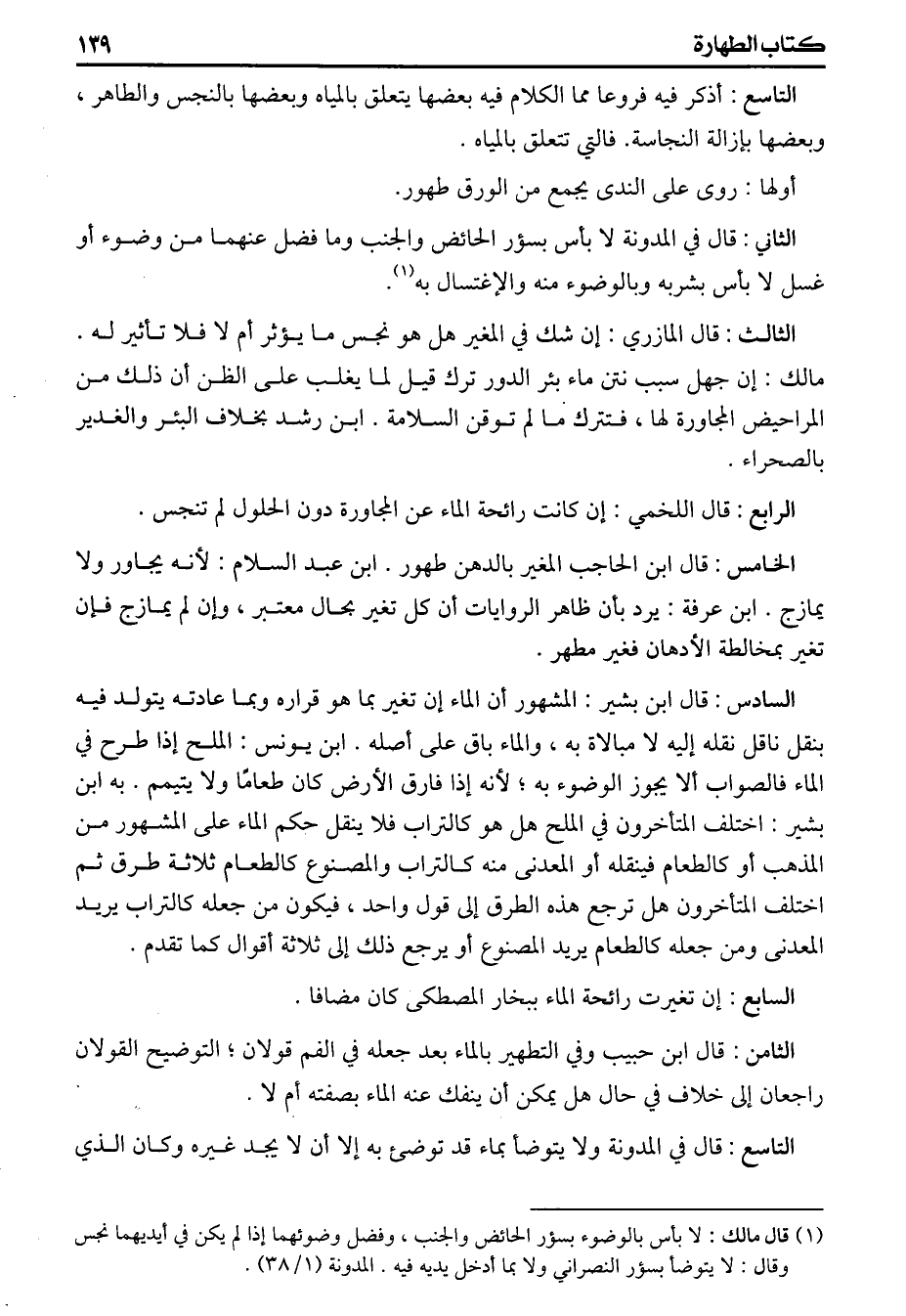 (التاسع) أذكر فيه فروعا مما الكلام فيه بعضها يتعلق بالمياه وبعضها بالنجس والطاهر وبعضها بإزالة النجاسة. فالتي تتعلق بالمياه أولها روى على الندى يجمع من الورق طهور الثاني قال في المدونة لا بأس بسؤر الحائض والجنب وما فضل عنهما من وضوء أو غسل لا بأس بشربه وبالوضوء منه والأغتسال به الثالث قال المازري إن شك في المغير هل هو نجس مايؤثر أم لا فلا تأثير له مالك إن جهل سبب نتن ماء بئر الدور ترك قيل لما يغلب على الظن أن ذلك من المراحيض المجاورة لها فتترك ما لم توقن السلامة ابن رشد بخلاف البئر والغدير بالصحراء الرابع قال اللخمي إن كانت رائحة الماء عن المجاورة دون الحلول لم تنجس الخامس قال ابن الحاجب المغير بالدهن طهور ابن عبد السلام لأنه يجاور ولا يمازج ابن عرفة يرد بأن ظاهر الروايات أن كل تغير بحال معتبر وإن لم يمازج فإن تغير بمخالطة الأدهان فغير مطهر السادس قال ابن بشير المشهور أن الماء إن تغير بما هو قراره وبما عادته يتولد فيه بنقل ناقل نقله إليه لا مبالاة به والماء باق على أصله ابن يونس الملح إذا طرح في الماء فالصواب أن لا يجوز الوضوء به لأنه إذا فارق الأرض كان طعاما ولا يتيمم به ابن بشير اختلف المتأخرون في الملح هل هو كالتراب فلا ينقل حكم الماء على المشهور من المذهب أو كالطعام فينقله أو المعدنى منه كالتراب والمصنوع كالطعام ثلاثة طرق ثم اختلف المتأخرون هل ترجع هذه الطرق إلى قول واحد فيكون من جعله كالتراب يريد المعدنى ومن جعله كالطعام يريد المصنوع أو يرجع ذلك إلى ثلاثة أقوال كما تقدم السابع إن تغيرت رائحة الماء ببخار المصطكى كان مضافا الثامن قال ابن حبيب وفي التطهير بالماء بعد جعله في الفم قولان التوضيح القولان راجعان إلى خلاف في حال هل يمكن أن ينفك عنه الماء بصفته أم لا التاسع قال في المدونة ولا يتوضأ بماء قد توضىء به إلا أن لا يجد غيره وكان الذي