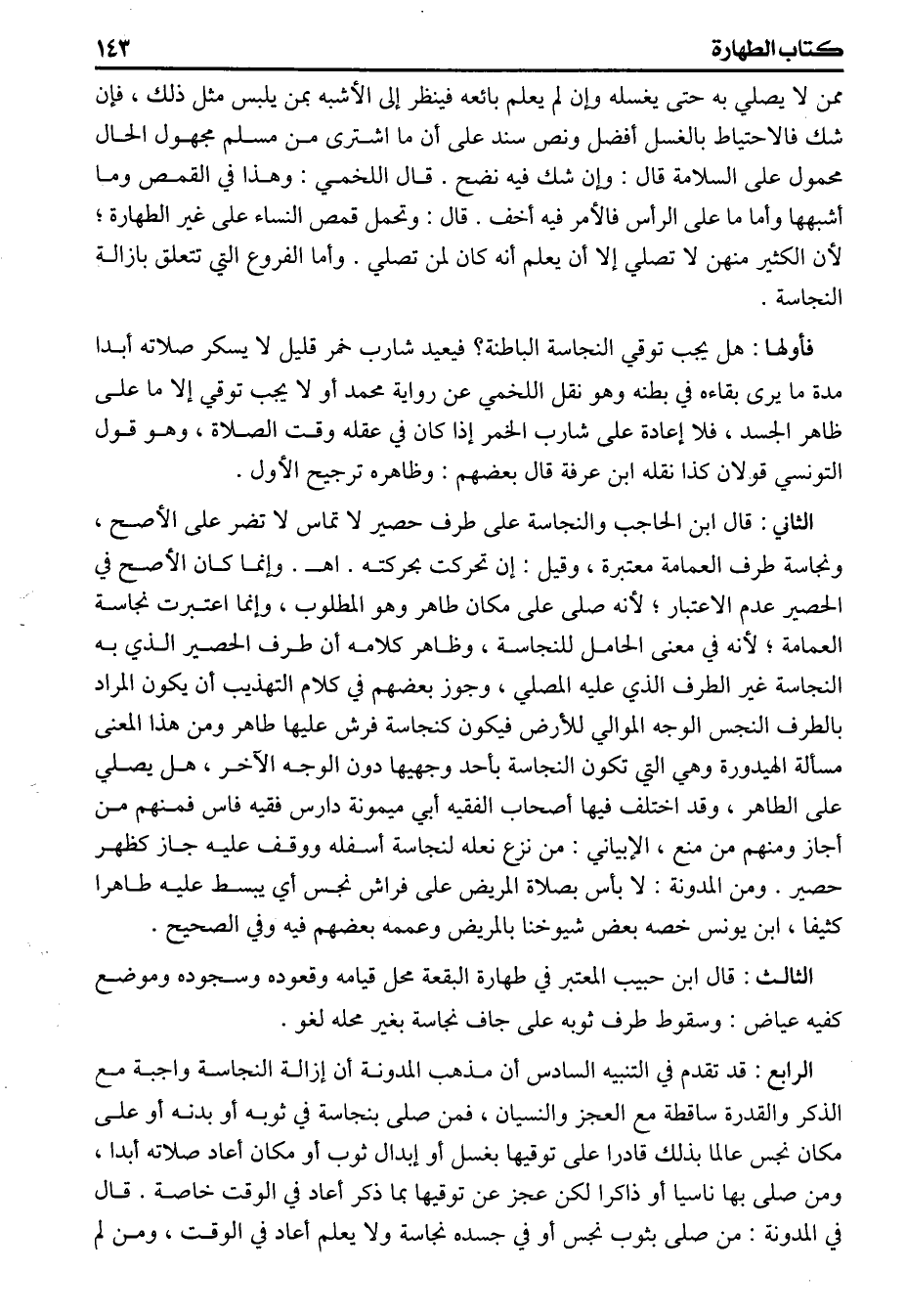 ممن لا يصلي به حتى يغسله وإن لم يعلم بائعه فينظر إلى الأشبه بمن يلبس مثل ذلك فإن شك فالاحتياط بالغسل أفضل ونص سند على أن ما اشترى من مسلم مجهول الحال محمول على السلامة قال وإن شك فيه نضح قال اللخمي وهذا في القمص وما أشبهها وأما ما على الرأس فالأمر فيه أخف قال وتحمل قمص النساء على غير الطهارة لأن الكثير منهن لا تصلي إلا أن يعلم أنه كان لمن تصلي وأما الفروع التي تتعلق بازالة النجاسة (فأولها) هل يجب توقي النجاسة الباطنة فيعيد شارب خمر قليل لا يسكر صلاته أبدا مدة ما يرى بقاءه في بطنه وهو نقل اللخمي عن رواية محمد أو لا يجب إلا توقي ما على ظاهر الجسد فلا إعادة على شارب الخمر إذا كان في عقله وقت الصلاة وهو قول التونسي قولان كذا نقله ابن عرفة قال بعضهم وظاهره ترجيح الأول (الثاني) قال ابن الحاجب والنجاسة على طرف حصير لا تماس لا تضر على الأصح ونجاسة طرف العمامة معتبرة وقيل إن تحركت بحركته اهـ وإنما كان الأصح في الحصير عدم الاعتبار لأنه صلى على مكان طاهر وهو المطلوب وإنما اعتبرت نجاسة العمامة لأنه في معنى الحامل للنجاسة وظاهر كلامه أن طرف الحصير الذي به النجاسة غير الطرف الذي عليه المصلي وجوز بعضهم في كلام التهذيب أن يكون المراد بالطرف النجس الوجه الموالي للأرض فيكون كنجاسة فرش عليها طاهر ومن هذا المعنى مسألة الهيدورة وهي التي تكون النجاسة بأحد وجهيها دون الوجه الآخر هل يصلي على الطاهر وقد اختلف فيها أصحاب الفقيه أبي ميومنة دارس فقيه فاس فمنهم من أجاز ومنهم من منع الأبياني من نزع نعله لنجاسة أسفله ووقف عليه جاز كطهر حصير ومن المدونة لا بأس بصلاة المريض على فراش نجس أي يبسط عليه طاهرا كثيفا ابن يونس خصه بعض شيوخنا بالمرض وعممه بعضهم فيه وفي الصحيح (الثالث) قال ابن حبيب المعتبر في طهارة البقعة محل قيامه وقعوده وسجوده وموضع كفيه عياض وسقوط طرف ثوبه على جاف نجاسة بغير محله لغو (الرابع) قد تقدم في التنبيه السادس أن مذهب المدونة أن إزالة النجاسة واجبة مع الذكر والقدرة ساقطة مع العجز والنسيان فمن صلى بنجاسة في ثوبه أو بدنه أو على مكان نجس عالما بذلك قادرا على توقيها بغسل أو إبدال ثوب أو مكان أعاد صلاته أبدا ومن صلى بها ناسيا أو ذاكرا لكن عجز عن توقيها بما ذكر أعاد في الوقت خاصة قال في المدونة من صلى بثوب نجس أو في جسده نجاسة ولا يعلم أعاد في الوقت ومن لم