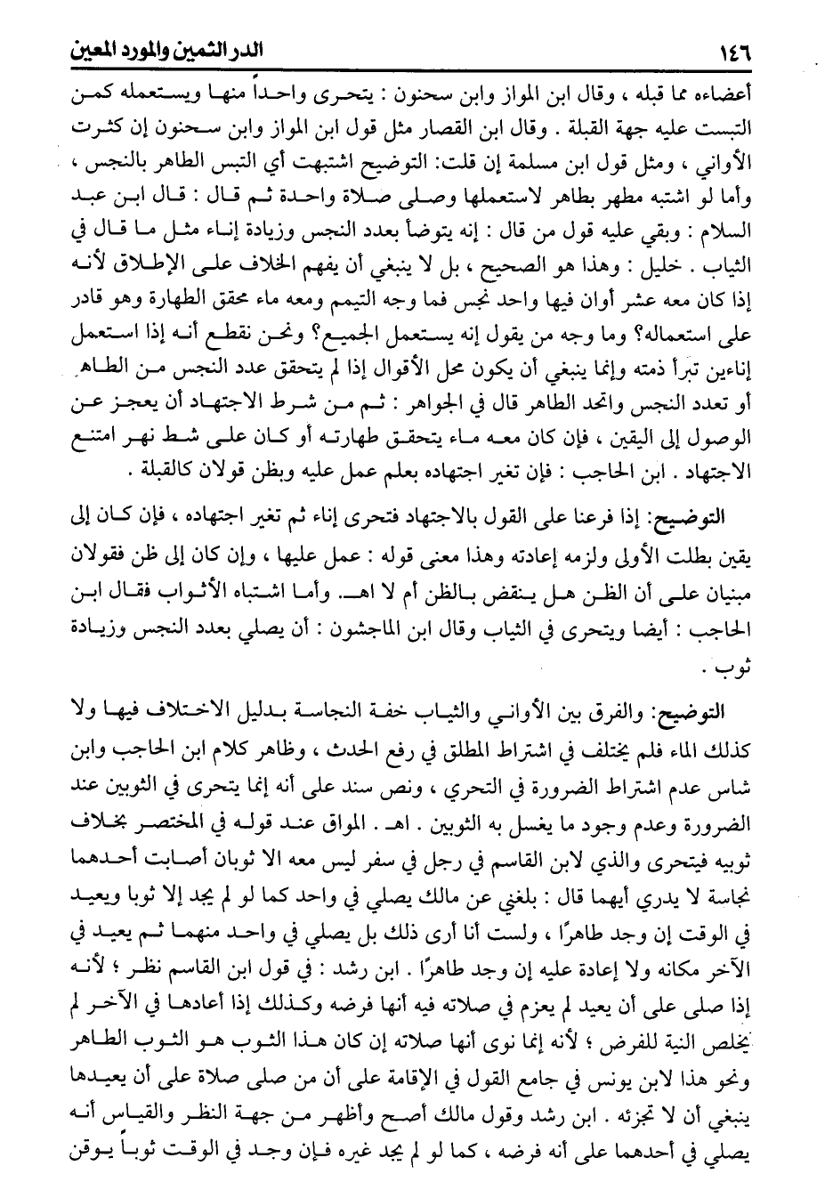 أعضاءه مما قبله وقال ابن المواز وابن سحنون يتحرى واحداً منها ويستعمله كمن التبست عليه جهة القبلة وقال ابن القصار مثل قول ابن المواز وابن سحنون إن كثرت الأواني ومثل قول ابن مسلمة إن قلت: التوضيح اشتبهت أي التبس الطاهر بالنجس وأما لو اشتبه مطهر بطاهر لم يستعملها وصلى صلاة واحدة ثو قال قال ابن عبد السلام وبقي عليه قول من قال إنه يتوضأ بعدد النجس وزيادة إناء مثل ما قال في الثياب خليل وهذا هو الصحيح بل لا ينبغي أن يفهم الخلاف على الاطلاق لأنه إذا كان معه عشر أوان فيها واحد نجس فما وجه التيمم ومعه ماء محقق الطهارة وهو قادر على استعماله وما وجه من يقول إنه يستعمل الجميع ونحن نقطع أنه إذا استعمل إناءين تبرأ ذمته وإنما ينبغي أن يكون محل الأقوال إذا لم يتحقق عدد النجس من الطاهر أو تعدد النجس واتحد الطاهر قال في الجواهر ثم من شرط الاجتهاد أن يعجز عن الوصول إلى اليقين فإن كان معه ماء يتحقق طهارته أو كان على شط نهر امتنع الاجتهاد ابن الحاجب فإن تغير اجتهاده بعلم عمل عليه وبظن قولان كالقبلة التوضيح: إذا فرعنا على القول بالاجتهاد فتحرى إناء ثم تغير اجتهاده فإن كان إلى يقين بطلت الأولى ولزمه إعادته وهذا معنى قوله عمل عليها وإن كان إلى ظن فقولان مبنيان على أن الظن هل ينقض بالظن أم لا اهـ وأما اشتباه الأثواب فقال ابن الحاجب أيضا ويتحرى في الثياب وقال ابن الماجشون أن يصلي بعدد النجس وزيادة ثوب التوضيح: والفرق بين الأواني والثياب خفة النجاسة بدليل الاختلاف فيها ولا كذلك الماء فلم يختلف في اشتراط المطلق في رفع الحدث وظاهر كلام ابن الحاجب وابن شاس عدم اشتراط الضرورة في التحري ونص سند على أنه إنما يتحرى في الثوبين عند الضرورة وعدم وجود ما يغسل به الثوبين اهـ المواق عند قوله في المختصر بخلاف ثوبيه فيتحرى والذي لابن القاسم في رجل في سفر ليس معه الا ثوبان أصابت أحدهما نجاسة لا يدري أيهما قال بلغني عن مالك يصلي في واحد كما لو لم يجد إلا ثوبا ويعيد في الوقت إن وجد طاهراً ولست أناأرى ذلك بل يصلي في واحد منهما ثم يعيد في الآخر مكانه ولا إعادة عليه إن وجد طاهراً ابن رشد في قول ابن القاسم نظر لأنه إذا صلى على أن يعيد لم يعزم في صلاته فيه أنها فرضه وكذلك إذا أعادها في الآخر لم يخلص النية للفرض لأنه إنما نوى أنها صلاته إن كان هذا الثوب هو الثوب الطاهر ونحو هذا لابن يونس في جامع القول في الإقامة على أن من صلى صلاة على أن يعيدها ينبغي أن لا تجزئه ابن رشد وقول مالك أصح وأظهر من جهة النظر والقياس أنه يصلي في أحدهما على أنه فرضه كما لو لم يجد غيره فإن وجد في الوقت ثوباً يوقن