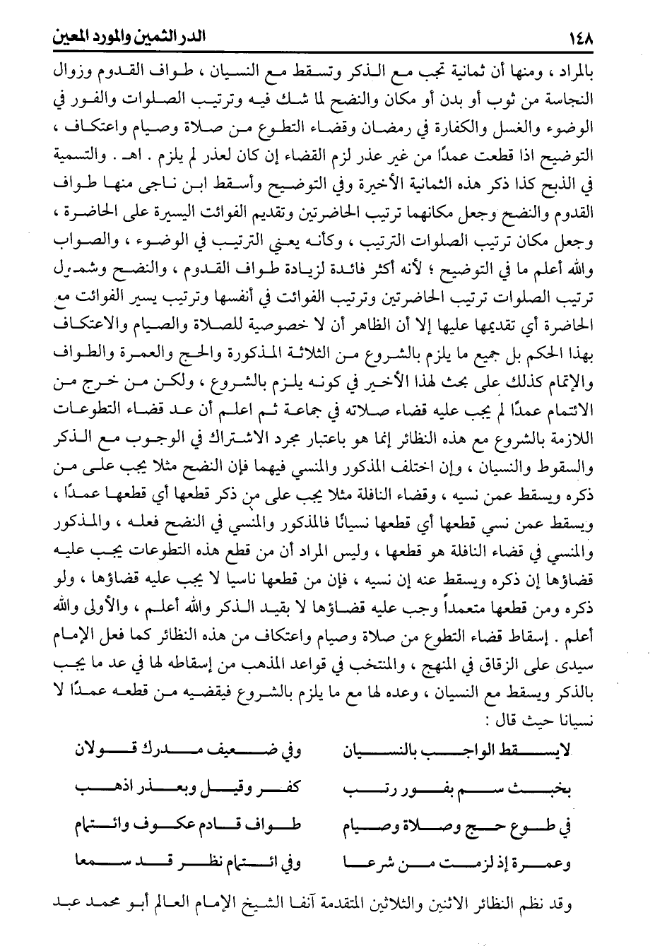 بالمراد ومنها أن ثمانية تجب مع الذكر وتسقط مع النسيان طواف القدوم وزوال النجاسة من ثوب أو بدن أو مكان والنضح لما شك فيه وترتيب الصلوات والفور في الوضوء والغسل والكفارة في رمضان وقضاء التطوع من صلاة وصيام واعتكاف التوضيح اذاقطعت عمدا من غيرعذر لزم القضاء إن كان لعذر لم يلزم اهـ والتسمية في الذبح كذا ذكر هذه الثمانية الأخيرة وفي التوضيح وأسقط ابن ناجى منها طواف القدوم والنضح وجعل مكانهما ترتيب الحاضرتين وتقديم الفوائت اليسيرة على الحاضرة وجعل مكان ترتيب الصلوات الترتيب وكأنه يعني الترتيب في الوضوء والصواب والله أعلم ما في التوضيح لأنه أكثر فائدة لزيادة طواف القدوم والنضح وشمول ترتيب الصلوات ترتيب الحاضرتين وترتيب الفوائت في أنفسها وترتيب يسير الفوائت مع الحاضرة أي تقديمها عليها إلا أن الظاهر أن لاخصوصية للصلاة والصيام والاعتكاف بهذا الحكم بل جميع مايلزم بالشروع من الثلاثة المذكورة والحج والعمرة والطواف والإتمام كذلك على بحث لهذا الأخير في كونه يلزم بالشروع ولكن من خرج من الائتمام عمدا لم يجب عليه قضاء صلاته في جماعة ثم اعلم أن عد قضاء التطوعات اللازمة بالشروع مع هذه النظائر إنما هو باعتبار مجرد الاشتراك في الوجوب مع الذكر والسقوط والنسيان وإن اختلف المذكور والمنسي فيهما فإن النضح مثلا يجب على من ذكره ويسقط عمن نسيه وقضاء النافلة مثلا يجب على من ذكر قطعها أي قطعها عمدا ويسقط عمن نسي قطعها أي قطعها نسيانا فالمذكور والمنسي في النضح فعله والمذكور والمنسي في قضاء النافلة هو قطعها وليس المراد أن من قطع هذه التطوعات يجب عليه قضاؤها إن ذكره ويسقط عنه إن نسيه فإن من قطعها ناسيا لايجب عليه قضاؤها ولو ذكره ومن قطعها متعمداً وجب عليه قضاؤها لابقيد الذكر والله أعلم والأولى والله أعلم إسقاط قضاء التطوع من صلاة وصيام واعتكاف من هذه النظائر كما فعل الإمام سيدى على الزقاق في المنهج والمنتخب في قواعدالمذهب من إسقاطه لها في عد مايجب بالذكر ويسقط مع النسيان وعده لها مع مايلزم بالشروع فيقضيه من قطعه عمدا لانسيانا حيث قال