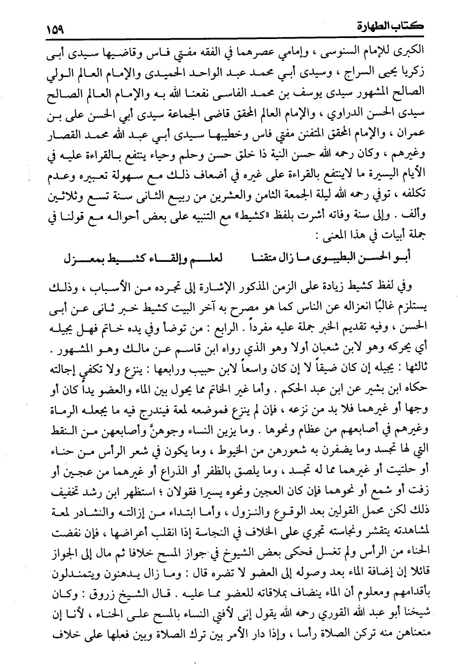 الكبرى للامام السنوسى وامامي عصرهما في الفقه مفتي فاس وقاضيها سيدى أبى زكريا يحيى السراج وسيدى أبي محمد عبد الواحد الحميد والامام العالم الولي الصالح المشهور سيدى يوسف بن محمد الفاسى نفعنا الله به والامام العالم الصالح سيدى الحسن الدراوي والامام العالم المحقق قاضى الجماعة سيدى أبي الحسن على بن عمران والإمام المحقق المتفنن مفتي فاس وخطيبها سيدى أبي عبد الله محمد القصار وغيرهم وكان رحمه الله حسن النية ذا خلق حسن وحلم وحياء ينتفع بالقراءة عليه في الأيام اليسيرة ما لاينتفع بالقراءة على غيره في أضعاف ذلك مع سهولة تعبيره وعدم تكلفه توفي رحمه الله ليلة الجمعة الثامن والعشرين من ربيع الثانى سنة تسع وثلاثين وألف وإلى وفاته أشرت بلفظ «كشيط» مع التنبيه على بعض أحواله مع قولنا في جملة أبيات في هذا المعنى أبو الحسن البطوي مازال متقنا لعلم وإلقاء «كشيط» بمعزل وفي لفظ «كشيط» زيادة على الزمن المذكور الإشارة إلى تجرده من الأسباب وذلك يستلزم غالبا انعزاله عن الناس كما هو مصرح به آخر البيت كشيط خبر ثانى عن أبى الحسن وفيه تقديم الخبر جملة عليه مفرداً الرابع من توضأ وفي يده خاتم فهل يحيله أي يحركه وهو لابن شعبان أولا وهو الذي رواه ابن قاسم عن مالك وهو المشهور ثالثها يحيله إن كان ضيقاً لاإن كان واسعاً لابن حبيب ورابعها ينزع ولاتكفي إجالته حكاه ابن بشير عن ابن عبد الحكم وأما غير الخاتم مما يحول بين الماء والعضو يداً كان أو وجها أو غيرهما فلا بد من نزعه فإن لم ينزع فموضعه لمعة فيندرج فيه ما يجعله الرماة وغيرهما من أصابعهم من عظام ونحوها وما يزين النساء وجوهنَّ وأصابعهن من النقط التي لها تجسد وما يضفرن به شعورهن من الخيوط وما يكون في شعر الرأس من حناء أو حلتيت أو غيرهما مما له تجسد وما يلصق بالظفر أو الذراع أو غيرهما من عجين أو زفت أو شمع أو نحوهما فإن كان العجين ونحوه يسيرا فقولان استظهر ابن رشد تخفيف ذلك لكن محل القولين بعد الوقوع والنزول وأما ابتداء من إزالته والنشادر لمعة لمشاهدته يتقشر ونجاسته تجري على الخلاف في النجاسة إذا انقلب أعراضها فإن نفضت الحناء من الرأس ولم تغسل فحكى بعض الشيوخ في جواز المسح خلافا ثم مال إلى الجواز قائلا إن إضافة الماء بمد وصوله إلى العضو لاتضره قال وما زال يدهنون ويتمندلون بأقدامهم ومعلوم أن الماء ينضاف بملاقاته للعضو مما عليه قال الشيخ زروق وكان شيخنا أبو عبد السلام القوري رحمه الله يقول إنى لأفتي النساء بالمسح على الحناء لأنا إن منعناهن منه تركن الصلاة رأسا وإذا دار الأمر بين ترك الصلاة وبين فعلها على خلاف