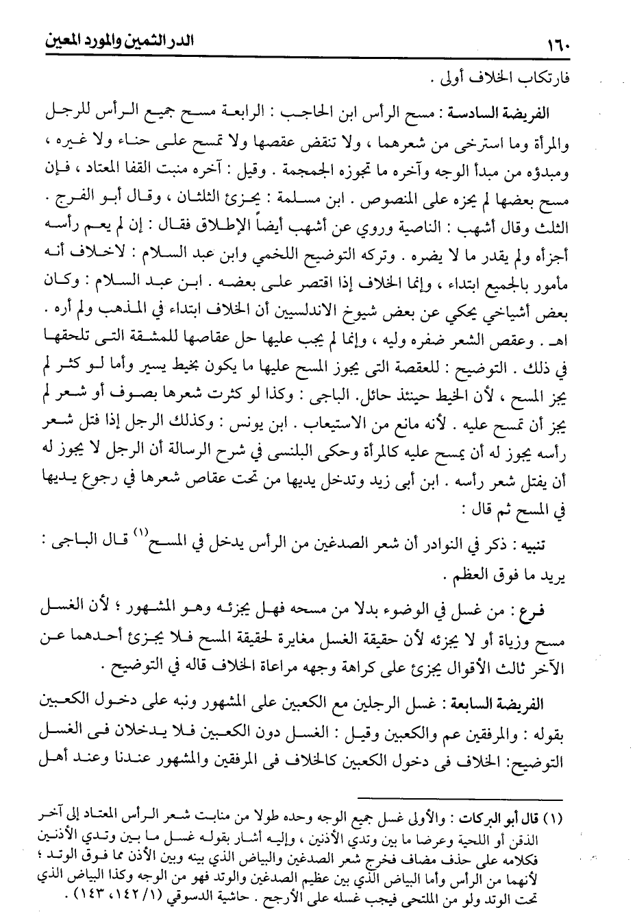 فارتكاب الخلاف أولى (الفريضة السادسة مسح الرأس) ابن الحاجب الرابعة مسح جميع الرأس للرجل والمرأة ومااسترخى من شعرهما ولاتنقض عقصها ولاتمسح على حناء ولاغيره ومبدؤه من مبدأ الوجه وآخره ماتجوزه الجمجمه وقيل آخره منبت القفاء المعتاد فإن مسح بعضها لم بحزه على المنصوص ابن مسلمة يحرى الثلثان وقال أبو الفرح الثلث وقال أشهب الناصية وروي عن أشهب أيضاً الاطلاق فقال إن لم يعم رأسه أجزأ ولم يقدر مالا يضره وتركه التوضيح اللخمي وابن عبد السلام لاخلاف أنه مأمور بالجميع ابتداء وإنما الخلاف إذا اقتصر على بعضه ابن عبد السلام وكان بعض أشياخي يحكي عن بعض شيوخ الاندلسيين أن الخلاف ابتداء في المذهب ولم أره اهـ وعقص الشعر ضفره وليه وإنما لم يجب عليها حل عقاصها للمشقة التى تلحقها في ذلك التوضيح: للعقصة التى يجوز المسح عليها ما يكون بخيط يسير وأما لو كثر لم يجز المسح لأن الخيط حينئذ حائل الباجى وكذا لو كثرت شعرها بصوف أوشعر لم يجز أن تمسح لأنه مانع من الاستيعاب ابن يونس وكذلك الرجل إذا فتل شعر رأسه يجوز له أن يمسح عليه كالمرأة وحكى البلنسى في شرح الرسالة أن الرجل لايجوز له أن يفتل شعر رأسه ابن أبى زيد وتدخل يديها من تحت عقاص شعرها في رجوع يديها في المسح ثم قال (تنبيه) ذكر في النوادر أن شعر الصدغين من الرأس يدخل في المسح قال الباجى يريد مافوق العظم (فرع) من غسل في الوضوء بدلا من مسحه فهل يجزئه وهو المشهور لأن الغسل مسح وزياة أولا يجزئه لأن حقيقة الغسل مغايرة لحقيقة المسح فلا يجزىء أحدهما عن الآخر ثالث الأقوال يجزىء على كراهة وجهه مراعاة الخلاف قاله في التوضيح (الفريضة السابعة) غسل الرجلين مع الكعبين على المشهور ونبه على دخول الكعبين بقوله والمرفقين عم والكعبين وقيل الغسل دون الكعبين فلا يدخلان فى الغسل التوضيح: الخلاف فى دخول الكعبين كالخلاف فى المرفقين والمشهور عندنا وعند أهل