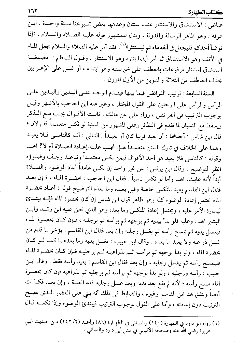 عياض الاستنشاق والاستنثار عندنا سنتان وعدهما بعض شيوخنا سنة واحدة ابن عرفة وهو ظاهر الرسالة والمدونة ويدل للمشهور قوله عليه الصلاة والسلام «إذا توضأ أحدكم فليجعل في أنفه ماء ثم ليستنثر» فقد أمر عليه الصلاة والسلام بجعل الماء في الأنف وهو الاستنشاق ثم أمر أيضا بنثره وهو الاستنثار وقول الناظم (مضمضة استنشاق استنثار) مرفوعات بالعطف على خبرسننه وهو ابتداء أو غسل على الإعرابين بحذف العاطف من الثلاثة والتنوين من الأول للوزن (السنة السابعة) ترتيب الفرائض فيما بينها فيقدم الوجه على اليدين واليدين على الرأس والرأس على الرجلين على القول المختار وعبر عنه ابن الحاجب بالأشهر وقيل بوجوب الترتيب فى الفرائض رواه علي عن مالك ثالث الأقوال يجب مع الذكر ويسقط مع النسيان لما تقدم فى النظائر وعلى المشهور من السنية لو نكس متعمداً فقولان قال ابن شاس أحدهما أن يعيد قريبا كان أو بعيداً الثانى أنه كالناسى فلا يعيد وهما على الخلاف في تارك السنن متعمداً هل تجب عليه إعادة الصلاة أم لا اهـ وقوله كالناسى فلا يعيد هو أحد الأقوال فيمن نكس معتمداً وتباعد وجف وضوؤه انظر التوضيح وقال ابن يونس من غير واحد إن نكس عامداً أعاد الوضوء والصلاة أبداً لأنه عابث اهـ وأما لونكس ناسياً فقال ابن الحاجب بحضرة الماء فإن بعد فقال ابن القاسم يعيد المنكس خاصة وقيل يعيده وما بعده التوضيح قوله أعاد بحضرة الماء يحتمل إعادة الوضوء كله وهو ظاهر قول ابن شاس إن كان بحضرة الماء فإنه يبتدأ ليسارة الأمر عليه ويحتمل إعادة المنكس وما بعده وهو الذي نص عليه ابن رشد وابن البشير اهـ وعليه فلو بدأ بيديه ثم بوجهه ثم برأسه ثم برجليه فإن كان بحضرة الماء فيغسل يديه ثم يمسح رأسه ثم يغسل رجليه وإن بعد فقال ابن القاسم يؤخر ما قدم من غسل ذراعيه ولا يعيد ما بعده وقال ابن حبيب يغسل يديه وما بعدهما كما لو كان بحضرة الماء ولو بدأ بوجهه ثم برأسه ثم بذراعيه ثم برجليه فإن كان بحضرة الماء فليمسح رأسه ثم يغسل رجليه وإن بعد فقال ابن القاسم يعيد رأسه فقط وقال ابن حبيب رأسه ورجليه ولو بدأ بوجهه ثم برأسه ثم برجليه ثم بذراعيه فإن كان بحضرة الماء مسح رأسه لأنه لم يقع بعد يديه وبعد غسل رجليه لهذه العلة وإن بعد فكذلك أيضاً ويتفق هنا ابن القاسم وغيره والضابط فى ذلك أنه يبني على العضو الذى يصح الترتيب دون إعادته وأما على القول بوجوب الترتيب فيبتدأ الوضوء وإذا نكسه قال