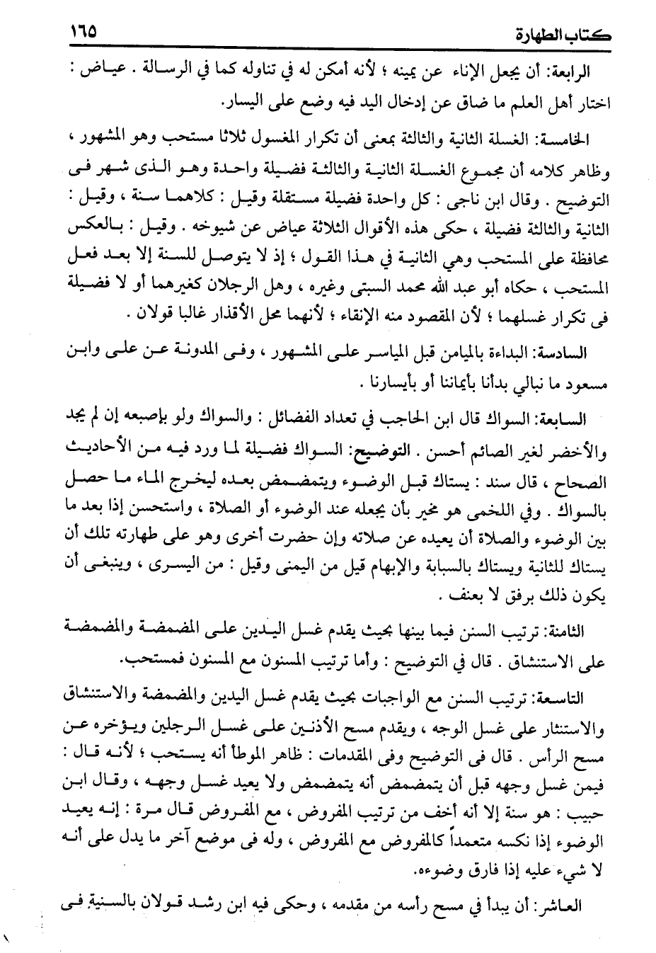 فى التوضيح وفى المقدمات ظاهر الموطأ أنه يستحب لأنه قال فيمن غسل وجهه قبل أن يتمضمض أنه يتمضمض ولا يعيد غسل وجهه وقال ابن حبيب هو سنة إلا أنه أخف من ترتيب المفروض مع المفروض قال مرة إنه يعيد الوضوء إذا نكسه متعمداً كالمفروض مع المفروض وله مع فى موضع آخر ما يدل على أنه لاشيء عليه إذا فارق وضوءه. العاشر: أن يبدأ في مسح رأسه من مقدمه وحكى فيه ابن رشد قولان بالسنية فى