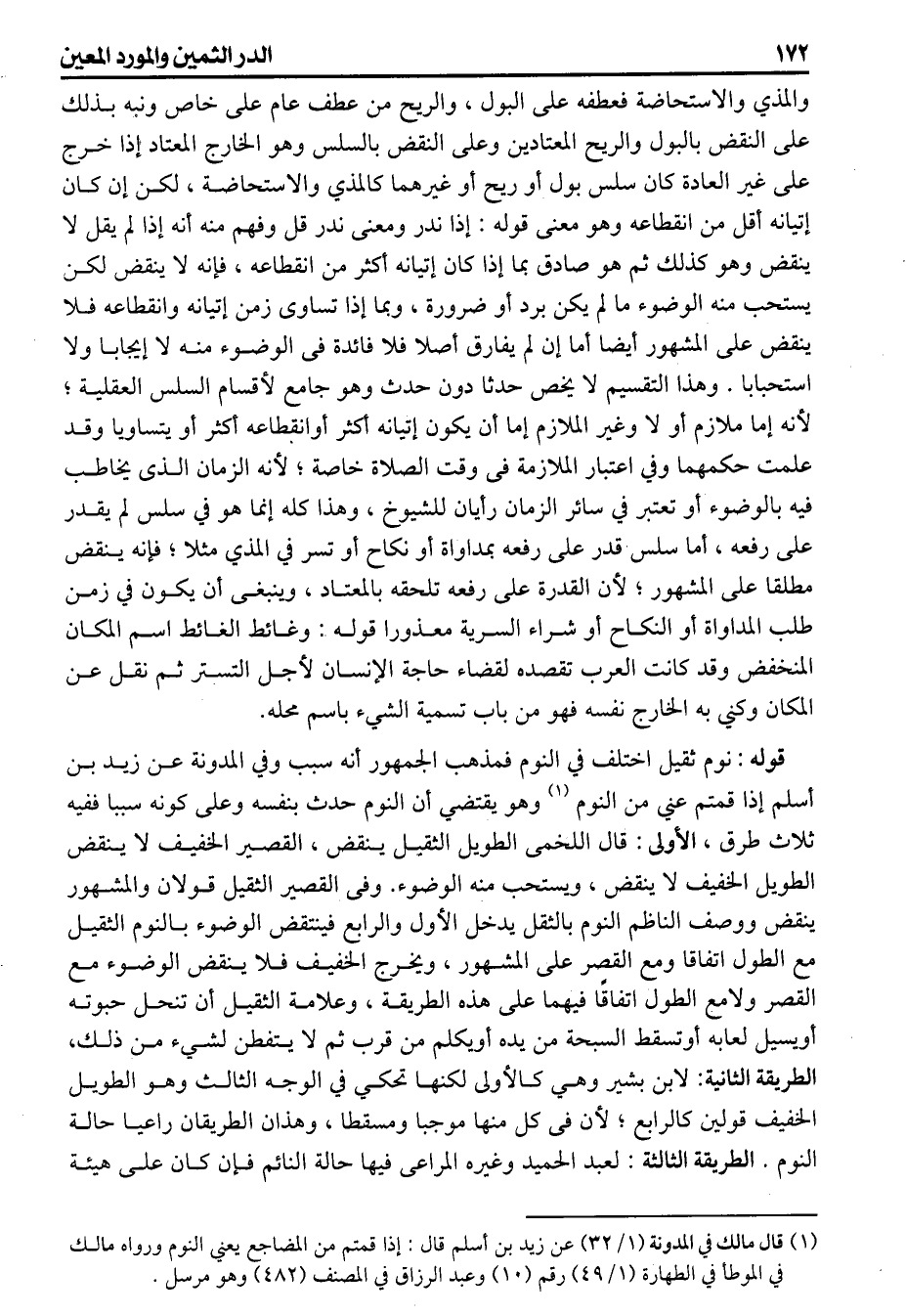 والمذي والاستحاضة فعطفه على البول والريح من عطف عام على خاص ونبه بذلك على النقض بالبول والريح المعتادين وعلى النقض بالسلس وهو الخارج المعتاد إذا خرج على غير العادة كان سلس بول أو ريح أو غيرهما كالمذي والاستحاضة لكن إن كان إتيانه أقل من انقطاعه وهو معنى قوله إذا ندر ومعنى ندر قل وفهم منه أنه إذا لم يقل لاينقض وهو كذلك ثم هو صادق بما إذا كان إتيانه أكثر من انقطاعه فإنه لاينقض لكن يستحب منه الوضوء مالم يكن برد أو ضرورة وبما إذا تساوى زمن إتيانه وانقطاعه فلا ينقض على المشهور أيضا أما إن لم يفارق أصلا فلا فائدة فى الوضوء منه لاإيجابا ولااستحبابا وهذا التقسيم لايخص حدثا دون حدث وهو جامع لأقسام السلس العقلية لأنه أما ملازم أو لا وغير الملازم إما أن يكون إتيانه أكثر أوانقطاعه أكثر أو يتساويا وقد علمت حكمهما وفي اعتبار الملازمة فى وقت الصلاة خاصة لأنه الزمان الذى يخاطب فيه بالوضوء أو تعتبر في سائر الزمان رأيان للشيوخ وهذا كله إنما هو في سلس لم يقدر على رفعه أما سلس قدر على رفعه بمداواة أو نكاح أو تسر في المذي مثلا فإنه ينقض مطلقا على المشهور لأن القدرة على رفعه تلحقه بالمعتاد وينبغى أن يكون في زمن طلب المداواة أو النكاح أو شراء السرية معذورا قوله وغائط الغائط اسم المكان المنخفض وقد كانت العرب تقصده لقضاء حاجة الإنسان لأجل التستر ثم نقل عن المكان وكني به الخارج نفسه فهو من باب تسمية الشيء باسم محله. قوله نوم ثقيل اختلف في النوم فمذهب الجمهور أنه سبب وفي المدونة عن زيد بن أسلم إذا قمتم عني من النوم وهو يقتضي أن النوم حدث بنفسه وعلى كونه سببا ففيه ثلاث طرق الإولى قال اللخمى الطويل الثقيل ينقض القصير الخفيف لابنقض الطويل الخفيف لاينقض ويستحب منه الوضوء. وفى القصير الثقيل قولان والمشهور ينقض ووصف الناظم النوم بالثقل يدخل الأول والرابع فينتقض الوضوء بالنوم الثقيل مع الطول اتفاقا ومع القصر على المشهور ويخرج الخفيف فلا ينقض الوضوء مع القصر ولامع الطول اتفاقا فيهما على هذه الطريقة وعلامة الثقيل أن تنحل حبوته أويسيل لعابه أوتسقط السبحة من يده أويكلم من قرب ثم لايتفطن لشيء من ذلك، الطريقة الثانية: لابن بشير وهي كالأولى لكنها تحكي في الوجه الثالث وهو الطويل الخفيف قولين كالرابع لأن فى كل منها موجبا ومسقطا وهذان الطريقان راعيا حالة النوم الطريقة الثالثة لعبد الحميد وغيره المراعى فيها حالة النائم فان كان على هيئة