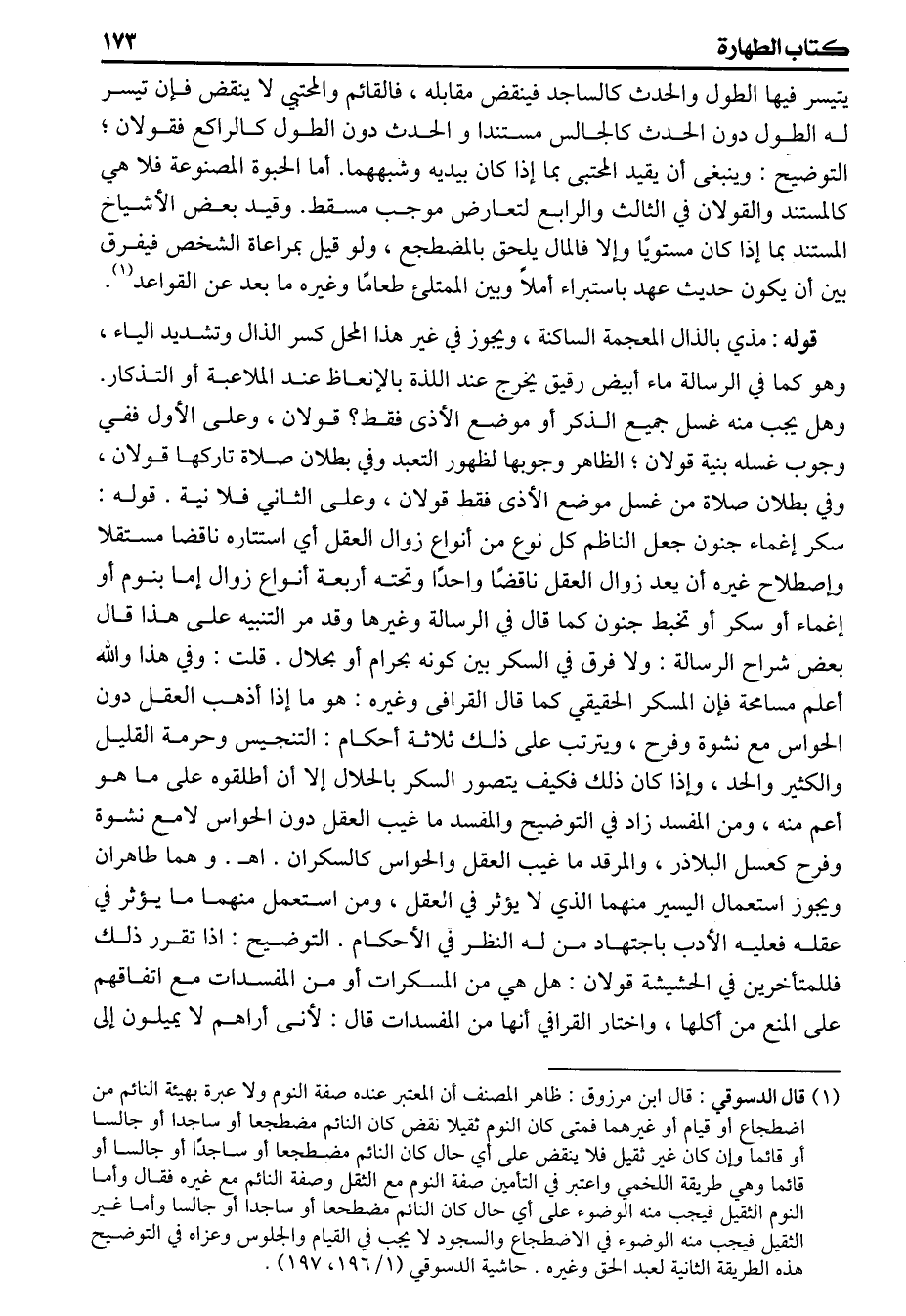 يتيسر فيها الطول والحدث كالساجد فينقض مقابله فالقائم والمحتبي لاينقض فإن تيسر له الطول دون الحدث كالجالس مستندا والحدث دون الطول كالراكع فقولان التوضيح وينبغى أن يقيد المحتبى بما إذا كان بيديه وشبههما. أما الحبوة المصنوعة فلا هي كالمستند والقولان في الثالث والرابع لتعارض موجب مسقط. وقيد بعض الأشياخ المستند بما إذا كان مستويا وإلا فالمال يلحق بالمضطجع ولو قيل بمراعاة الشخص فيفرق بين أن يكون حديث عهد باستبراء أملا وبين الممتلىء طعاماوغيره ما بعد عن القواعد. قوله مذي بالذال المعجمة الساكنة ويجوزفي غير هذا المحل كسرالذال وتشديد الياء وهو كما في الرسالة ماء أبيض رقيق يخرج عند اللذة بالانعاظ عند الملاعبة أو التذكار. وهل يجب منه غسل جميع الذكر أو موضع الأذى فقط قولان وعلى الأول ففي وجوب غسله بنية قولان الظاهر وجوبها لظهور التعبد وفي بطلان صلاة تاركها قولان وفي بطلان صلاة من غسل موضع الأذى فقط قولان وعلى الثاني فلا نية قوله سكر إغماء جنون جعل الناظم كل نوع من أنواع زوال العقل أي استتاره ناقضا مستقلا وإصطلاح غيره أن يعد زوال العقل ناقضا واحدا وتحته أربعة أنواع زوال إما بنوم أو إغماء أو سكر أو تخبط جنون كما قال في الرسالة وغيرها وقد مر التنبيه على هذا قال بعض شراح الرسالة ولافرق في السكر بين كونه بحرام أو بحلال قلت وفي هذا والله أعلم المسامحة فإن المسكر الحقيقي كما قال القرافى وغيره هو ما إذا ذهب العقل دون الحواس مع نشوة وفرح ويترتب على ذلك ثلاثة أحكام التنجيس وحرمة القليل والكثير والحد وإذا كان ذلك فكيف يتصور السكر بالحلال إلا أن أطلقوه على ما هو أعم منه ومن المفسد زاد في التوضيح والمفسد ما غيب العقل دون الحواس لامع نشوة وفرح كعسل البلاذر والمرقد ما غيب العقل والحواس كالسكران اهـ وهما طاهران ويجوز استعمال اليسير منهما الذي لا يؤثر في العقل ومن استعمل منهما ما يؤثر في عقله فعليه الأدب باجتهاد من له النظر في الأحكام التوضيح اذا تقرر ذلك فللمتأخرين في الحشيشة قولان هل هي من المسكرات أو من المفسدات مع اتفاقهم على المنع من أكلها واختار القرافي أنها من المفسدات قال لأنى أراهم لايميلون إلى