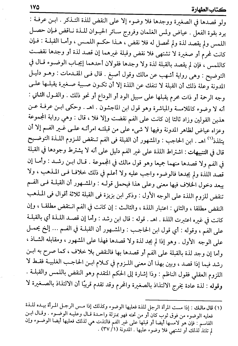 ولو قصدها في الصغيرة ووجدها فلا وضوء إلا على النقض للذة التذكر ابن عرفة يرد بقوة الفعل عياض ولمس الغلمان وفروج سائر الحيوان للذة ناقض فإن حصل اللمس ولم يقصد لذة ولم تحصل له فلا نقض هذا حكم اللمس وأما القبلة فإن كانت لمحرم أو صغيرة لاتشتهى فلا نقض وقبلة غيرهما إن قصد لذة أو وجدها نقضت كاللمس فإن لم يقصد بالقبلة لذة ولا وجدها فقولان أحدهما إيجاب الوضوء قال في التوضيح وهى رواية أشهب عن مالك وقول أصبغ قال فى المقدمات وهو دليل المدونة وعلة ذلك أن القبلة لا تنفك عن اللذة إلا أن تكون صبية صغيرة يقبلها على وجه الرحمة أو ذات محرم يقبلها على سبيل الود أو الوداع أو نحو ذلك والقول الثاني أنه لاوضوء كالملامسة والمباشرة وهو قول ابن الماجشون اهـ وحكى ابن عرفة عن هذين القولين وزاد ثالثا إن كان على الفم نقضت وإلا فلا قال وهي رواية المجموعة وعزاه عياض لظاهر المدونة وفيها لاشأ على من قبلته امرأته على غير الفم إلا أن يلتذ اهـ ابن الحاجب والمشهور أن القبلة فى الفم تنقض للزوم اللذة التوضيح قال في التنبيهات اشتراط اللذة على غير الفم دليل على أنه لايشترط وجودها في القبلة في الفم ولا قصدها منهما جميعا وهو قول مالك في المجموعة قال ابن رشد وأما إن قصد اللذة ولم يجدها فالوضوء واجب عليه ولا أعلم في ذلك خلافا فى المذهب ولا يبعد دخول الخلاف فيها معنى وعلى هذا فيحمل قوله والمشهور أن القبلة فى الفم تنقض للزوم اللذة على الوجه الأول وذكر ابن بزيزة فى القبلة ثلاثة أقوال فى المذهب النقض مطلقا والثاني اعتبار اللذة والثالث إن كانت في الفم انتقض مطلقا وإن كانت في غيره اعتبرت اللذة اهـ قوله قال ابن رشد وأما إن قصد اللذة أي بالقبلة على الفم وقوله أي قول ابن الحاجب والمشهور أن القبلة في الفم الخ يحمل على الوجه الأول وهو إذا لم يجد لذة ولا قصدها فهذا على المشهور ومقابله الشاذ وأما إن وجد لذة بالقبلة على الفم أو قصدها بها فالنقض بلا خلاف كما صرح به ابن رشد فيما إذا قصد وبين بهذا أن معنى اللزوم في كلام ابن الحاجب الغلبية فقط لا اللزوم العقلي فقول الناظم وذا إشارة إلى الحكم المتقدم وهو النقض باللمس والقبلة وقوله لذة عادة يخرج الالتذاذ بالصغيرة والمحرم وقد تقدم قريبا أن الالتذاذ بالصغيرة لا