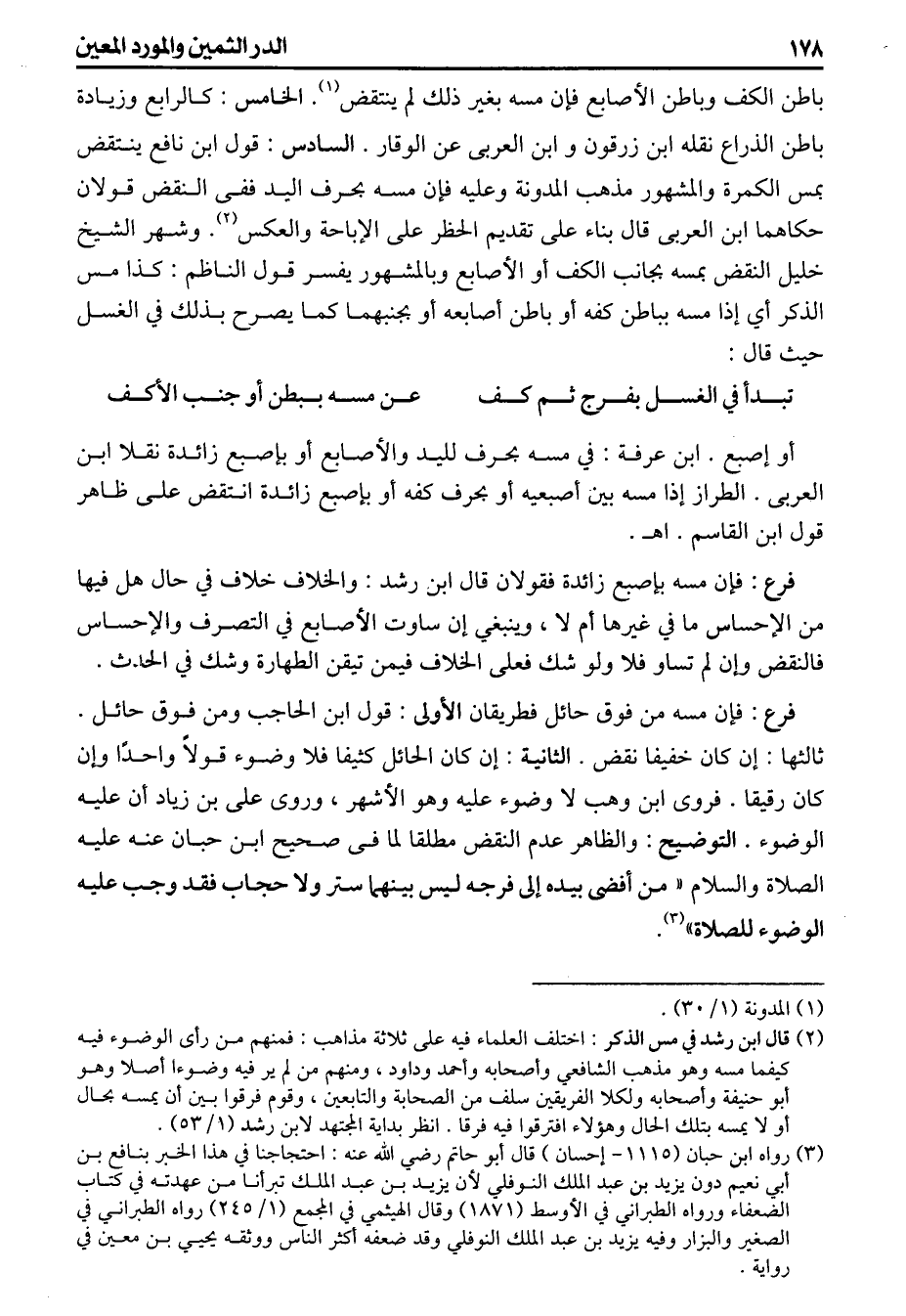 باطن الكف وباطن الأصابع فإن مسه بغير ذلك لم ينتقض الخامس كالرابع وزيادة باطن الذراع نقله ابن زرفون وابن العربى عن الوقار السادس قول ابن نافع ينتقض بمص الكمرة والمشهور مذهب المدونة وعليه فإن مسه بحرف اليد ففى النقض قولان حكاهماابن العربى قال بناء على تقديم الحظر على الإباحة والعكس وشهر الشيخ خليل النقض بمسه بجانب الكف أو الأصابع وبالمشهور يفسر قول الناظم كذا مس الذكر أي إذا مسه بباطن كفه أو باطن أصابعه أو بجنبهما كما يصرح بذلك في الغسل حيث قال