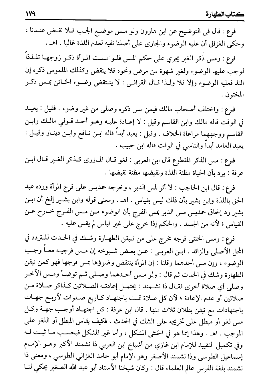 (فرع) قال فى التوضيح عن ابن هارون ولو مس موضع الجب فلا نقض عندنا وحكى الغزالى أن عليه الوضوء والجارى على أصلنا نفيه لعدم اللذة غالبا اهـ (فرع) ومس ذكر الغير يجري على حكم المس فلو مست المرأة ذكر زوجها تلذذاً الوجب عليها الوضوء ولغير شهوة من مرض ونحوه فلا ينقض وكذلك الملموس ذكره إن نذ فعليه الوضوء وإلا فلا ولذا قال القرافى لا ينتقض وضوء الخاتن بمس ذكر المختون (فرع) واختلف أصحاب مالك فيمن مس ذكره وصلى من غير وضوء فقيل يعيد في الوقت قاله مالك وابن القاسم وقيل لا إعادة عليه وهو أحد قولي مالك وابن القاسم ووجههما مراعاة الخلاف وقيل يعيد أبداً قاله ابن نافع وابن دينار وقيل يعيد العامد أبداً والناسي في الوقت قاله ابن حبيب (فرع) مس الذكر المقطوع قال ابن العربى لغو قال المازرى كذكر الغير قال ابن عرفة يرد بأن الحياة مظنة اللذة ونقيضها مظنة نقيضها (فرع) قال ابن الحاجب لا أثر لمس الدبر وخرجه حمديس على فرج المرأة ورده عبدالحق باللذة وابن بشير بأن ذلك ليس بقياس اهـ ومعنى قوله وابن بشير الخ أن ابن بشير رد إلحاق حمديس مس الدبر بمس الفرج بأن الوضوء من مس الفرج خارج عن القياس لأنه من الجسد والحكم إذا خرج على غير قياس لم يقس عليه (فرع) ومس الخنثى فرجه مخرج على من تيقن الطهارة وشك في الحدث للتردد في المحل الأصلى والزائد ابن العربى عن بعض شيوخه إن مس فرجيه معاً وجب الوضوء وإن مس أحدهما وقلنا إن المرأة ينتقض وضوؤها بمس فرجها فهو كمن تيقن الطهارة وشك في الحدث ثم قال ولو مس أحدهما وصلى ثم توضأ ومس الآخر وصلى أي صلاة أخرى فقال ذانشمند يحتمل إعادته الصلاتين كذاكر صلاة من صلاتين أو عدم الإعادة لأن كل صلاة تمت باجتهاد كأربع صلوات لأربع جهات باجتهادات مع تيقن بطلان ثلاث منها قال ابن عرفة كل اجتهاد أوجب جهة وكل مس لغو أو مبطل على تخريجه على الشك في الحدث فكيف يقاس المبطل أواللغو على الموجب اهـ وهذا إنما هو في الخنثى المشكل وأما غير المشكل فبحسب ما ثبت له وفي تكميل التقييد للامام ابن غازي من أشياخ ابن العربي ذانشمند الأكبر وهو الإمام إسماعيل الطوسى وذانشمند الأصغر وهو الامام أبو حامد الغزالي الطوسي ومعنى ذانشمند بلغة الفرس عالم العلماء قال وكان شيخنا الأستاذ أبو عبد الله الصغير يحكي لنا