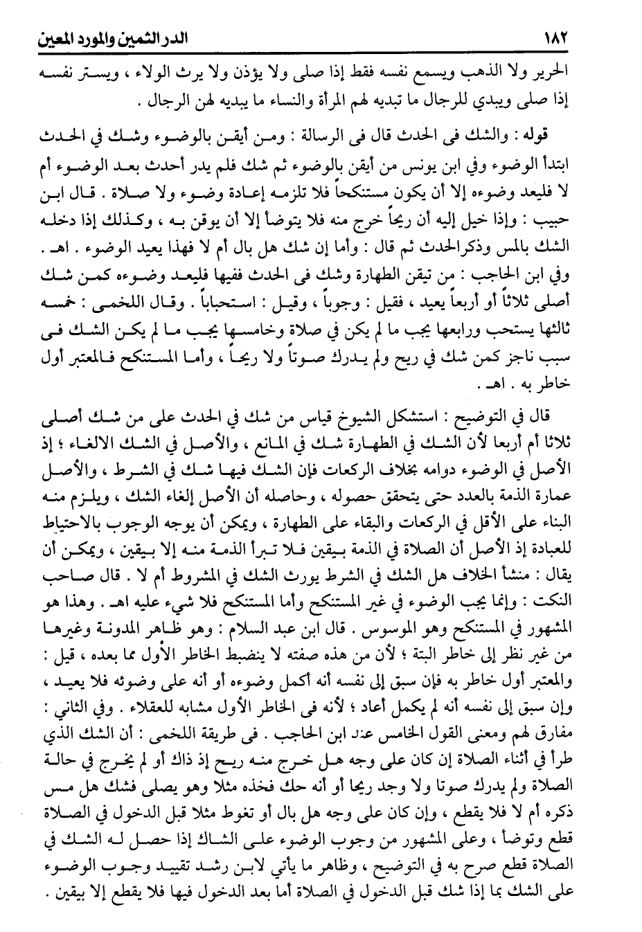 الحرير ولا الذهب ويسمع نفسه فقط إذا صلى ولا يؤذن ولا يرث الولاء ويستر نفسه إذا صلى ويبدي للرجال ماتبديه لهم المرأة والنساء ما يبديه لهن الرجال قوله والشك فى الحدث قال فى الرسالة ومن أيقن بالوضوء وشك في الحدث ابتدأ الوضوء وفي ابن يونس من أيقن بالوضوء ثم شك فلم يدر أحدث بعد الوضوء أم لا فليعد وضوءه إلا أن يكون مستنكحاً فلا يلزمه إعادة وضوء ولا صلاة قال ابن حبيب وإذا خيل إليه أن ريحاً خرج منه فلا يتوضأ إلا أن يوقن به وكذلك إذا دخله الشك بالمس وذكرالحدث ثم قال وأما إن شك هل بال أم لا فهذا يعيد الوضوء اهـ. وفي ابن الحاجب من تيقن الطهارة وشك فى الحدث ففيها فليعد وضوءه كمن شك أصلى ثلاثاً أو أربعاً يعيد فقيل وجوباً وقيل استحباباً وقال اللخمى خمسه ثالثها يستحب ورابعها يجب ما لم يكن في صلاة وخامسها يجب مالم يكن الشك فى سبب ناجز كمن شك في ريح ولم يدرك صوتاً ولا ريحاً وأما المستنكح فالمعتبر أول خاطر به اهـ. قال في التوضيح استشكل الشيوخ قياس من شك في الحدث على من شك أصلى ثلاثا أم أربعا لأن الشك في الطهارة شك في المانع والأصل في الشك الالغاء إذ الأصل في الوضوء دوامه بخلاف الركعات فإن الشك فيها شك في الشرط والأصل عمارة الذمة بالعدد حتى يتحقق حصوله وحاصله أن الأصل الغاء الشك ويلزم منه البناء على الأقل في الركعات والبقاء على الطهارة ويمكن أن يوجه الوجوب بالاحتياط للعبادة إذ الاصل أن الصلاة في الذمة بيقين فلا تبرأ الذمة منه إلا بيقين ويمكن أن يقال منشأ الخلاف هل الشك في الشرط يورث الشك في المشروط أم لا قال صاحب النكت وإنما يجب الوضوء في غير المستنكح وأما المستنكح فلا شيء عليه اهـ. وهذا هو المشهور في المستنكح وهو الموسوس قال ابن عبد السلام وهو ظاهر المدونة وغيرها من غير نظر إلى خاطر البتة لأن من هذه صفته لا ينضبط الخاطر الاول مما بعده قيل والمعتبر أول خاطر به فإن سبق إلى نفسه أنه أكمل وضوئه أو أنه على وضوئه فلا يعيد وإن سبق إلى نفسه أنه لم يكمل أعاد لأنه فى الخاطر الأول مشابه للعقلاء وفي الثاني مفارق لهم ومعنى القول الخامس عند ابن الحاجب فى طريقة اللخمى أن الشك الذي طرأ في أثناء الصلاة إن كان على وجه هل خرج منه ريح إذ داك أو لم يخرج في حالة الصلاة ولم يدرك صوتا ولا وجد ريحا أو أنه حك فخذه مثلا وهو يصلى فشك هل مس ذكره أم لا فلا يقطع وإن كان على وجه هل بال أو تغوط مثلا قبل الدخول في الصلاة قطع وتوضأ وعلى المشهور من وجوب الوضوء على الشاك إذا حصل له الشك في الصلاة قطع صرح به في التوضيح وظاهر ما يأتي لابن رشد تقييد وجوب الوضوء على الشك بما إذا شك قبل الدخول في الصلاة أما بعد الدخول فيها فلا يقطع إلابيقين
