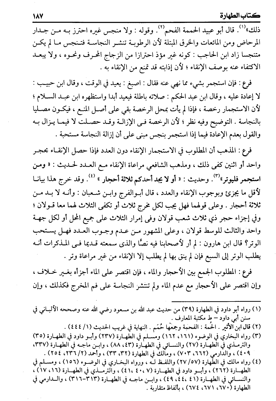 ذلك» قالأبو عبيدالحممة الفحم وقوله ولا منجس غيره احترز به من جدار المرحاض ومن المائعات والخرق المبتلة لأن الرطوبة تنشر النجاسة فتنجس ما لم يكن متنجسا زاد ابن الحاجب كونه غير مؤذ احترازا من الزجاج المحرف ونحوه ولا يبعد الاكتفاء عنه بوصف الانقاء لأن إذابته قد تمنع من الإنقاء به (فرع) فإن استجمر بشيء مما نهي عنه فقال اصبغ يعيد في الوقت وقالابن حبيب لا إعادة عليه وقالابن عبد الحكم صلاته باطلة فيعيد أبدا واستظهره ابن عبد السلام لأن الاستجمار رخصة فإذا لم يأت بمحل الرخصة بقي على أصل المنع فيكون مصليا بالنجاسة التوضيح وفيه نظر لأن الرخصة فى الإزالة وقد حصلت لا فيما يزال به والقول بعدم الإعادة فيما إذا استجمر بنجس مبنى على أن إزالة النجاسة مستحبة (فرع) المذهب أن المطلوب في الاستجمار الانقاء دون العدد فإذا حصل الانقاء بحجر واحد أو اثنين كفى ذلك ومذهب الشافعي مراعاة الانقاء مع العدد لحديث ومن استجمر فليوتر وحديث أو لا يجد أحدكم ثلاثة أحجار وقد خرج هذا بيانا لأقل ما يجزىء وبوجوب الانقاء والعدد قال أبوالفرج وابن شعبان وأنه لا بد من ثلاثة أحجار وعلى قولهما فهل يجب لكل مخرج ثلاث أو تكفى الثلاث لهما معا قولان وفي إجزاء حجر ذي ثلاث شعب قولان وفى إمرار الثلاث على جميع المحل أولكل جهة واحد والثالث للوسط قولان وعلى المشهور من عدم وجوب العدد فهل يستحب الوتر قالابن هارون لم أر لأصحابنا فيه نصا والذى سمعته قديما فى المذكرات أنه يطلب الوتر إلى السبع فإن لم ينق بها لم يطلب إلا الانقاء من غير مراعاة وتر (فرع) المطلوب الجمع بين الأحجار والماء فإن اقتصر على الماء أجزأه بغير خلاف وإن اقتصر على الأحجار مع عدم الماء ولم تنتشر النجاسة على فم المخرج فكذلك وإن