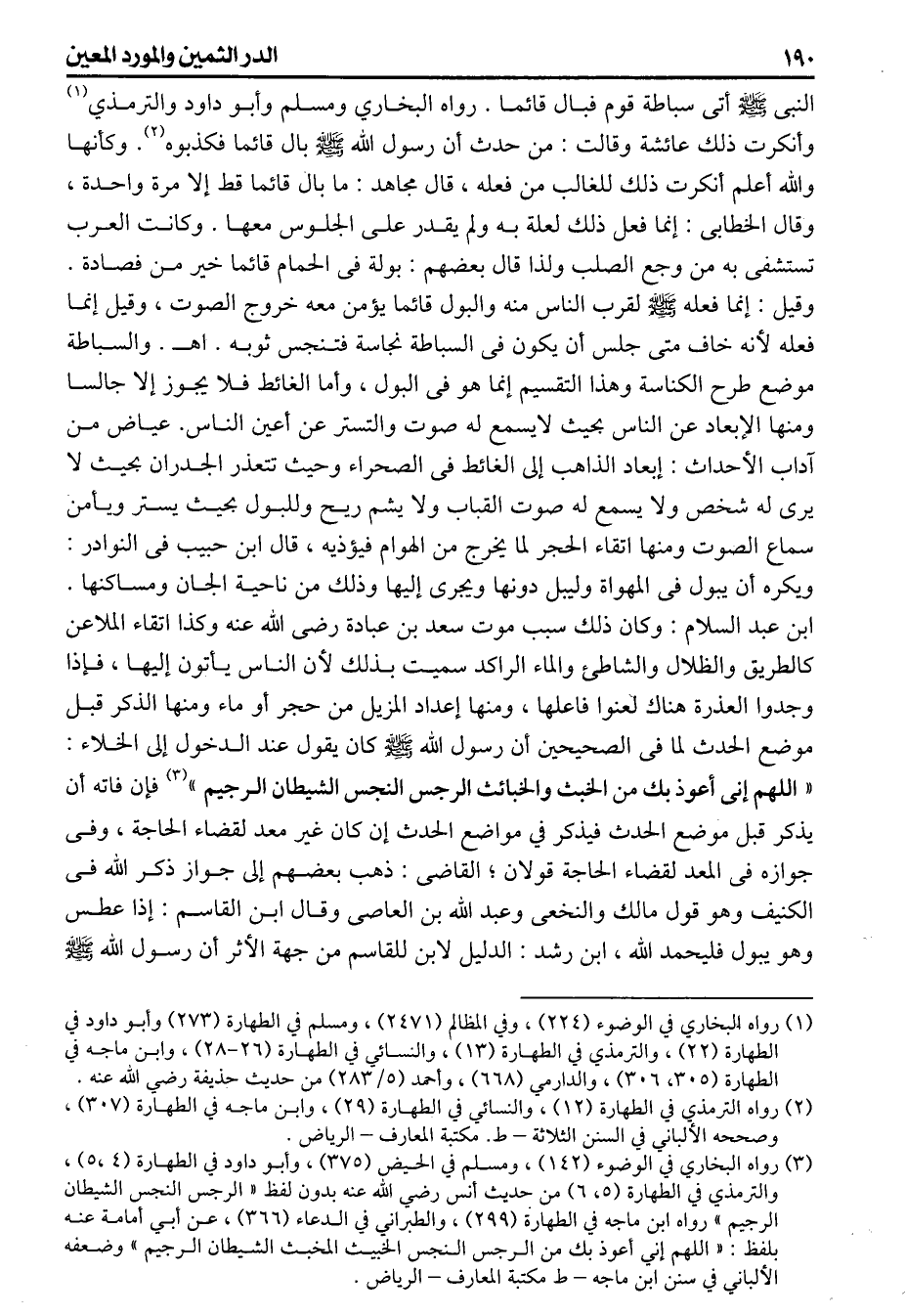 النبى أتى سباطة قوم فبال قائما» رواه البخاري ومسلم وأبو داود والترمذي وأنكرت ذلك عائشة وقالت من حدث أن رسول الله بال قائما فكذبوه وكأنها والله أعلم أنكرت ذلك للغالب من فعله قالمجاهد ما بال قائما قط إلا مرة واحدة وقال الخطابى إنما فعل ذلك لعلة به ولم يقدر على الجلوس معها وكانت العرب تستشفى به من وجع الصلب ولذا قال بعضهم بولة فى الحمام قائما خير من فصادة وقيل إنما فعله لقرب الناس منه والبول قائما يؤمن معه خروج الصوت وقيل إنما فعله لأنه خاف متى جلس أن يكون فى السباطة نجاسة فتنجس ثوبه اهـ والسباطة موضع طرح الكناسة وهذا التقسيم إنما هو فى البول وأما الغائط فلا يجوز إلا جالسا ومنها الإبعاد عن الناس بحيث لايسمع له صوت والتستر عن أعين الناس عياض من آداب الأحداث ابعاد الذاهب إلى الغائط فى الصحراء وحيث تتعذر الجدران بحيث لا يرى له شخص ولا يسمع له صوت القباب ولا يشم ريح وللبول بحيث يستر ويأمن سماع الصوت ومنها إتقاء الحجر لما يخرج من الهوام فيؤذيه قالابن حبيب فى النوادر ويكره أن يبول فى المهواة وليبل دونها ويجرى إليها وذلك من ناحية الجان ومساكنها ابن عبد السلام وكان ذلك سبب موت سعد ابن عبادة رضى الله عنه وكذا اتقاء الملاعن كالطريق والظلال والشاطأ والماء الراكد سميت بذلك لأن الناس يأتون إليها فإذا وجدوا العذرة هناك لعنوا فاعلها ومنها إعداد المزيل من حجر أو ماء ومنها الذكر قبل موضع الحدث لما فى الصحيحين أن رسول الله كان يقول عند الدخول إلى الخلاء «اللهم إنى أعوذبك من الخبث والخبائث الرجس النجس الشيطان الرجيم» فإن فاته أن يذكر قبل موضع الحدث فيذكر في مواضع الحدث إن كان غير معد لقضاء الحاجة وفى جوازه فى المعد لقضاء الحاجة قولان القاضى ذهب بعضهم إلى جواز ذكر الله فى الكنيف وهوقول مالك والنخعى وعبد الله بن العاصى وقالابن القاسم إذا عطس وهو يبول فليحمد الله ابن رشد الدليل لابن للقاسم من جهة الأثر أن رسول الله