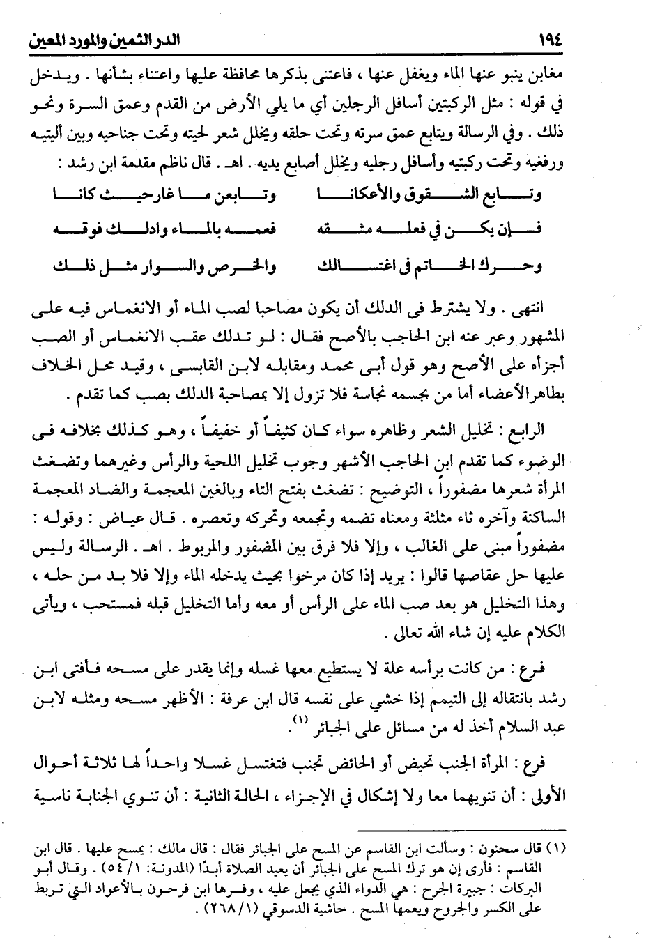 انتهى ولا يشترط فى الدلك أن يكون مصاحبا لصب الماء أو الانغماس فيه على المشهور وعبرعنه ابن الحاجب بالأصح فقال لو تدلك عقب الانغماس أو الصب أجزأه على الأصح وهو قول أبى محمد ومقابله لابن القابسى وقيد محل الخلاف بطاهرالأعضاء أما من بجسمه نجاسة فلاتزول إلا بمصاحبة الدلك بصب كما تقدم (الرابع) تخليل الشعر وظاهره سواء كان كثيفاً أو خفيفاً وهو كذلك بخلافه فى الوضوء كما تقدم ابن الحاجب الأشهر وجوب تخليل اللحية والرأس وغيرهما وتضغث المرأة شعرها مضفوراً التوضيح تضغث بفتح التاء وبالغين المعجمة والضاد المعجمة الساكنة وآخره ثاء مثلثة ومعناه تضمه وتجمعه وتحركه وتعصره قال عياض وقوله مضفوراً مبنى على الغالب وإلا فلا فرق بين المضفور والمربوط اهـ الرسالة وليس عليها حل عقاصها قالوا يريد إذا كان مرخوا بحيث يدخله الماء وإلا فلا بد من حله وهذا التحليل هو بعد صب الماء على الرأس أو معه وأما التخليل قبله فمستحب ويأتى الكلام عليه إن شاء الله تعالى (فرع) من كانت برأسه علة لا يستطيع معها غسله وإنما يقدر على مسحه فأفتى ابن رشد بانتقاله إلى التيمم إذا خشي على نفسه قالابن عرفة الأظهر مسحه ومثله لابن عبد السلام أخذ له من مسائل على الجبائر (فرع) المرأة الجنب تحيض أوالحائض تجنب فتغتسل غسلا واحداً لها ثلاثة أحوال (الأولى) أن تنويهما معا ولا إشكال في الاجزاء (الحالة الثانية) أن تنوي الجنابة ناسية