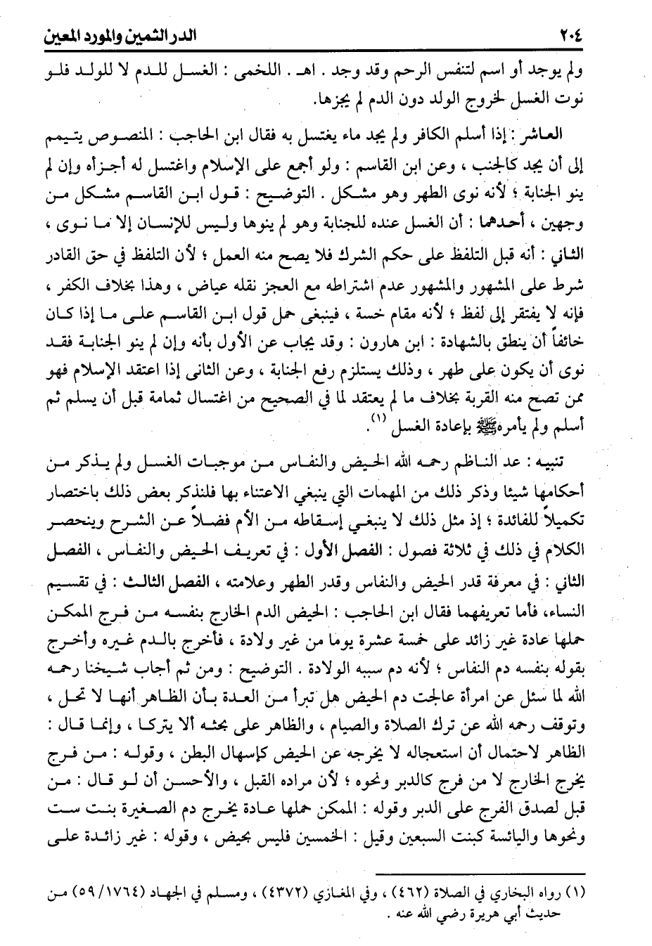 ولم يوجد أو اسم لتنفس الرحم وقد وجد اهـ اللخمى الغسل للدم لا للولد فلو نوت الغسل لخروج الولد دون الدم لم يجزها. العاشر إذا أسلم الكافر ولم يجد ماء يغتسل به فقال ابن الحاجب المنصوص يتيمم إلى أن يجد كالجنب وعن ابن القاسم ولو أجمع على الإسلام واغتسل له أجزأه وإن لم ينو الجنابة لأنه نوى الطهر وهو مشكل التوضيح قول ابن القاسم مشكل من وجهين أحدهما أن الغسل عنده للجنابة وهو لم ينوها وليس للإنسان إلا ما نوى الثاني أنه قبل التلفظ على حكم الشرك فلا يصح منه العمل لأن التلفظ في حق القادر شرط على المشهور والمشهور عدم اشتراطه مع العجز نقله عياض وهذا بخلاف الكفر فانه لا يفتقر إلى لفظ لأنه مقام خمسة فينبغى حمل قول ابن القاسم على ما إذا كان خائفاً أن ينطق بالشهادة ابن هرون وقد يجاب عن الأول بأنه وإن لم ينو الجنابة فقد نوى أن يكون على طهر وذلك يستلزم رفع الجنابة وعن الثانى إذا اعتقد الإسلام فهو ممن تصح منه القربة بخلاف ما لم يعتقد لما في الصحيح من اغتسال ثمامة قبل أن يسلم ثم أسلم ولم يأمره بإعادة الغسل (تنبيه) عد الناظم رحمه الله الحيض والنفاس من موجبات الغسل ولم يذكر من أحكامها شيئا وذكر ذلك من المهمات التي ينبغي الاعتناء بها فلنذكر بعض ذلك باختصار تكميلاً للفائدة إذ مثل ذلك لا ينبغي إسقاطه من الأم فضلاً عن الشرح وينحصر الكلام في ذلك في ثلاثة فصول الفصل الأول في تعريف الحيض والنفاس الفصل الثاني في معرفة قدر الحيض والنفاس وقدر الطهر وعلامته الفصل الثالث في تقسيم النساء، فأما تعريفهما فقال ابن الحاجب الحيض الدم الخارج بنفسه من فرج الممكن حملها عادة غير زائد على خمسة عشرة يوما من غير ولادة فأخرج بالدم غيره وأخرج بقوله بنفسه دم النفاس لأنه دم سببه الولادة التوضيح ومن ثم أجاب شيخنا رحمه الله لما سئل عن امرأة عالجت دم الحيض هل تبرأ من العدة بأن الظاهر أنها لا تحل وتوقف رحمه الله عن ترك الصلاة والصيام والظاهر على بحثه أن لا يتركا وإنما قال الطاهر لاحتمال أن استعجاله لا يخرجه عن الحيض كإسهال البطن وقوله من فرج يخرج الخارج لا من فرج كالدبر ونحوه لأن مراده القبل والأحسن أن لو قال من قبل لصدق الفرج على الدبر وقوله الممكن حملها عادة يخرج دم الصغيرة بنت ست ونحوها واليائسة كبنت السبعين وقيل الخمسين فليس بحيض وقوله غير زائدة على