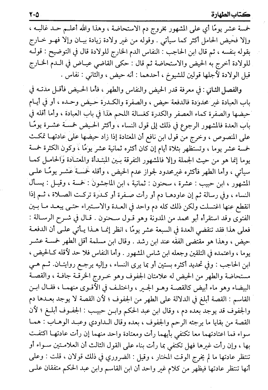 خمسة عشر يوما أي على المشهور بخروج دم الاستحاضة وهذا والله أعلم حد غالبه وإلا فحيض الحامل أكثر كما سيأتي وقوله من غير ولادة زيادة بيان وإلا فهو خارج بقوله بنفسه ثم قال ابن الحاجب النفاس الدم الخارج للولادة قال في التوضيح قوله للولادة أخرج به الحيض والاستحاضة ثم قال حكى القاضي عياض في الدم الخارج قبل الولادة لأجلها قولين للشيوخ أحدهما أنه حيض والثاني نفاس والفصل الثاني في معرفة قدر الحيض والنفاس والطهر فأما الحيض فأقل مدته في باب العبادة غير محدودة فالدفعة حيض والصفرة والكدرة حيض وحده أو في أيام حيضها والصفرة كماء العصفر والكدرة كغسالة اللحم هذا في باب العبادة وأما أقله في باب العدة فالمشهور الرجوع في ذلك إلى قول النساء وأكثر الحيض خمسة عشرة يوما على المنصوص وخرج من قول ابن نافع أن المعتادة إذا زاد حيضها على عادتها تمكث خمسة عشر يوما وتستظهر بثلاة أيام إن كان أكثره ثماية عشر يوما وكون الكثرة خمسة يوما إ نما هو من حيث الجملة وإلا فالمشهور التفرقة بين المبتدأة والمعتادة والحامل كما سيأتي وأما الطهر فأكثره غيرمحدود لجواز عدم الحيض وأقله خمسة عشر يوما على المشهور ابن حبيب عشرة سحنون ثمانية ابن الماجشون خمسة وقيل يسأل النساء وفي الرسالة ثم إن عاودها دم أو رأت صفرة أو كدرة تركت الصلاة ثم إذا انقطع عنها اغتسلت ولكن ذلك كله دم واحد في العدة والاستبراء حتى يبعد ما بين الفتوى وقد استقراه أبو محمد من المدونة وهو قول سحنون قال في شرح الرسالة فعلى هذا فقد تنقضي العدة في السبعة عشر يوما انظر إنما هذا يأتي على أن الدفعة حيض وهذا هو مقتضى الفقه عند ابن رشد وقال ابن مسلة أقل الطهر خمسة عشر يوما واعتمده في التلقين وجعله ابن شأس المشهور وأما النفاس فلا حد لأقله كالحيض ابن الحاجب وفي تحديد أكثره بستين أو بما يرى النساء وإليه يرجع روايتان. ثم هي مستحاضة والطهر من الحيض له علامتان الجفوف وهو خروج الخرقة جافة والقصة البيضاء وهو ماء أبيض كالقصة وهو الجير واختلف في الأقوى منهما فقال ابن القاسم القصة أبلغ في الدلالة على الطهر من الجفوف لأن القصة لا يوجد بعدها دم والجفوف قد يوجد بعده دم وقال ابن عبد الحكم وابن حبيب الجفوف أبلغ لأن القصة من بقايا ما يرجئه الرحم والجفوف بعده وقال الداودي وعبد الوهاب هما سواء فما اعتادتهما معا تكتفي بأيهما رأت ومعتادة واحد منهما إن رأت عادتها