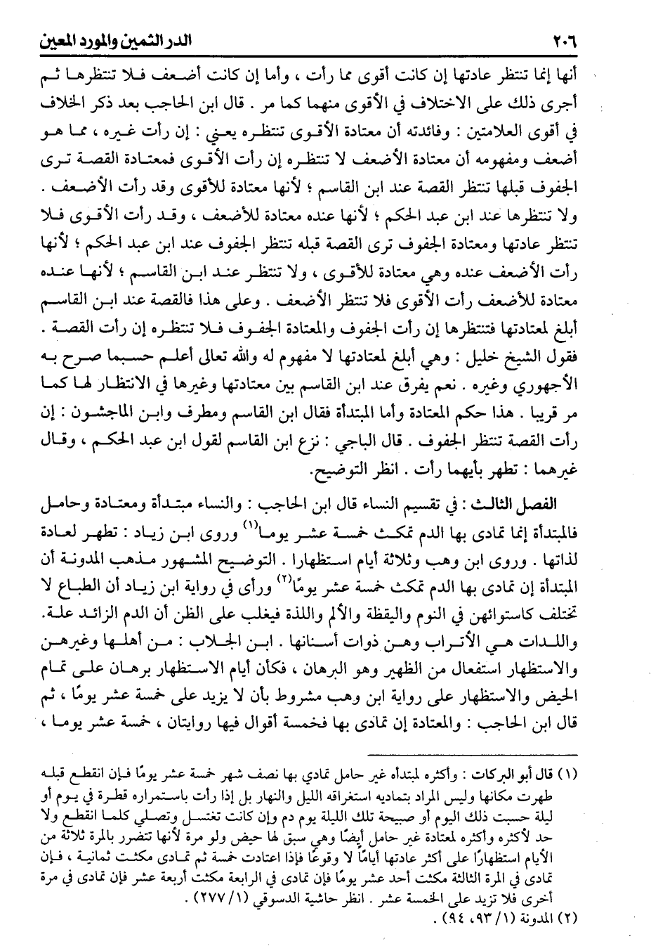 أنها إنما تنتظر عادتها إن كانت أقوى مما رأت وأما إن كانت أضعف فلا تنتظرها ثم أجرى ذلك على الاختلاف في الأقوى منهما كما مر قال ابن الحاجببعد ذكر الخلاف في أقوى العلامتين وفائدته أن معتادة الاقوى تنتظره يعني إن رأت غيره، مما هو أضعف ومفهومه أن معتادة الأضعف لا تنتظره إن رأت الأقوى فمعتادة القصة ترى الجفوف قبلها تنتظر القصة عند ابن القاسم لأنها معتادة للأقوى وقد رأت الأضعف ولا تنتظرها عند ابن عبد الحكم لأنها عنده معتادة للأضعف وقد رأت الأقوى فلا تنتظر عادتها ومعتادة الجفوف ترى القصة قلبه تنتظر الجفوف عند ابن عبد الحكم لأنها رأت الأضعف عنده وهي معتادة للأقوى ولا تنتظر عند ابن القاسم لأنها عنده معتادة للأضعف رأت الأقوى فلا تنتظر الأضعف وعلى هذا فالقصة عند ابن القاسم أبلغ لمعتادتها فتنتظرها إن رأت الجفوف والمعتادة الجفوف فلا تنتظره إن رأت القصة فقول الشيخ خليل وهي أبلغ لمعتادتها لامفهوم له والله تعالى أعلم حسبما صرح به الأجهوري وغيره نعم يفرق عند ابن القاسم بين معتادتها وغيرها في الانتظار لها كما مر قريبا هذا حكم المعتادة و (أما المبتدأة فقال ابن القاسم ومطرف وابن الماجشون إن رأت القصة تنتظر الجفوف قال الباجي نزع ابن القاسم لقول ابن عبد الحكم وقال غيرهما تطهر بأيهما رأت انظر التوضيح. الفصل الثالث في تقسيم النساء قال ابن الحاجب والنساء مبتدأة ومعتادة وحامل فالمبتدأة إنما تمادى بها الدم تمكث خمسة عشر يوما وروى بن زياد تطهر لعادة لداتها وروى ابن وهب وثلاثة أيام استظهارا التوضيح المشهور مذهب المدونة أن المبتدأة إن تمادى بها الدم تمكث خمسة عشر يوما