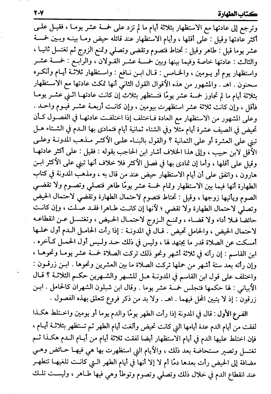 وترجع إلى عادتها مع الاستظهار بثلاثة أيام ما لم تزد على خمسة عشر يوما فقيل على أكثر عادتها وقيل على أقلها وأيام الاستظهار عند قائله حيض وما بينه وبين خمسة عشر يوما قيل طاهر وقيل تحتاط فتصوم وتقضى وتصلي وتمنع الزوج ثم تغتسل ثانيا والثالث عادتها وفيما بينها وبين خمسة عشر القولان والرابع خمسة عشر واستظهار يوم أو يومين والخامس قال ابن نافع واستظهار ثلاثة أيام وأنكره سحنون اهـ والمشهور من هذه الأقوال القول الثاني أنها تمكث عادتها مع الاستظهار بلاثة أيام ما لم تجاوز خمسة عشر يوما فتستظهر بثلاثة إن كانت عادتها اثني عشر يوما فأقل وإن كانت ثلاثة عشر استظهرت بيومين وإن كانت أربعة عشر فيوم واحد وعلى المشهور من الاستظهار مع العادة فاختلف إذا اختلفت عادتها في الفصول كأن تحيض في الصيف عشرة أيام مثلا وفي الشتاء ثمانية أيام فتمادى بها الدم في الشتاء هل تبني على العشرة أو الثمانية والقول بالبناء على الأكثر مذهب المدونة وعلى الأقل لابن حبيب وإلى هذا الخلاف أشار ابن الحاجب بقوله فقيل على أكثر عادتها وقيل على أقلها وأما إن تمادى بها في فصل الأكثر فلا خلاف أنها تبني على الأكثر ابن هرون واتفق على أن أيام الاستظهار حيض عند من قال به ومذهب المدونة في كتاب الطهارة أنها فيما بين الاستظهار وتمام خمسة عشر يوما ظاهر فتصلي وتصوم ولا تقضي الصوم ويأتيها زوجها وقيل تحتاط فتصوم لاحتمال الطهارة وتقضي لاحتمال الحيض وتصلي لاحتمال الطهارة ولا تقضي لأنها كانت طاهرا فقد صلت وإن كانت حائضا فلا أداء ولا قضاء وتمنع الزوج لاحتمال وتغتسل عن انقطاعه لاحتمال الحيض والحامل تحيض قال في المدونة إذا رأت الحامل الدم أول حملها أمسكت عن الصلاة قدر ما يجتهد لها وليس في ذلك حد وليس أول الحمل كآخره ابن القاسم إن رأته في ثلاثة أشهر ونحو ذلك تركت الصلاة خمسة عشر يوما ونحوها وإن رأته بعد ستة أشهر من حملها تركت الصلاة ما بين العشرين ونحوها ابن زرقون واختلف على قول ابن القاسم في المدونة هل للشهر والشهرين حكم الثلاثة قال الأبياني لها حكمها فتجلس خمسة عشر يوما وقال ابن شيلون الشهران كالحامل ابن زرقون إذ لا يتبين المحل فيهما اهـ ولا بد من ذكر فروع تتعلق بعهذه الفصول. الفرع الأول قال في المدونة إذا رأت الطهر يوما والدم يوما أو يومين واختلط هكذا لفقت من أيام الدم عدة أيامها التي كانت تحيض وألغت أيام الطهر ثم تستظهر بثلاثة أيام إن اختلط عليها الدم في أيام الاستظهار أيضا لفقت ثلاثة أيام من أيام الدم هكذا ثم تغتسل وتصير مستحاضة بعد ذلك والأيام التي استظهرت بها هي فيها حائض وهي مضافة إلى الحيض رأت بعدها دما أم لا إلا أنها في أيام الطهر التي كانت تلغيها تتطهر عند انقطاع الدم في خلال ذلك وتصلي وتصوم وتوطأ وهي فيها طاهر وليست تلك