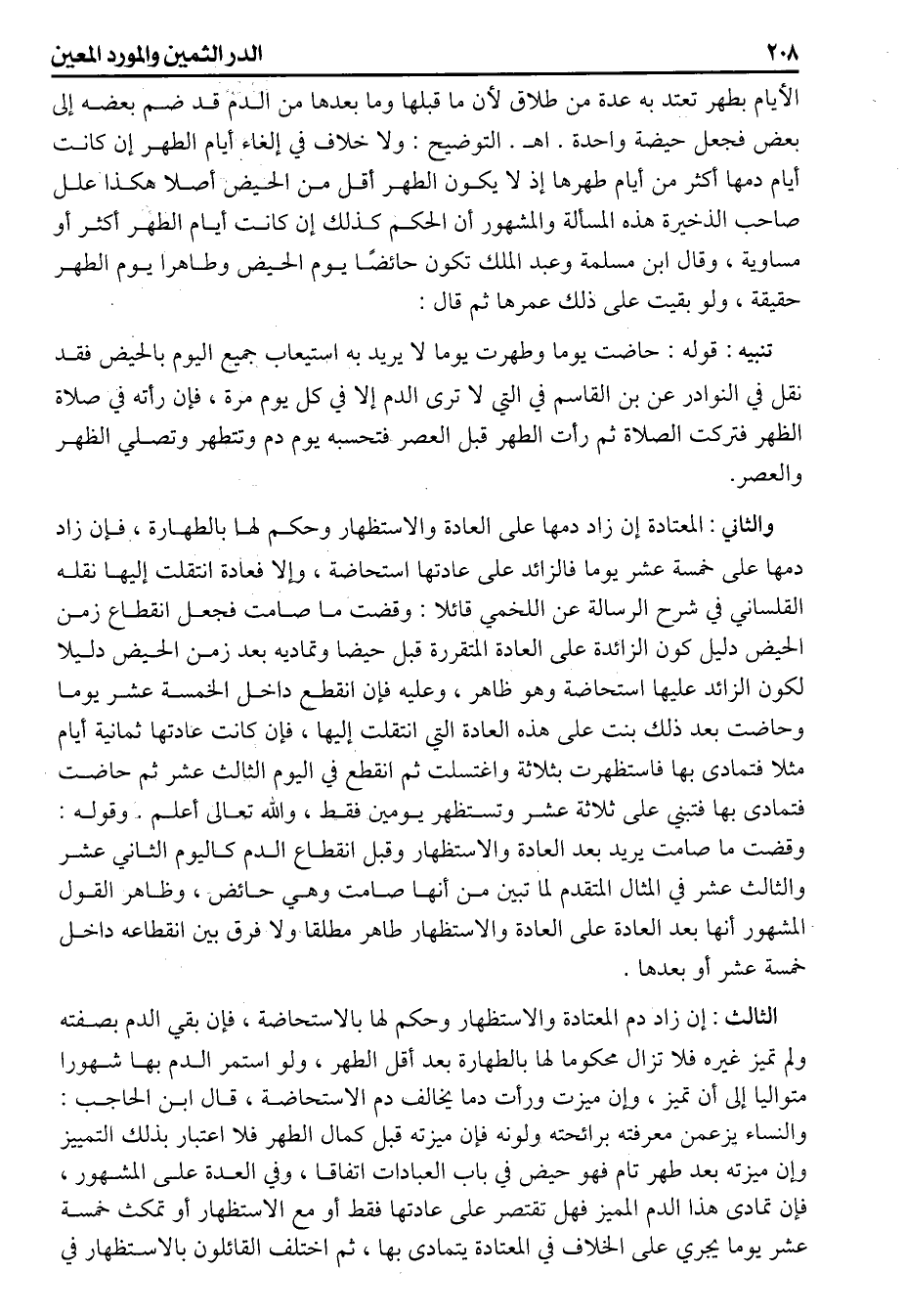 الأيام بطهر تعتد به عدة من طلاق لأن ما قبلها وما بعدها من الدم قد ضم بعضه إلى بعض فجعل حيضة واحدة اهـ التوضيح ولا خلاف في إلغاء أيام الطهر إن كانت أيام دمها أكثر من أيام طهرها إذ لا يكون الطهر أقل من الحيض أصلا هكذا على صاحب الذخيرة هذه المسألة والمشهور أن الحكم كذلك إن كانت أيام الطهر أكثر أو مساوية وقال ابن مسلمة وعبد الملك تكون حائضا يوم الحيض وطاهرا يوم الطهر حقيقة ولو بقيت على ذلك عمرها ثم قال (تنبيه) قوله حاضت يوما وطهرت يوما لا يريد به استيعاب جميع اليوم بالحيض فقد نقل في النوادر عن بن القاسم في التي لا ترى الدم إلا في كل يوم مرة فإن رأته في صلاة الظهر فتركت الصلاة ثم رأت الطهر قبل العصر فتحسبه يوم دم وتتطهر وتصلي الظهر والعصر. والثاني المعتادة إن زاد دمها على زاد دمها على العادة والاستظهار وحكم لها بالطهارة فإن زاد دمها على خمسة عشر يوما فالزائد على عادتها استحاضة وإلا فعادة انتقلت إليها نقله القلساني في شرح الرسالة عن اللخمي قائلا وقضت ما صامت فجعل انقطاع زمن الحيض دليل كون الزائدة على العادة المتقررة قبل حيضا وتماديه بعد زمن الحيض دليلا لكون الزائد عليها استحاضة وهو ظاهر وعليه فإن انقطع داخل الخمسة عشر يوما وحاضت بعد ذلك بنت على هذه العادة التي انتقلت إليها فإن كانت عادتها ثمانية أيام مثلا فتمادى بها فاستظهرت بثلاثة واغتسلت ثم انقطع في اليوم الثالث عشر ثم حاضت فتمادى بها فتبني على ثلاثة عشر وتستظهر يومين فقط والله تعالى أعلم وقوله وقضت ما صامت يريد بعد العادة والاستظهار وقبل انقطاع الدم كاليوم الثاني عشر والثالث عشر في المثال المتقدم لما تبين من أنها صامت وهي حائض وظاهر القول المشهور أنها بعد العادة على العادة والاستظهار طاهر مطلقا ولا فرق بين انقطاعه داخل خمسة عشر أو بعدها الثالث إن زاد دم المعتادة والاستظهار وحكم لها بالاستحاضة فإن بقي الدم بصفته ولم تميز غيره فلا تزال محكوما لها بالطهارة بعد أقل الطهر ولو استمر الدم بها شهورا متواليا إلى أن تميز وإن ميزت ورأت دما يخالف دم الاستحاضة قال ابن الحاجب والنساء يزعمن معرفته برائحته ولونه فإن ميزته قبل كمال الطهر فلا اعتبار بذلك التمييز وإن ميزته بعد طهر تام فهو حيض في باب العبادات اتفاقا وفي العدة على المشهور فإن تمادى هذا الدم المميز فهل تقتصر على عادتها فقط أو مع الاستظهار أو تمكث خمسة عشر يوما يجري على الخلاف في المعتادة يتمادى بها ثم اختلف القائلون بالاستظهار في