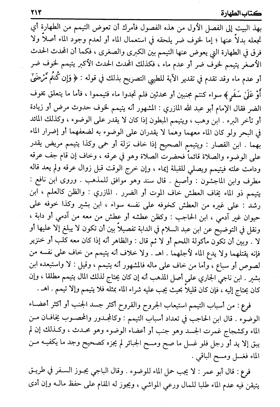 بهذ البيت إلى الفصل الأول من هذه الفصول فأمرك أن تعوض التيمم من الطهارة أي تجعله بدلاً عنها إما لخوف ضر يلحقه في استعمال الماء أو لعدم وجود الماء أصلاً ولا فرق في الطهارة التي يعوض عنها التيمم بين الكبرى والصغرى فكما أن المحدث الحدث الأصغر يتيمم لخوف ضر أو عدم ماء فكذلك المحدث الحدث الأكبر يتيمم لخوف ضر أو عدم ماء وقد تقدم في تقدير الآية للطيبي التصريح بذلك في قوله {وإن كنتم مرضى أو على سفر} سواء كنتم مجنبين أو محدثين فلم تجدوا ماء فتيمموا فأما ما يتعلق بخوف الضر فقال الإمام أبو عبد الله المازري المشهور أنه يتيمم لخوف حدوث مرض أو زيادة أو تأخر البرء ابن وهبويتيمم المبطون إذا كان لا يقدر على الوضوء وكذلك المائد في البحر ولو كان الماء معهما وهما لا يقدران على الوضوء به لضعفهما أو إضرار الماء بهما ابن القصار ويتيمم الصحيح إذا خاف نزلة أو حمى وكذا يتيمم مريض يقدر على الوضوء والصلاة قائماً فحضرت الصلاة وهو في عرقه وخاف إن قام جف عرقه ودامت علته فيتيمم ويصلي للقبلة إيماء وإن خرج الوقت قبل زوال عرقه ولم يعد قاله مطرف وابن الماجشون وأصبغ قال سند وهو موافق للمذهب وروى ابن نافعيتيمم ذو الماء يخاف العطش خاف الموت أو الضرر المازري والظن كالعلم ابن رشد على غيره من العطش كخوفه على نفسه سواء بن بشير وكذا خوفه على حيوان غير آدمي ابن الحاجب وكظن عطشه أو عطش من معه من آدمي أو دابة ونقل في التوضيح عن ابن عبد السلام في الدابة تفصيلاً بين أن تكون لا يبلغ إلا عليها أو لا وبين أن تكون مأكولة اللحم أو لا ثم قال والظاهر أنه إذا كان معه كلب أو خنزير فإنه يقتلهما ولا يدع الماء لأجلهما اهـ ولا خلاف أنه يتيمم من خاف على نفسه من لصوص أو سباع وأما من خاف على ماله فالمشهور أنه يتيمم وقيل لا واستبعده ابن بشير بن ناجي الجاري على أصل المذهب أنه إن كان يحتاج لذلك المال يتيمم مطلقا وإن كان يحتاج إليه فإن كان قليلاً بحيث يجب عليه شراء الماء بمثله فلا يتيمم وإلا تيمم اهـ (فرع) من أسباب التيمم استيعاب الجروح والقروح أكثر جسد الجنب أو أكثر أعضاء الوضوء قال ابن الحاجب في تعداد أسباب التيمم وكالمجدور والمحصوب يخافان من الماء وكشجاج غمرت الجسد وهو جنب أو أعضاء الوضوء وهو محدث وكذلك إن لم يبق إلا يد أو رجل فلو غسل ما صح ومسح الجبائر لم يجزه كصحيح وجد ما يكفيه من الماء فغسل ومسح الباقي (فرع) قال أبو عمير لا يجب حمل الماء للوضوء وقال الباجي يجوز السفر في طريق يتيقن فيه عدم الماء طلبا للمال ورعي المواشي ويجوز له المقام على حفظ ماله وإن أدى
