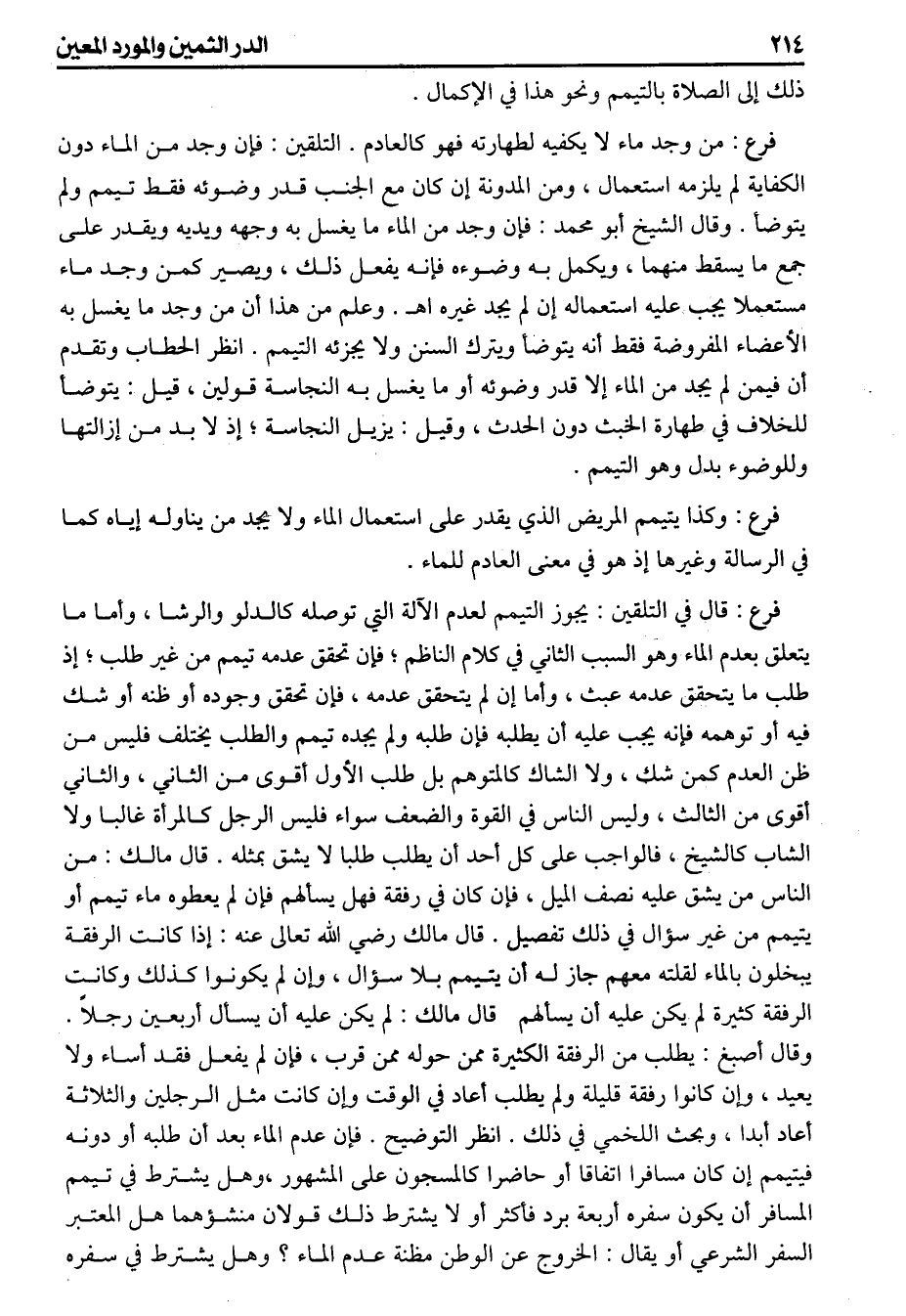 ذلك إلى الصلاة بالتيمم ونحو هذا في الإكمال (فرع) من وجد ماء لا يكفيه لطهارته فهو كالعدم التلقين فإن وجد من الماء دون الكفاية لم يلزمه استعمال ومن المدونة إن كان مع الجنب قدر وضوئه فقط تيمم ولم يتوضأ وقال الشيخ أبو محمد فإن وجد من الماء ما يغسل به وجهه ويديه ويقدر على جمع ما يسقط منهما ويكمل به وضوءه فإنه يفعل ذلك ويصير كمن وجد ماء مستعملاً يجب عليه استعماله إن لم يجد غيره اهـ وعلم من هذا أن من وجد ما يغسل به الأعضاء المفروضة فقط أنه يتوضأ ويترك السنن ولا يجزئه التيمم انظر الحطاب وتقدم أن فيمن لم يجد من الماء إلا قدر وضوئه أو ما يغسل به النجاسة قولين قيل يتوضأ للخلاف في طهارة الخبث دون الحدث وقيل يزيل النجاسة إذ لابد من إزالتها وللوضوء بدل وهو التيمم (فرع) وكذا يتيمم المريض الذي يقدر على استعمال الماء ولا يجد من يناوله إياه كما في الرسالة وغيرها إذ هو في معنى العادم للماء (فرع) قال في التلقين يجوز التيمم لعدم الآلة التي توصله كالدلو والرشا وأما ما يتعلق بعدم الماء وهو السبب الثاني في كلام الناظم فإن تحقق عدمه تيمم من غير طلب إذ طلب ما يتحقق عدمه عبث وأما إن لم يتحقق عدمه فإن تحقق وجوده أو ظنه أو شك فيه أو توهمه فإنه يجب عليه أن يطلبه فإن طلبه ولم يجده تيمم والطلب يختلف فليس من ظن العدم كمن شك ولا الشاك كالمتوهم بل طلب الأول أقوى من الثاني والثاني أقوى من الثالث وليس الناس في القوة والضعف سواء فليس الرجل كالمرأة غالبا ولا الشاب كالشيخ فالواجب على كل أحد أن يطلب طلبا لا يشق بمثله قال مالك من الناس من يشق عليه نصف الميل فإن كان في رفقة فهل يسألهم فإن لم يعطوه ماء تيمم أو يتيمم من غير سؤال في ذلك تفصيل قال مالك رضي الله تعالى عنه إذا كانت الرفقة يبخلون بالماء لقلته معهم جاز له أن يتيمم بلا سؤال وإن لم يكونوا كذلك وكانت الرفقة كثيرة لم يكن عليه أن يسألهم قال مالك لم يكن عليه أن يسأل أربعين رجلاً وقال أصبغ يطلب من الرفقة الكثيرة ممن حوله ممن قرب فإن لم يفعل فقد أساء ولا يعيد وإن كانوا رفقة قليلة ولم يطلب أعاد في الوقت وإن كانت مثل الرجلين والثلاثة أعاد أبدا وبحث اللخمي في ذلك أنظر التوضيح فإن عدم الماء بعد أن طلبه أو دونه فيتيمم إن كان مسافرا اتفاقا أو حاضرا كالمسجون على المشهور وهل يشترط في تيمم المسافر أن يكون سفره أربعة برد فأكثر أو لا يشترط ذلك منشؤهما هل المعتبر السفر الشرعي أو يقال الخروج عن الوطن مظنة عدم الماء وهل يشترط في سفره