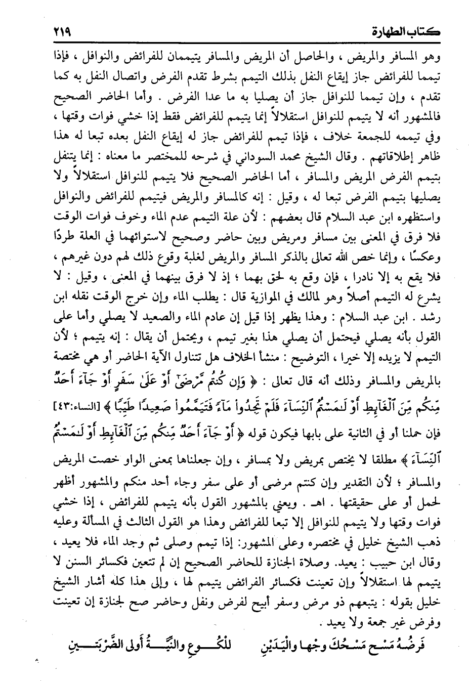 ظاهر إطلاقاتهم وقال الشيخ محمد السوداني في شرحه للمختصر ما معناه إنما يتنفل بتيمم الفرض المريض والمسافر أما الحاضر الصحيح فلا يتيمم للنوافل استقلالاً ولا يصليها بتيمم الفرض تبعا وقيل إنه كالمسافر والمريض فيتيمم للفرائض والنوافل واستظهرهابن عبد السلام قال بعضهم لأن علة التيمم عدم الماء وخوف فوات الوقت فلا فرق في المعنى بين مسافر ومريض وبين حاضر وصحيح لاستوائهما في العلة طردا وعكسا وإنما خص الله تعالى بالذكر المسافر والمريض لغلبة وقوع ذلك لهم دون غيرهم فلا يقع به إلا نادرا فإن وقع به لحق بهما إذ لا فرق بينهما في المعنى وقيل لا يشرع له التيمم أصلاً وهو لـ مالك في الموازية قال يطلب الماء وإن خرج الوقت نقله ابن رشد ابن عبد السلام وهذا يظهر إذا قيل إن عادم الماء والصعيد لا يصلي وأما على القول بأنه يصلي فيحتمل أن يصلي هذا بغير تيمم ويحتمل أن يقال إنه يتيمم لأن التيمم لا يزيده إلا خيرا التوضيح منشأ الخلاف هل تناول الآية الحاضر أو هي مختصة بالمريض والمسافر وذلك أنه قال تعالى {وإن كنتم مرضى أو على سفر أو جاء أحد منكم من الغائط أو لامستم النساء فلم تجدوا ماء فتيمموا صعيدا طيباً} فإن حملنا أو في الثانية على بابها فيكون قوله أو جاء أحد منكم من الغائط أو لامستم النساء مطلقا لا يختص بمريض ولا بمسافر وإن جعلناها بمعنى الواو خصت المريض والمسافر لأن التقدير وإن كنتم مرضى أو على سفر وجاء أحد منكم والمشهور أظهر لحمل أو على حقيقتها اهـ ويعني بالمشهور القول بأنه يتيمم للفرائض إذا خشي فوات وقتها ولا يتيمم للنوافل إلا تبعا للفرائض وهذا هو القول الثالث في المسألة وعليه ذهب الشيخ خليل في مختصره وعلى المشهور إذا تيمم وصلى ثم وجد الماء فلا يعيد وقال ابن حبيب يعيد وصلاة الجنازة للحاضر الصحيح إن لم تتعين فكسائر السنن لا يتيمم لها استقلالاً وإن تعينت فكسائر الفرائض يتيمم لها وإلى هذا كله أشار الشيخ خليل بقوله يتبعهم ذو مرض وسفر أبيح لفرض ونفل وحاضر صح لجنازة إن تعينت وفرض غير جمعه ولا يعيد