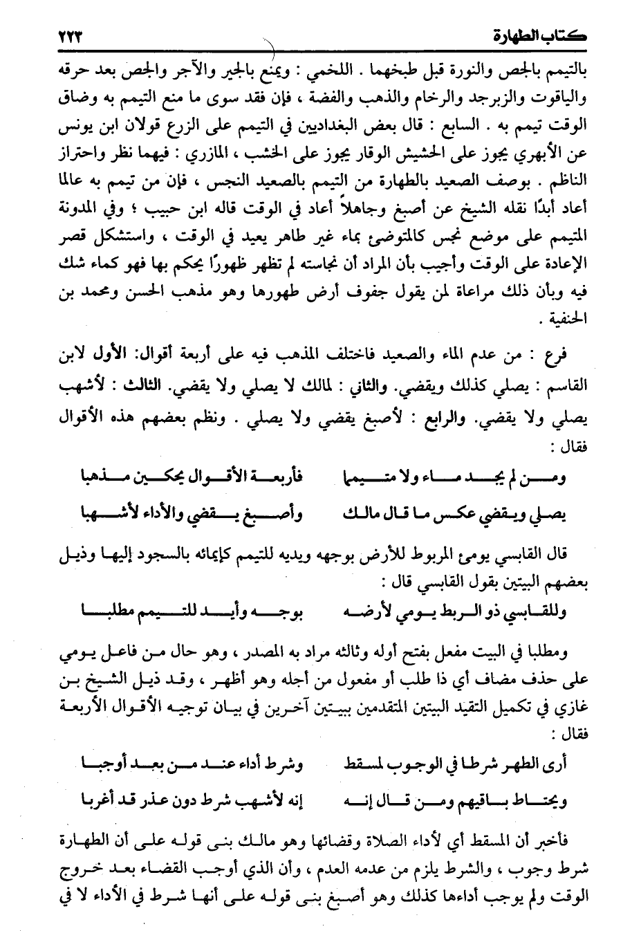 بالتيمم بالجص والنورة قبل طبخهما اللخمي ويمنع بالجير والآجر والجص بعد حرقه والياقوت والزبرجد والرخام والذهب والفضة فإن فقد سوى ما منع التيمم به وضاق الوقت تيمم به السابع قال بعض البغداديين في التيمم على الزرع قولان ابن يونس عن الأبهري يجوز على الحشيش الوقار يجوز على الخشب المازري فيهما نظر واحتراز الناظم يوصف الصعيد بالطهارة من التيمم بالصعيد النجس فإن من تيمم به عالما أعاد أبدا نقله الشيخ عن أصبغ وجاهلاً أعاد في الوقت قاله ابن حبيب وفي المدونة المتيمم على موضع نجس كالمتوضيء بماء غير طاهر يعيد في الوقت واستشكل قصر الإعادة على الوقت وأجيب بأن المراد أن نجاسته لم تظهر ظهورا يحكم بها فهو كماء شك فيه وبأن ذلك مراعاة لمن يقول جفوف أرض طهورها وهو مذهب الحسن ومحمد بن الحنفية