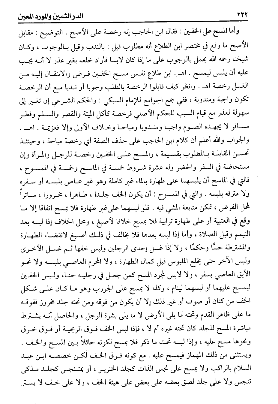 (وأما المسح على الخفين) فقال ابن الحاجب إنه رخصة على الأصح التوضيح مقبال الأصح ما وقع في مختصر ابن الطلاع أنه مطلوب قيل بالندب وقيل بالوجوب وكان شيخنا رحمه الله يحمل بالوجوب على ما إذا كان لابسا فأراد خلعه بغير عذر لا أنه يجب عليه أن يلبس ليمسح اهـ ابن طلاع نفس مسح الخفين فرض والانتقال إليه من الغسل رخصة اهـ وانظر كيف قابلوا الرخصة بالطلب وجوبا أو ندبا مع أن الرخصة تكون واجبة ومندوبة ففي جمع الجوامع للإمام السبكي والحكم الشرعي إن تغير إلى سهولة لعذر مع قيام السبب للحكم الأصلي فرخصة كأكل الميتة والقصر والسلم وفطر مسافر لا يجهده الصوم واجبا ومندوبا ومباحا وخلاف الأولى وإلا فعزيمة اهـ والجواب والله أعلم أن كلام ابن الحاجب على حذف الصفة أي رخصة مباحة وحينئذ تحسن المقابلة بالمطلوب بقسيمة والمسح على الخفين رخصة للرجل والمرأة وإن مستحاضة في السفر والحضر وله عشرة شروط خمسة في الماسح وخمسة في الممسوح فالتي في الماسح أن يلبسهما على طهارة بالماء غير كاملة وهو غير عاص بلبسه أو سفره ولا مترفه بلبسه والتي في الممسوح أن يكون الخف جلدا طاهرا مخروزا ساتراً لمحل الفرض تمكن متابعة المشي فيه فلو لبسهما علىغير طهارة فلا يمسح اتفاقا إلا ما وقع في العتبية أو على طهارة ترابية فلا يمسح خلافا ل أصبغ ومحل الخلاف إذا لبسه بعد التيمم وقبل الصلاة وأما إذا لبسه بعدها فلا يخالف في ذلك أصبغ لانقضاء الطهارة والمشترطة حسا وحكما ولا إذا غسل إحدى الرجلين ولبس خفها ثم غسل الأخرى ولبس الآخر حتى يخلع الملبوس قبل كمال الطهارة ولا المحرم العاصي بلبسه ولا نحو الآبق العاصي بسفر ولا لابس لمجرد المسح كمن جعل في رجليه حناء ولبس الخفين ليمسح عليهما أو لبسهما لينام وكذا لا يمسح على الجورب وهو ما كان على شكل الخف من كتان أو صوف أو غير ذلك إلا أن يكون من فوقه ومن تحته جلد مخروز ففوقه ما على ظاهر القدم وتحته ما يلى الأرض لا ما يلى بشرة الرجل والحاصل أنه يشترط مباشرة المسح للجلد كان تحته غيره أم لا فإذا لبس الخف فوق الريحية أو فوق خرق ونحوها مسح عليه وإذا لبسه تحت ما ذكر فلا يمسح لكونه حائلاً بين المسح والخف ويستثنى من ذلك المهماز فيمسح عليه مع كونه فوق الخف لكن خصصه ابن عبد السلام بالراكب ولا يمسح على نجس الذات كجلد الخنزير أو بمتنجس كجلد مذكى تنجس ولا على جلد لصق بعضه على بعض على هيئة الخف ولا على خف لا يستر