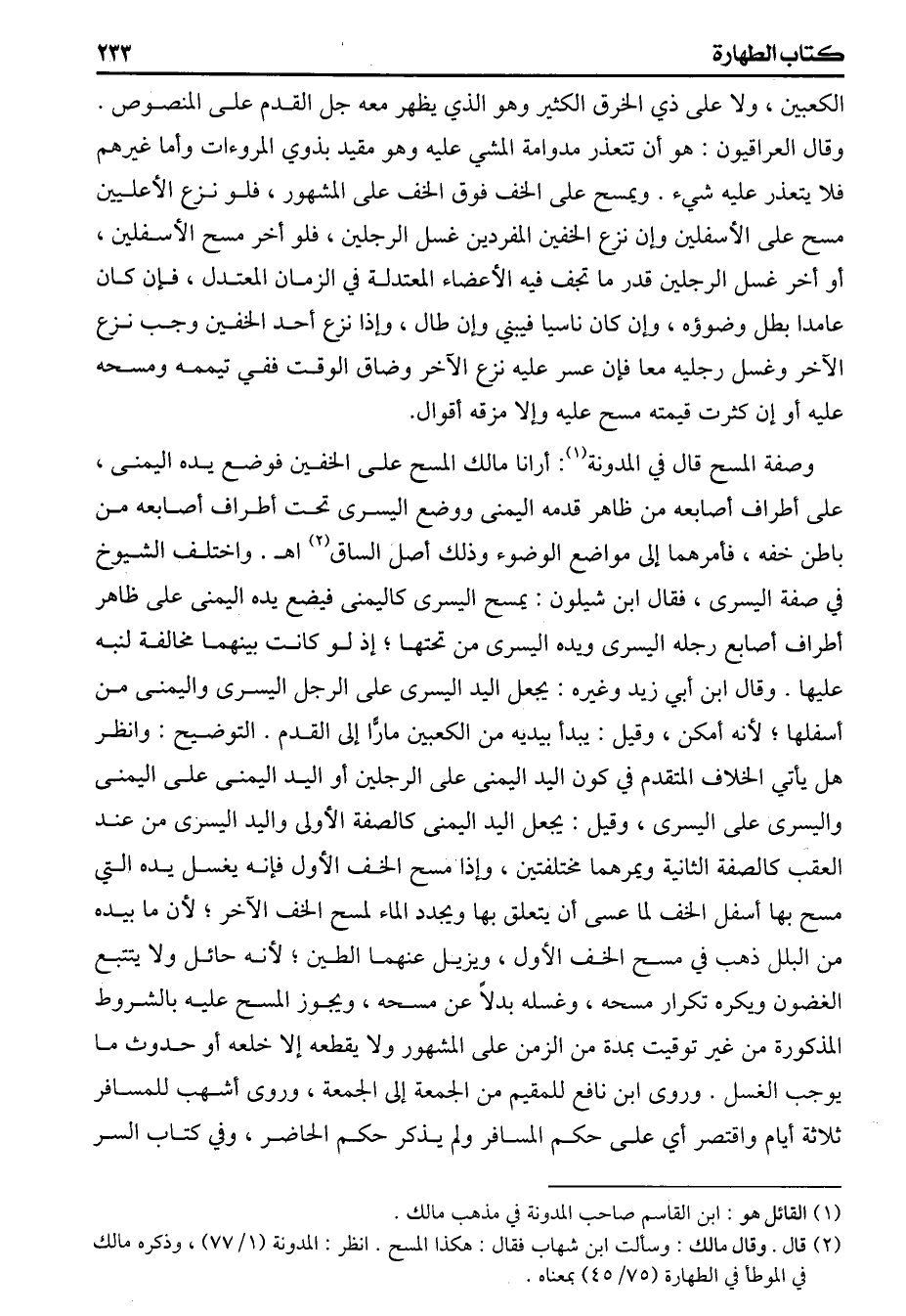 الكعبين ولا على ذي الخرق الكثير وهو الذي يظهر معه جل القدم على المنصوص وقال العراقيون هو أن تتعذر مدوامة المشي عليه وهو مقيد بذوي المروآت وأما غيرهم فلا يتعذر عليه شيء ويمسح على الخف فوق الخف على المشهور فلو نزع الأعليين مسح على الأسفلين وإن نزع الخفين المفردين غسل الرجلين فلو أخر مسح الأسفلين ولو أخر غسل الرجلين قدر ما تجف فيه الأعضاء المعتدلة في الزمان المعتدل فإن كان عامدا بطل وضوؤه وإن كان ناسيا فيبني وإن طال وإذا نزع أحد الخفين وجب نزع الآخر وغسل رجليه معا فإن عسر عليه نزع الآخر وضاق الوقت ففي تيممه ومسحه عليه أو إن كثرت قيمته مسح عليه وإلا مزقه أقوال. وصفة المسح قال في المدونة أرانا مالك المسح على الخفين فوضع يده اليمنى على أطراف أصابعه من ظاهر قدمه اليمنى ووضع اليسرى تحت أطراف أصابعه من باطن خفه فأمرهما إلى مواضع الوضوء وذلك أصل الساق اهـ واختلف الشيوخ في صفة اليسرى فقال ابن شيلون يمسح اليسرى كاليمنى فيضع يده اليمنى على ظاهر أطراف أصابع رجله اليسرى ويده اليسرى من تحتها إذ لو كانت بينهما مخالفة لنبه عليها وقالابن ابي زيدوغيره يجعل اليد اليسرى على الرجل اليسرى واليمنى من أسفلها لأنه أمكن وقيل يبدأ بيديه من الكعبين مارا إلى القدم التوضيح وانظر هل يأتي الخلاف المتقدم في كون اليد اليمنى على الرجلين أو اليد اليمنى على اليمنى واليسرى على اليسرى وقيل يجعل اليد اليمنى كالصفة الأولى واليد اليسرى من عند العقب كالصفة الثانية ويمرهما مختلفتين وإذا مسح الخف الأول فإنه يغسل يده التي مسح بها أسفل الخف لما عسى أن يتعلق بها ويجدد الماء لمسح الخف الآخر لأن ما بيده من البلل ذهب في مسح الخف الأول ويزيل عنهما الطين لأنه حائل ولا يتتبع الغضون ويكره تكرار مسحه وغسله بدلاً عن مسحه ويجوز المسح عليه بالشروط المذكورة من غير توقيت بمدة من الزمن على المشهور ولا يقطعه إلا خلعه أوحدوث ما يوجب الغسل وروى ابن نافع للمقيم من الجمعة إلى الجمعة وروى أشهب للمسافر ثلاثة أيام واقتصر أي على حكم المسافر ولم يذكر حكم الحاضر وفي كتاب السر