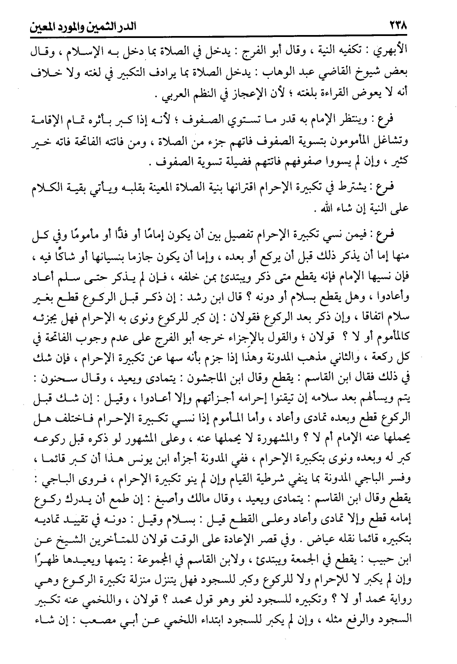 فيمن نسي تكبيرة الإحرام تفصيل بين أن يكون إماما أو فذا أو مأموما وفي كل منها إما أن يذكر ذلك قبل أن يركع أو بعده وإما أن يكون جازما بنسيانها أو شاكا فيه فإن نسيها الإمام فإنه يقطع متى ذكر ويبتديء بمن خلفه إن لم يذكر حتى سلم أعاد وأعادوا وهل يقطع بسلام أو دونه قال ابن رشد إن ذكر قبل الركوع قطع بغير سلام اتفاقا وإن ذكر بعد الركوع فقولان إن كبر للركوع ونوى به الإحرام فهل يجزئه كالمأموم أو لا قولان والقول بالإِجزاء خرجه أبو الفرج على عدم وجوب الفاتحة في كل ركعة والثاني مذهب المدونة وهذا إذا جزم بأنه سها عن تكبيرة الإحرام فإن شك في ذلك فقال ابن القاسم يقطع وقال ابن الماجشون يتمادى ويعيد وقال سحنون يتم ويسألهم بعد سلامه إن تيقنوا إحرامه أجزأتهم وإلا أعادوا وقيل إن شك قبل الركوع قطع وبعده تمادى وأعاد وأما المأموم إذا نسي تكبيرة الإحرام فاختلف هل يحملها عنه الإمام أم لا والمشهورة لا يحملها عنه وعلى المشهور لو ذكره قبل ركوعه كبر له وبعده ونوى بتكبيرة الإحرام ففي المدونة أجزأه ابن يونس هذا أن كبر قائما وفسر الباجي المدونة بما ينفي شرطية القيام وإن لم ينو تكبيرة الإحرام فروى الباجي يقطع وقال ابن القاسم يتمادى ويعيد وقال مالك وأصبغ أن طمع أن يدرك ركوع إمامه قطع وإلا تمادى وأعاد وعلى القطع قيل بسلام وقيل دونه في تقييد تماديه بتكبيرة قائما نقله عياض وفي قصر الإعادة على الوقت قولان للمتأخرين الشيخ عن ابن حبيب يقطع في الجمعة ويبتديء ولـ ابن القاسم في المجموعة يتمها ويعيدها ظهرر وإن لم يكبر لا للإحرام ولا للركوع وكبر للسجود فهل يتنزل منزلة تكبيرة الركوع وهي رواية محمد أو لاً وتكبيره للسجود لغو وهو قول محمد قولان واللخمي عنه تكبير السجود والرفع مثله وإن لم يكبر للسجود ابتداء اللخمي عن أبي مصعب إن شاء