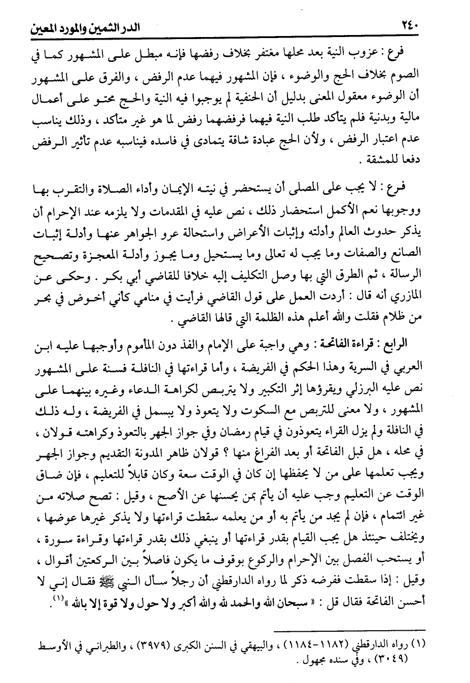 لا يجب على المصلى أن يستحضر في نيته الإيمان وأداء الصلاة والتقرب بها ووجوبها نعم الأكمل استحضار ذلك نص عليه في المقدمات ولا يلزمه عند الإحرام أن يذكر حدوث العالم وأدلته وإثبات الأعراض واستحالة عن الجواهر عنها وأدلة إثبات الصانع والصفات وما يجب له تعالى وما يستحيل وما يجوز أدلة المعجزة وتصحيح الرسالة ثم الطرق التي بها وصل التكليف إليه خلافا لـ لقاضي أبي بكر وحكى عنالمازريأنه قال أردت العمل على قولالقاضي فرأيت في منامي كأني أخوض في بحر من ظلام فقلت والله أعلم هذه الظلمة التي قالها القاضي (الرابع قراءة الفاتحة) وهي واجبة على الإمام والفذ دون المأموم وأوجبها عليه ابن العربي في السرية وهذا الحكم في الفريضة وأما قرائتها في النافلة فسنة على المشهور نص عليه البرزلي ويقرؤها أثر التكبير ولا يتربص لكراهة الدعاء وغيره بينهما على المشهور ولا معنى للتربص مع السكوت ولا يتعوذ ولا يبسمل في الفريضة وله ذلك في النافلة ولم يزل القراء يتعوذون في قيام رمضان وفي جواز الجهر بالتعوذ وكراهته قولان في محله قبل الفاتحة أو بعد الفراغ منها قولان ظاهر المدونة التقديم وجواز الجهر ويجب تعلمها على من لا يحفظها إن كان في الوقت سعة وكان قابلاً للتعليم فإن ضاق الوقت عن التعليم وجب عليه أن يأتم بمن يحسنها عن الأصح وقيل تصح صلاته من غير ائتمام فإن لم يجد من يأتم به أو من يعلمه سقطت قرائتها ولا يذكر غيرها عوضها ويختلف حينئذ هل يجب القيام بقدر قراءتها أو ينبغي ذلك بقدر قراءتها وقراءة سورة أو يستحب الفل بين الإحرام والركوع بوقوف ما يكون فاصلاً بين الركعتين أقوال وقيل إذا سقطت ففرضه ذكر لما رواه الدارقطني «أن رجلاً سأل النبي فقال إني لا أحسن الفاتحة فقال قل سبحان الله والحمد لله والله أكبر ولا حول ولا قوة إلا بالله»