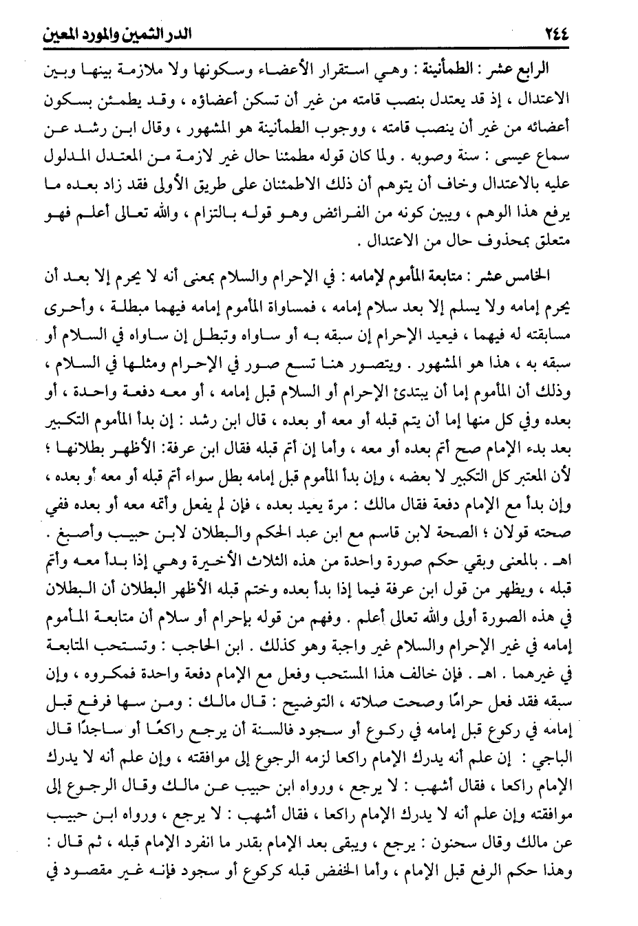 (الرابع عشر الطمأنينة) وهي استقرار الأعضاء وسكونها ولا ملازمة بينها وبين الاعتدال إذ قد يعتدل بنصب قامته من غير أن تسكن أعضاؤه وقد يطمئن بسكون أعضائه من غير أن ينصب قامته ووجوب الطمأنينة هو المشهور وقال ابن رشد عن سماع عيسى سنة وصوبه ولما كان قوله مطمئنا حال غير لازمة من المعتدل المدلول عليه بالاعتدال وخاف أن يتوهم أن ذلك الاطمئنان على طريقي الأولى فقد زاد بعده ما يرفع هذا الوهم ويبين كونه من الفرائض وهو قوله بالتزام والله تعالى أعلم فهو متعلق بمحذوف حال من الاعتدال (الخامس عشر متابعة المأموم لإمامه) في الإحرام والسلام بمعنى أنه لا يحرم إلا بعد أن يحرم إمامه ولا يسلم إلا بعد سلام إمامه فمساواة المأموم إمامه فيهما مبطلة وأحرى مسابقته له فيهما فيعيد الإحرام إن سبقه به أو ساواه وتبطل إن ساواه في السلام أو سبقه به وهذا هو المشهور ويتصور هنا تسع صور في الإحرام ومثلها في السلام وذلك أن المأموم إما أن يبتدىء الإحرام أو السلام قبل إمامه أو معه دفعة واحدة أو بعده وفي كل منها إما أن يتم قبله أو معه أو بعده قال ابن رشد إن بدأ المأموم التكبير بعد بدء الإمام صح أتم بعده أو معه وأما إن أتم قبله فقال ابن عرفة الأظهر بطلانها لأن المعتبر كل التكبير لا بعضه وإن بدأ المأموم قبل إمامه بطل سواء أتم قبله أو معه أو بعده وإن بدأ مع الإمام دفعة فقالمالك مرة يعيد بعده فإن لم يفعل وأتمه معه أو بعده ففي صحته قولان الصحة لابن قاسم معابن عبد الحكم والبطلان لابن حبيب وأصبغ اهـ بالمعنى وبقي حكم صورة واحدة من هذه الثلاث الأخيرة وهي إذا بدأ معه وأتم قبله ويظهر من قول ابن عرفة فيما إذا بدأ بعده وختم قبله الأظهر البطلان أن البطلان في هذه الصورة أولى والله تعالى أعلم وفهم من قوله إحرام أو سلام أن متابعة المأموم إمامه في غير الإحرام والسلام غير واجبة وهو كذلك ابن الحاجب وتستحب المتابعة في غيرهما اهـ فإن خالف هذا المستحب وفعل مع الإمام دفعة واحدة فمكروه وإن سبقه فقد فعل صلاة التوضيح قال مالك ومن سها فرفع قبل إمامه في ركوع قبل إمامه في ركوع أو سجود فالسنة أن يرجع راكعا أو ساجدا قال الباجي إن علم أنه يدرك الإمام راكعا لزمه الرجوع إلى موافقته وإن علم أنه لا يدرك الإمام راكعا فقال أشهب لا يرجع ورواه ابن حبيب عن مالك وقال الرجوع إلى موافقته وإن علم أنه لا يدرك الإمام راكعا فقال أشهب لا يرجع ورواه ابن حبيب عن مالك وقال سحنون يرجع ويبقى بعد الإمام بقدر ما انفرد الإمام قبله ثم قال وهذا حكم الرفع قبل الإمام وأما الخفض قبله كركوع أو سجود فإنه غير مقصود في