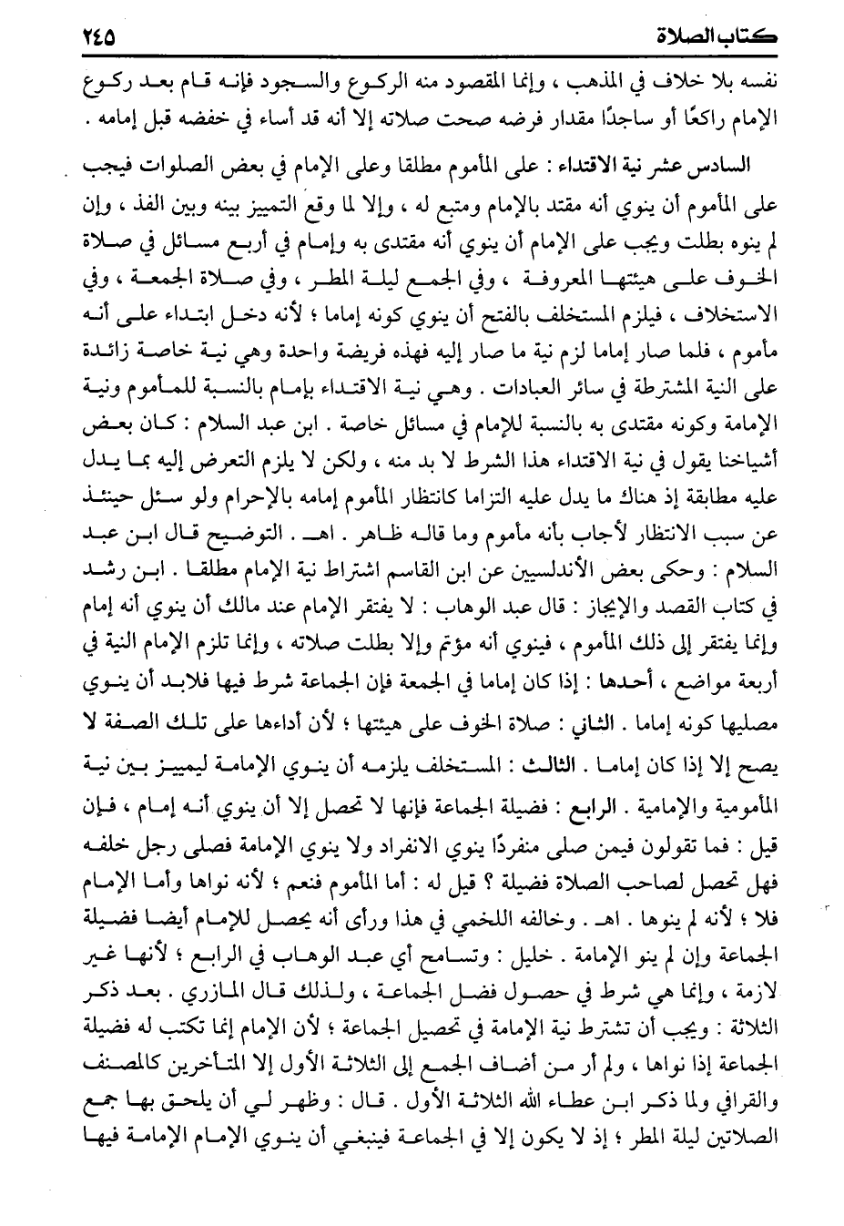 نفسه جلا خلاف في المذهب وإنماالمقصود منه الركوع والسجود فإنه قام بعد ركوع الإمام راكعا أو ساجدا مقدار فرضه صحت صلاته إلا أنه قد أساء في خفضه قبل إمامه (السادس عشر نية الاقتداء) على المأموم مطلقا وعلى» الإمام في بعض الصلوات فيجب على المأموم أو ينوي أنه مقتد بالإمام ومتبع له وإلا لما وقع التمييز بينه وبين الفذ وان لم ينوه بطلت ويجب على الإمام أن ينوي أنه مقتدى به وإمام في أربع مسائل في صلاة الخوف على هيئتها المعروفة وفي الجمع ليلة المطر وفي صلاة الجمعة وفي الاستخلاف فيلزم المستخلف بالفتح أن ينوي كونه إماما لأنه دخل ابتداء على أنه مأموم فلما صار إماما لزم نية ما صار إليه فهذه فريضة واحدة وهي نية خاصة زائدة على النية المشترطة في سائر العبادات وهي نية الاقتداء بإمام بالنسبة للمأموم ونية الإمامة وكونه مقتدى به بالنسبة للإمام في مسائل خاصة ابن عبد السلام كان بعض أشياخنا يقول في نية الاقتداء هذا الشرط لابد منه ولكن لا يلزم التعرض إليه بما يدل عليه مطابقة إذ هناك ما يدل عليه التزاما كانتظار المأموم أمامه بالإحرام ولو سئل حينئذ عن سبب الانتظار لأجاب بأنه مأموم وما قاله ظاهر اهـ
