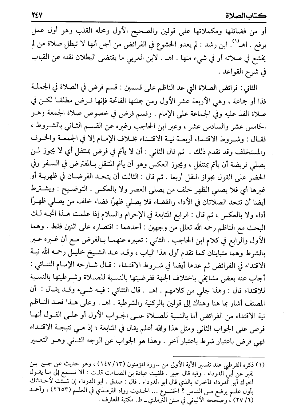ابن رشد لم يعدو الخشوع في الفرائض من أجل أنها لا تبطل صلاة من لم يخشع في صلاته أو في شيء منها اهـ لـ ابن العربي ما يقتضى البطلان نقله عن القباب في شرح القواعد (الثاني) فرائض الصلاة التي عد الناظم على قسمين قسم فرض في الصلاة في الجملة فذا أو جماعة وهي الأربعة عشر الأول ومن جملتها الفاتحة فإنها فرض مطلقا لكن في صلاة الفذ عليه وفي الجماعة على الإمام وقسم فرض في خصوص صلاة الجمعة وهو الخامس عشر والسادس عشر وعبر ابن الحاجب وغيره عن القسم الثاني بالشروط فقال وشروط الاقتداء أربعة نية الاقتداء بخلاف الإمام إلا في الجمعة والخوف والمستخلف وقد تقدم ذلك ثم قال الثاني أن لا يأتم في فرض بمتنقل أي لا يجوز لمن يصلي فريضة أن يأتم بمتنقل ويجوز العكس وهو أن يأتم المتنقل بالمفترض في السفر وفي الحضر على القول بجواز النفل أربعا ثم قال الثالث أن يتحد الفرضان في ظهرية أو غيرها أي فلا يصلي الظهر خلف من يصلي العصر ولا بالعكس التوضيح ويشترط أيضا أن تتحد الصلاتان في الأداء والقضاء فلا يصلي ظهرا قضاء خلف من يصلي ظهرا أداء ولا بالعكس ثم قال الرابع المتابعة في الإحرام والسلام إذا علمت هذا اتجه لك البحث مع الناظم رحمه الله تعالى من وجهين أحدهما اقتصاره على اثنين فقط وهما الأول والرابع في كلام ابن الحاجب الثاني تعبيره عنهما بالفرض مع أن غيره عبر بالشرط وهما متاينان كما تقدم أول هذا الباب وقد عد الشيخ خليل رحمه الله نية الاقتداء في الفرائض ثم عدها أيضا في شروط الاقتداء قال شارحه الإمام التتائي أجاب عنه بعض مشايخي باختلاف الجهة ففريضتها بالنسبة للصلاة وشرطيتها بالنسبة للاقتداء قال وهذا جلي من كلامهم اهـ