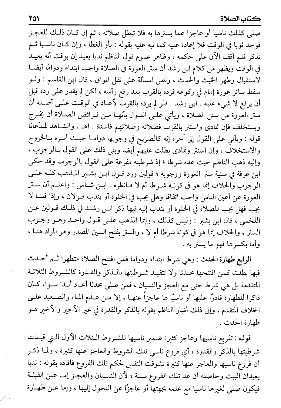 الرابع طهارة الحدث وهي شرط ابتداء ودواما فمن افتتح الصلاة متطهرا ثم أحدث فيها بطلت كمن افتتحها محدثا ولا تتقيد شرطيتها بالذكر والقدرة كالشروط الثلاثة المتقدمة بل هي شرط حتى مع العجز والنسيان فمن صلى محدثا أعاد أبدا سواء كان ذاكرا للطهارة قادرا عليها أو ناسيا لها عاجز عنها إلا من عدم الماء والصعيد على الخلاف المتقدم وإلى ذلك أشار الناظم بقوله بالذكر والقدرة في غير الأخير والأخير هو طهارة الحدث