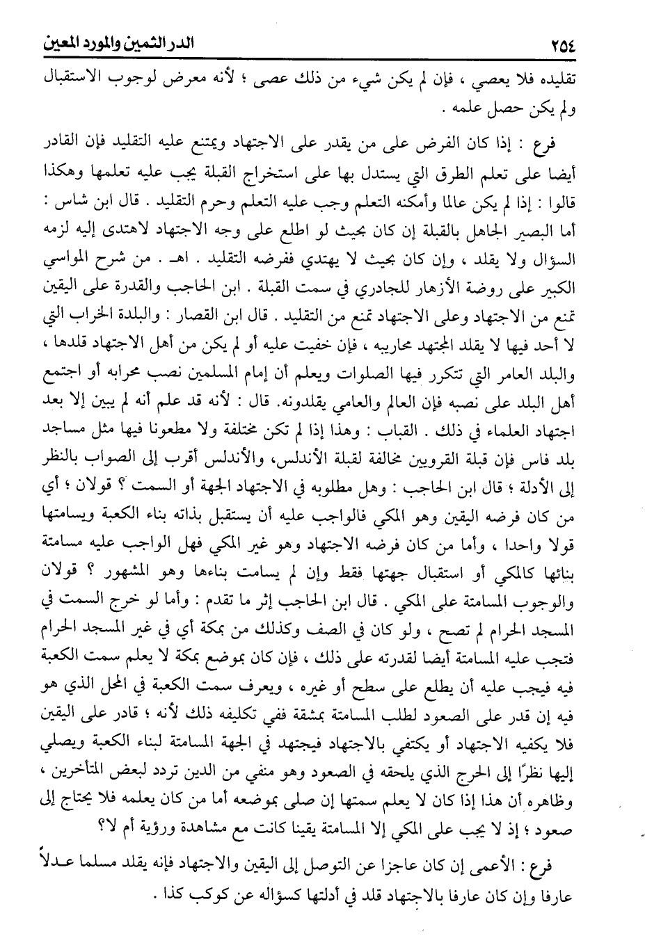 ابن الحاجب والقدرة على اليقين تمنع من الاجتهاد وعلى الاجتهاد تمنع من التقليد، قال ابن القصار: والبلدة الخراب التي لا أحد فيها لا يقلد المجتهد محاريبه. فإن خفيت عليه أو لم يكن من أهل الاجتهاد قلدها والبلد العامر التي تتكرر فيها الصلوات ويعلم أن إمام المسلمين نصب محرابه أو اجتمع أهل البلد على نصبه إن العالم والعامي يقلدونه. قال لأنه قد علم أنه لم يبين إلا بعد اجتهاد العلماء في ذلك القباب وهذا إذا لم تكن مختلفة ولا مطعونا فيها مثل مساجد بلد فاس فإن قبلة القرويين مخالفة لقبلة الأندلس، والأندلس أقرب إلى الصواب بالنظر إلى الأدلة قال ابن الحاجب: وهل مطلوبه في الاجتهاد الجهة أو السمت قولان أي من كان فرضه اليقين وهو المكي فالواجب عليه أن يستقبل بذاته بناء الكعبة ويسامتها قولا واحدا وأما من كان فرضه الاجتهاد وهو غير المكي فهل الواجب عليه مسامتة بنائها كالمكي أو استقبال جهتها فقط لأإن لم يسامت بناءها وهو المشهور قولان والوجوب المسامتة على المكي ابن الحاجب. أثر ما تقدم وأما لو خرج السمت في المسجد الحرام لم تصح ولو لم تصح ولو كان في الصف وكذلك من بمكة أي في غير المسجد الحرام فتجب عليه المسامتة أيضا لقدرته على ذلك إن كان بموضع بمكة لا يعلم سمت الكعبة فيه فيجب عليه أن يطلع على سطح أو غيره ويعرف سمت الكعبة في المحل الذي هو فيه إن قدر على الصعود لطلب المسامتة بمشقة ففي تكليفه ذلك لأنه قادر على اليقين فلا يكفيه الاجتهاد أو يكتفي بالاجتهاد فيجتهد في الجهة المسامتة لبناء الكعبة ويصلي إليها نظر إلى الحرج الذي يلحقه في الصعود وهو منفي من الدين تردد لبعض المتأخرين وظاهره أن هذا إذا كان لا يعلم سمتها إن صلى بموضعه أما من كان يعلمه فلا يحتاج إلى صعود إذ لا يجب على المكي إلا المسامتة يقينا كانت مع مشاهدة ورؤية أم لا؟