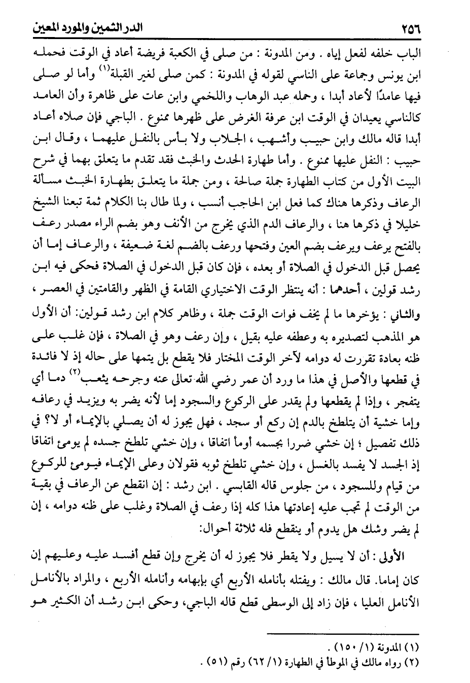 الباب خلفه لفعل إياه، ومن المدونة من صلى في الكعبة فريضة أعاد في الوقت فحمله ابن يونس وجماعة على الناسي لقوله في المدونة كمن صلى لغير القبلة وأما لو صلى فيها عامدا لأعاد أبدا وحمله عبد الوهاب واللخمي وابن عات على طاهرة وأن العامد كالناسي يعيدان في الوقت/ ابن عرفة الغرض على ظهرها ممنوع/الباجي فإن صلاه أعاد أبدا قاله مالك وابن حبيب وأشهب، الجلاب ولا بأس بالنفل عليهما وقال ابن حبيب النفل عليها ممنوع وأما طهارة الحدث والخبث فقد تقدم ما يتعلق بهما في شرح البيت الأول من كتاب الطهارة جملة صالحة ومن جملة ما يتعلق بطهارة الخبث مسألة الرعاف وذكرها هناك كما فعل ابن الحاجب أنسب ولما طال بنا الكلام ثمة تبعنا الشيخ خليلا في ذكرها هنا والرعاف الدم الذي يخرج من الأنف وهو بضم الراء مصدر رعف بالفتح يرعف ويرعف بضم العين وفتحها ورعف بالضم لغة ضعيفة والرعاف إما أن يحصل قبل الدخول في الصلاة أو بعده إن كان قبل الدخول في الصلاة فحكى فيه ابن رشد قولين أحدهما أنه ينتظر الوقت الاختياري القامة في الظهر والقامتين في العصر والثاني يؤخرها ما لم يخف فوات الوقت جملة وظاهر كلام ابن رشد قولين: أن الأول هو المذهب لتصديره به وعطفه عليه بقيل، وإن رعف وهو في الصلاة فإن غلب على ظنه بعادة تقررت له دوامه لآخر الوقت المختار فلا يقطع بل يتمها على حاله إذ لا فائدة في قطعها والأصل في هذا ما ورد أن عمر رضي الله تعالى عنه وجرحه يثعب دما أي يتفجر وإذا لم يقطعها ولم يقدر على الركوع والسجود إما لأنه يضر به ويزيد في رعافه وإما خشية أن يتلطخ بالدم إن ركع أو سجد فهل يجوز له أن يصلي بالإيماء أو لا؟ في ذلك تفصيل إن خشي ضررا بجسمه أومأ اتفاقا وإن خشي تلطخ جسده لم يومىء اتفاقا إذ الجسد لايفسد بالغسل وإن خشي تلطخ ثوبه فقولان وعلى الإيماء فيوميء للركوع من قيام وللسجود من جلوس قالهالقابسي/ابن رشد إن انقطع عن الرعاف في بقية من الوقت لم تجب عليه إعادتها هذا كله إذا رعف في الصلاة وغلب على ظنه دوامه إن لم يضر وشك هل يدوم أو ينقطع فله ثلاثة أحوال