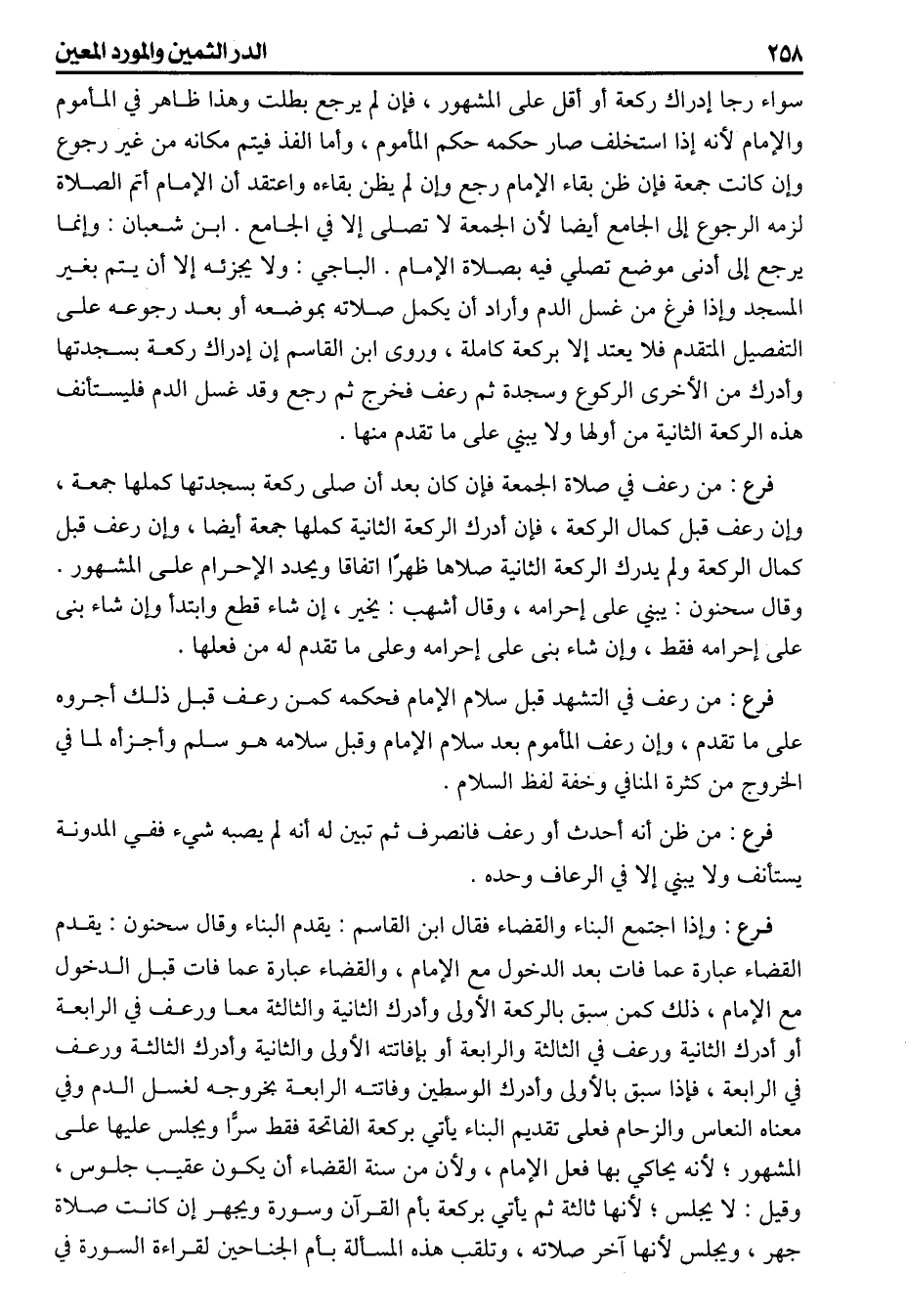 (فرع) وإذا اجتمع البناء والقضاء فقال ابن القاسم يقدم البناء وقال سحنون يقدم القضاء، عبارة عما فات بعد الدخول مع الإمام والقضاء عبارة عما فات قبل الدخول مع الإمام وذلك كمن سبق بالركعة الأولى وأدرك الثانية والثالثة معا ورعف في الرابعة أو أدرك الثانية ورعف في الثالثة والرابعة أو بإفاتته الأولى والثانية وأدرك الثالثة ورعف في الرابعة فإذا سبق بالأولى وأدرك الوسطين وفاتته الرابعة بخروجه لغسل الدم وفي معناه النعاس والزحام فعلى تقديم البناء يأتي بركعة الفاتحة فقط سرا ويجلس عليها على المشهور لأنه يحاكي بها فعل الإمام ولأن من سنة القضاء أن يكون عقيب جلوس وقيل لا يجلس لأنها ثالثة ثم يأتي بركعة بأم القرآن وسورة ويجهر إن كانت صلاة جهر ويجلس لأنها آخر صلاته وتلقب هذه المسألة بأم الجناحين لقراءة السورة في